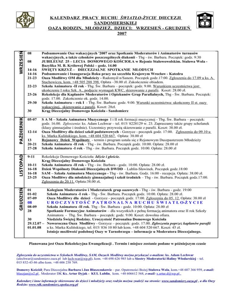 WRZESIEŃ KALENDARZ PRACY RUCHU ŚWIATŁO-ŻYCIE DIECEZJI SANDOMIERSKIEJ OAZA RODZIN, MŁODZIEŻ, DZIECI: WRZESIEŃ - GRUDZIEŃ 2007 08 08 14-16 14-16 21-23 22-23 23-26 29-30 PAŹDIERNIK 05-07 LISTOPAD 9-11 GRUDZIEŃ 30 Podsumowanie Oaz wakacyjnych '2007 oraz Spotkanie Moderatorów i Animatorów turnusów wakacyjnych, a także członków poszczególnych diakonii - Tbg - św. Barbara. Początek: godz. 9:30 JUBILEUSZ 25 – LECIA DOMOWEGO KOŚCIOŁA w Rejonie Stalowowolskim. Stalowa Wola Bazylika M. B. Królowej Polski – godz. 14.00 ŚWIĘTY KRZYŻ – DIECEZJALNE SPOTKANIE MŁODYCH Podsumowanie i Inauguracja Roku pracy na szczeblu Krajowym Wrocław - Katedra Oaza Modlitwy OM dla Młodzieży - Radomyśl n/Sanem. Początek godz.17:00. Zgłoszenia do 17.09 u ks. A. Stachowicza, kom. +48 505 288 398. Opłata –38.00 zł. Zakończenie obiadem. Szkoła Animatora -II rok - Tbg. Św. Barbara – początek: godz. 9.00. Warunkiem uczestnictwa jest: ukończenie I roku Szk. A., podjęcie wymagań KWC, skierowanie z parafii. Koszt: 28.00 zł. Rekolekcje dla Kapłanów Moderatorów i Opiekunów Grup Parafialnych, Tbg - Św. Barbara. Początek: godz. 17.00. Zakończenie ok. godz. 14.00. Szkoła Animatora – rok I - Tbg. Św. Barbara: godz. 9.00. Warunki uczestnictwa: ukończony II st. oazy wakacyjnej, skierowanie z parafii. Koszt: 28zł. Krąg Diecezjalny Domowego Kościoła - Sandomierz 01 01-02 07-09 Kolegium Moderatorów i Moderatorek grup oazowych - Tbg - św. Barbara - godz. 19:00 Szkoła Animatora -I rok - Tbg - Św. Barbara. Początek godz. 10:00. Opłata: 28.00 zł. Oaza Modlitwy dla dzieci - Gorzyce - początek godz. 17:00. Zgłoszenia do 05. 12. Opłata: 38.00 zł 08 U R O C Z Y S T O Ś Ć P A T R O N A L N A R U C H U Ś W I A T Ł O-Ż Y C I E 12-14 13 20-21 27-28 10-11 16-18 16-18 23-25 S A M – Szkoła Animatora Muzycznego I i II rok formacji muzycznej - Tbg. Św. Barbara – początek: godz. 16.00. Zgłoszenia: ks. Adam Lechwar – tel. 015/ 8228129 w. 23. Zapraszamy także grupy scholanek (klasy gimnazjalne i średnie). Uczestnicy przywożą skierowanie z parafii. Koszt: 38.00 zł. Oaza Modlitwy dla dzieci szkół podstawowych - Gorzyce - początek godz. 17:00. Zgłoszenia do 09.10 u ks. Marka Kulińskiego, kom. +48 604 520 667. Opłata: 38.00 zł Rejonowy Dzień Wspólnoty - termin i program ustala się z Rejonowym Duszpasterzem Młodzieży Szkoła Animatora -II rok - Tbg - św. Barbara. Początek godz. 10:00. Opłata: 28.00 zł Szkoła Animatora -I rok - Tbg - św. Barbara. Początek godz. 10:00. Opłata: 28.00 zł Rekolekcje Domowego Kościoła: Idźcie i głoście. Krąg Diecezjalny Domowego Kościoła Szkoła Animatora -II rok - Tbg - św. Barbara - godz. 10:00. Opłata: 28.00 zł. Dzień Wspólnoty Diakonii Diecezjalnych DWDD – Lublin-Sławinek. Początek godz.18:00 SAM – Szkoła Animatora Muzycznego - Tbg - św. Barbara. Godz. 16:00 - recepcja. Opłata: 38.00 zł. Oaza Modlitwy dla młodzieży gimnazjalnej i szkół średnich – Tbg - św. Barbara. Początek godz.17:00. Zgłoszenia do 20.11. Opłata:38.00 zł. 08-09 28 Szkoła Animatora -II rok. Tbg - Św. Barbara - godz. 10:00. Opłata: 28.00 zł Spotkanie Formacyjne Animatorów – dla wszystkich z pełną formacją animatora oraz II rok Szkoły Animatora - Tbg. Św. Barbara – początek: godz. 9.00. Koszt: dowolna ofiara. 30 Niedziela Świętej Rodziny. Uroczystość Patronalna Domowego Kościoła 29.12.07 – Noworoczna Oaza Modlitwy - Gorzyce – początek: godz. 17.00. Zgłoszenia poprzez kapłanów parafii 01.01.08 u ks. Marka Kulińskiego, tel. 015/ 836 10 80 lub kom. +48 604 520 667. Koszt: 45 zł. Istnieje możliwość podobnej Oazy w Tarnobrzegu – informacje u Moderatora Diecezjalnego. Planowana jest Oaza Rekolekcyjna Ewangelizacji . Termin i miejsce zostanie podane w późniejszym czasie Zgłoszenia do uczestnictwa w Szkołach Modlitwy, SAM, Oazach Modlitwy można przekazać e-mailem: ks. Adam Lechwar ([email protected] lub [email protected]), kom. +48 698 626 985 lub u Siostry Moderatorki Haliny Włodarskiej – tel. 015 832-43-86 albo kom. +48 606 238 769. Domowy Kościół: Para Diecezjalna Barbara i Jan Błaszczukowie – par. Opatrzności Bożej Stalowa Wola, kom.+48 607 366 959, e-mail: [email protected] . Moderator DK Ks. Artur Dyjak - KUL Lublin, kom. +48 606612 568, e-mail: [email protected] . Kalendarz i inne informacje skierowane do dzieci i młodzieży oraz rodzin można znaleźć na stronie: www.sandomierz.oaza.pl , a dla Oazy Rodzin: www.rdk.sandomierz.opoka.org.pl