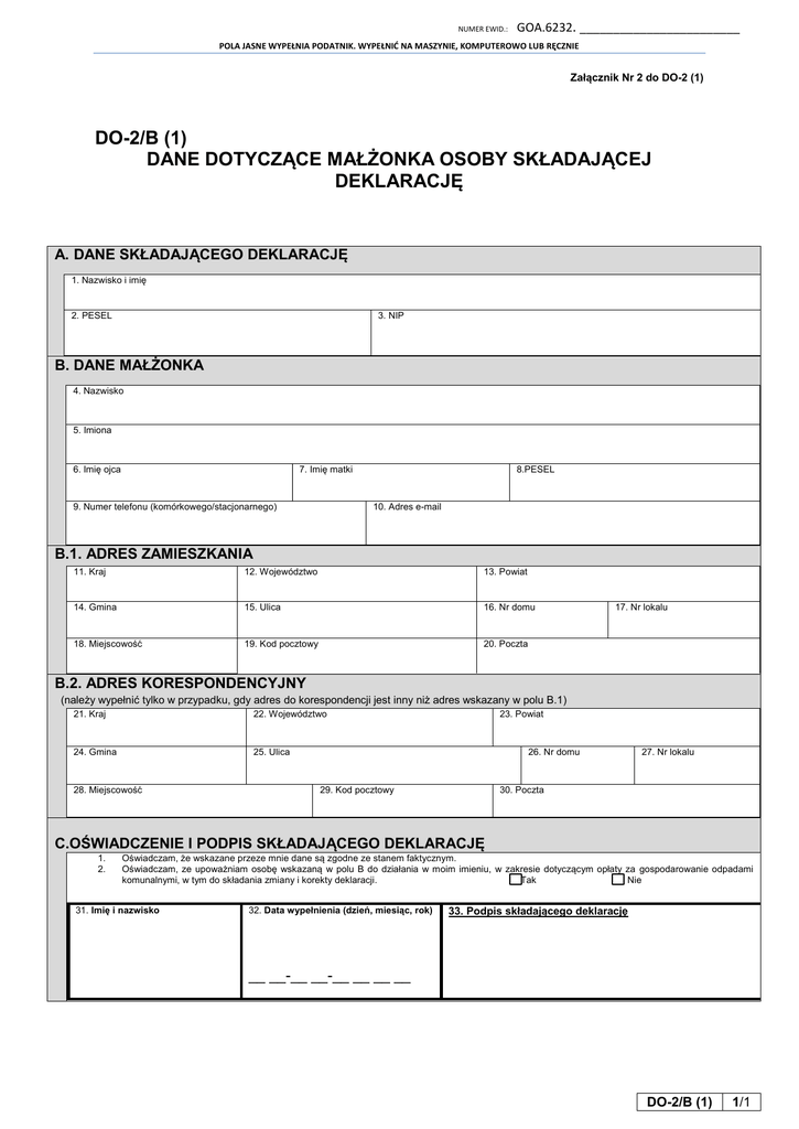 NUMER EWID.: GOA.6232. ________________________ POLA JASNE WYPEŁNIA PODATNIK. WYPEŁNIĆ NA MASZYNIE, KOMPUTEROWO LUB RĘCZNIE Załącznik Nr 2 do DO-2 (1) DO-2/B (1) DANE DOTYCZĄCE MAŁŻONKA OSOBY SKŁADAJĄCEJ DEKLARACJĘ A. DANE SKŁADAJĄCEGO DEKLARACJĘ 1. Nazwisko i imię 2. PESEL 3. NIP B. DANE MAŁŻONKA 4. Nazwisko 5. Imiona 6. Imię ojca 7. Imię matki 9. Numer telefonu (komórkowego/stacjonarnego) 8.PESEL 10. Adres e-mail B.1. ADRES ZAMIESZKANIA 11. Kraj 12. Województwo 13. Powiat 14. Gmina 15. Ulica 16. Nr domu 18. Miejscowość 19. Kod pocztowy 20. Poczta 17. Nr lokalu B.2. ADRES KORESPONDENCYJNY (należy wypełnić tylko w przypadku, gdy adres do korespondencji jest inny niż adres wskazany w polu B.1) 21. Kraj 22. Województwo 24. Gmina 25. Ulica 28. Miejscowość 23. Powiat 26. Nr domu 29. Kod pocztowy 27. Nr lokalu 30. Poczta C.OŚWIADCZENIE I PODPIS SKŁADAJĄCEGO DEKLARACJĘ 1. 2. Oświadczam, że wskazane przeze mnie dane są zgodne ze stanem faktycznym. Oświadczam, ze upoważniam osobę wskazaną w polu B do działania w moim imieniu, w zakresie dotyczącym opłaty za gospodarowanie odpadami komunalnymi, w tym do składania zmiany i korekty deklaracji. Tak Nie 31. Imię i nazwisko 32. Data wypełnienia (dzień, miesiąc, rok) 33. Podpis składającego deklarację __ __-__ __-__ __ __ __ DO-2/B (1) 1/1