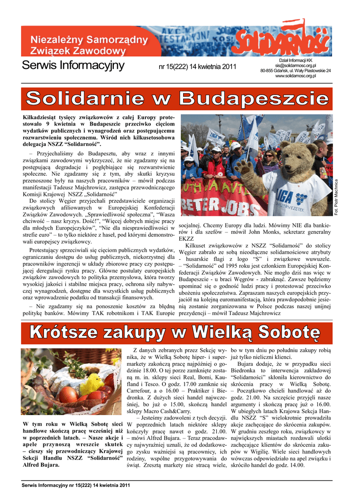 Serwis Informacyjny nr 15(222) 14 kwietnia 2011 Dział Informacji KK [email protected] 80-855 Gdańsk, ul. Wały Piastowskie 24 www.solidarnosc.org.pl Kilkadziesiąt tysięcy związkowców z całej Europy protestowało 9 kwietnia w Budapeszcie przeciwko cięciom wydatków publicznych i wynagrodzeń oraz postępującemu rozwarstwieniu społecznemu. Wśród nich kilkusetosobowa delegacja NSZZ “Solidarność”. Fot. Piotr Machnica – Przyjechaliśmy do Budapesztu, aby wraz z innymi związkami zawodowymi wykrzyczeć, że nie zgadzamy się na postępującą degradacje i pogłębiające się rozwarstwienie społeczne. Nie zgadzamy się z tym, aby skutki kryzysu przenoszone były na naszych pracowników – mówił podczas manifestacji Tadeusz Majchrowicz, zastępca przewodniczącego Komisji Krajowej NSZZ „Solidarność” Do stolicy Węgier przyjechali przedstawiciele organizacji związkowych afiliowanych w Europejskiej Konfederacji Związków Zawodowych. „Sprawiedliwość społeczna”, “Wasza chciwość – nasz kryzys. Dość!”, “Więcej dobrych miejsc pracy dla młodych Europejczyków”, “Nie dla niesprawiedliwości w strefie euro” – to tylko niektóre z haseł, pod którymi demonstrowali europejscy związkowcy. Protestujący sprzeciwiali się cięciom publicznych wydatków, ograniczaniu dostępu do usług publicznych, niekorzystnej dla pracowników ingerencji w układy zbiorowe pracy czy postępującej deregulacji rynku pracy. Główne postulaty europejskich związków zawodowych to polityka przemysłowa, która tworzy wysokiej jakości i stabilne miejsca pracy, ochrona siły nabywczej wynagrodzeń, dostępne dla wszystkich usług publicznych oraz wprowadzenie podatku od transakcji finansowych. socjalnej. Chcemy Europy dla ludzi. Mówimy NIE dla bankierów i dla szefów – mówił John Monks, sekretarz generalny EKZZ Kilkuset związkowców z NSZZ “Solidarność” do stolicy Węgier zabrało ze sobą nieodłączne solidarnościowe atrybuty - husarskie flagi z logo “S” i związkowe wuwuzele. – “Solidarność” od 1995 roku jest członkiem Europejskiej Konfederacji Związków Zawodowych. Nie mogło dziś nas więc w Budapeszcie - u braci Węgrów - zabraknąć. Zawsze będziemy upominać się o godność ludzi pracy i protestować przeciwko ubożeniu społeczeństwa. Zapraszam naszych europejskich przyjaciół na kolejną euromanifestacją, która prawdopodobnie jesie– Nie zgadzamy się na ponoszenie kosztów za błędną nią zostanie zorganizowana w Polsce podczas naszej unijnej politykę banków. Mówimy TAK robotnikom i TAK Europie prezydencji – mówił Tadeusz Majchrowicz W tym roku w Wielką Sobotę sieci handlowe skończą pracę wcześniej niż w poprzednich latach. – Nasze akcje i apele przynoszą wreszcie skutek – cieszy się przewodniczący Krajowej Sekcji Handlu NSZZ “Solidarność” Alfred Bujara. Z danych zebranych przez Sekcję wynika, że w Wielką Sobotę hiper- i supermarkety zakończą pracę najpóźniej o godzinie 18.00. O tej porze zamknięte zostaną m. in. sklepy sieci Real, Bomi, Kaufland i Tesco. O godz. 17.00 zamknie się Carrefour, a o 16.00 – Praktiker i Biedronka. Z dużych sieci handel najwcześniej, bo już o 15.00, skończą handel sklepy Macro Cash&Carry. – Jesteśmy zadowoleni z tych decyzji. W poprzednich latach niektóre sklepy kończyły pracę nawet o godz. 21.00. – mówi Alfred Bujara. – Teraz pracodawcy najwyraźniej uznali, że od dodatkowego zysku ważniejsi są pracownicy, ich rodziny, wspólne przygotowywania do świąt. Zresztą markety nie stracą wiele, Serwis Informacyjny nr 15(222) 14 kwietnia 2011 bo w tym dniu po południu zakupy robią już tylko nieliczni klienci. Bujara dodaje, że w przypadku sieci Biedronka to interwencja zakładowej “Solidarności” skłoniła kierownictwo do skrócenia pracy w Wielką Sobotę. – Początkowo chcieli handlować aż do godz. 21.00. Na szczęście przyjęli nasze argumenty i skończą pracę już o 16.00. W ubiegłych latach Krajowa Sekcja Handlu NSZZ “S” wielokrotnie prowadziła akcje zachęcające do skrócenia zakupów. W grudniu zeszłego roku, związkowcy w największych miastach rozdawali ulotki zachęcające klientów do skrócenia zakupów w Wigilię. Wiele sieci handlowych wówczas odpowiedziało na apel związku i skróciło handel do godz. 14.00. Agencja ochrony Globals, która na zlecenie szefa miejskiej spółki inwigilowała przewodniczącą związku, nie miała koncesji na usługi detektywistyczne. Dlatego minister spraw wewnętrznych i administracji – jako organ prowadzący rejestr działalności regulowanej w zakresie usług detektywistycznych – zawiadomił 4 kwietnia bydgoską prokuraturę o uzasadnionym podejrzeniu popełnienia przestępstwa polegającego na świadczeniu usług detektywistycznych przez tę agencję, pomimo nieposiadania przez nią niezbędnych pozwoleń. Do prokuratury trafiło też zawiadomienie o nieposiadaniu licencji detektywistycznej przez jednego z pracowników agencji, śledzącego Ewę Kozanecką. Ewa Kozanecka, szefowa „S” w Miejskich Wodociagach Sukces “Solidarności” w walce z nieuczciwymi pracodawcami, szykanującymi związkowców. Po interwencji szefa związku Piotra Dudy minister spraw wewnętrznych i administracji Jerzy Miller zdecydował o zawiadomieniu prokuratury w Bydgoszczy o popełnieniu przestępstwa przez agencję ochrony, która śledziła przewodniczącą organizacji zakładowej w tamtejszych Miejskich Wodociągach. Reakcja Ministerstwa Spraw Wewnętrznych i Administracji potwierdza opinię NSZZ “Solidarność”, że śledzenie Ewy Kozaneckiej, przewodniczącej „Solidarności” w Miejskich Wodociągach i Kanalizacji, było nielegalne. Interwencja Piotra Dudy przyniosła jeszcze jeden skutek. MSWiA zdecydowało też, że już w maju w firmie Globals rozpocznie się kontrola wykonywania przez ten podmiot usług w zakresie ochrony osób i mienia. – To co działo się