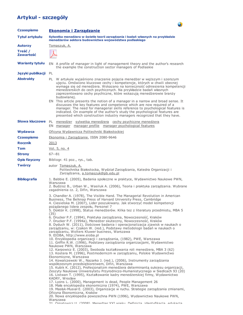 Artykuł - szczegóły Czasopismo Ekonomia i Zarządzanie Tytuł artykułu Sylwetka menedżera w świetle teorii zarządzania i badań własnych na przykładzie menedżerów sektora budownictwa województwa podlaskiego Autorzy Tomaszuk, A. Treść / Zawartość Warianty tytułu EN A profile of manager in light of management theory and the author’s research the example the construction sector managers of Podlaskie Języki publikacji PL Abstrakty PL Słowa kluczowe PL menedżer sylwetka menedżera cechy psychiczne menedżera EN manager manager profile manager psychological features Wydawca Oficyna Wydawnicza Politechniki Białostockiej Czasopismo Ekonomia i Zarządzanie, ISSN 2080-9646 Rocznik 2013 Tom Vol. 5, no. 4 Strony 67--81 W artykule wyjaśniono znaczenie pojęcia menedżer w węższym i szerszym ujęciu. Omówiono kluczowe cechy i kompetencje, których w chwili obecnej wymaga się od menedżera. Wskazano na konieczność odniesienia kompetencji menedżerskich do cech psychicznych. Na przykładzie badań własnych zaprezentowano cechy psychiczne, które wskazują menedżerowie branży budowlanej. EN This article presents the notion of a manager in a narrow and broad sense. It discusses the key features and competence which are now required of a manager. The need for managerial skills reference to psychological features is indicated. On example of the author’s study the psychological features are presented which construction industry managers recognized that they have. Opis fizyczny Bibliogr. 41 poz., rys., tab. Twórcy autor Tomaszuk, A. Politechnika Białostocka, Wydział Zarządzania, Katedra Organizacji i Zarządzania, [email protected] Bibliografia 1. Babbie E. (2005), Badania społeczne w praktyce, Wydawnictwo Naukowe PWN, Warszawa 2. Budzisz B., Urban W., Wasiluk A. (2006), Teoria i praktyka zarządzania. Wybrane zagadnienia cz. 2, Difin, Warszawa 3. Chandler A. (1978), The Visible Hand. The Managerial Revolution in American Business, The Belknap Press of Harvard University Press, Cambridge 4. Ciesielska M. (2007), Lider poszukiwany. Jak stworzyć model kompetencji pożądanego lidera zespołu, Personel 7 5. Doktór K. (1998), Status menedżerów. Kilka tez z literatury przedmiotu, MBA 5 (35) 6. Drucker P.F. (1994), Praktyka zarządzania, Nowoczesność, Kraków 7. Drucker P.F. (1994a), Menedżer skuteczny, Nowoczesność, Kraków 8. Dyduch W. (2011), Ilościowe badania i operacjonalizacja zjawisk w naukach o zarządzaniu, w: Czakon W. (red.), Podstawy metodologii badań w naukach o zarządzaniu, Wolters Kluwer business, Warszawa 9. EIOBA, http://www.eioba.pl 10. Encyklopedia organizacji i zarządzania, (1982), PWE, Warszawa 11. Griffin R.W. (1996), Podstawy zarządzania organizacjami, Wydawnictwo Naukowe PWN, Warszawa 12. Karpowicz E. (2003), Swoboda kształtowania roli menedżera, MBA 3 (62) 13. Kostera M. (1996), Postmodernizm w zarządzaniu, Polskie Wydawnictwo Ekonomiczne, Warszawa 14. Kowalczewski W., Nazarko J. (red.), (2006), Instrumenty zarządzania współczesnym przedsiębiorstwem, Difin, Warszawa 15. Kubik K. (2012), Profesjonalizm menedżera determinantą sukcesu organizacji, Zeszyty Naukowe Uniwersytetu Przyrodniczo-Humanistycznego w Siedlcach 93 (20) 16. Listwan T. (1995), Kształtowanie kadry menedżerskiej firmy, Wydawnictwo KADRY, Wrocław 17. Lyons L. (2000), Management is dead, People Management 26 18. Mała encyklopedia ekonomiczna (1974), PWE, Warszawa 19. Masłyk-Musiał E. (2003), Organizacje w ruchu. Strategie zarządzania zmianami, Oficyna Ekonomiczna, Kraków 20. Nowa encyklopedia powszechna PWN (1996), Wydawnictwo Naukowe PWN, Warszawa 21. Ornatowicz U. (2008), Menedżer XXI wieku. Definicja, identyfikacja, edukacja, 21. Ornatowicz U. (2008), Menedżer XXI wieku. Definicja, identyfikacja, edukacja, Wydawnictwo SGH, Warszawa 22. Penc J. (1997), Leksykon biznesu, AW Placet, Warszawa 23. Penc J. (2000), Menedżer w uczącej się organizacji, Wydawnictwo Menedżer, Łódź 24. Penc J. (2001), Decyzje menedżerskie – o sztuce zarządzania, Wydawnictwo C. H. Beck, Warszawa 25. Penc J. (2005), Role i umiejętności menedżerskie, Sekrety sukcesu i kariery, Difin, Warszawa 26. Penc J. (2007), Pojęcie i zadania menedżera, w: Jędrych E. (red.), Zarządzanie zasobami ludzkimi dla menedżerów średniego szczebla, Oficyna Wolters Kluwer business, Kraków 27. Płocińska M. (2002), Między nami liderami, Personel 2 28. Pomykało W. (red.), (1995), Encyklopedia biznesu, cz. 1, Fundacja Innowacja, Warszawa 29. Šmid W. (2000), Leksykon menedżera, Wydawnictwo Profesjonalnej Szkoły Biznesu, Kraków 30. Steinmann H., Schreyögg G. (2001), Zarządzanie. Podstawy kierowania przedsiębiorstwem. Koncepcje, funkcje, przykłady, wyd. 4 zm., Oficyna Wydawnicza Politechniki Wrocławskiej, Wrocław 31. Stoner J. A. F., Freeman R. E., Gilbert D. R., Jr. (1998), Kierowanie, Polskie Wydaw-nictwo Ekonomiczne, Warszawa 32. Szaban J. (2000), Przemiany roli polskich dyrektorów w wyniku zmian ustrojowych. Od dyrektora do euromenedżera, Wydawnictwo Wyższej Szkoły Przedsiębiorczości i Zarządzania im. L. Koźmińskiego, Warszawa 33. Sztumski J. (2010), Wstęp do metod i technik badań społecznych, Wydawnictwo „Śląsk”, Katowice 34. Świerżewski Ł. (2006), Profil doskonałego menedżera, Harvard Business Reviev Polska 5, specjalny dodatek promocyjny 35. Tannenbaum R., Schmidt W. H. (2007), Jak wybrać styl przywództwa, Harvard Business Review Polska 4 36. Tudrej J. (1986), Menedżer, Instytut Wydawniczy Związków Zawodowych, Warszawa 37. Tudrej J. (1998), Menedżer efektywny, Wyższa Szkoła Handlu i Prawa, Warszawa 38. Wasiluk A. (red.), (2009), Nowoczesne podejście do zarządzania organizacjami, Difin, Warszawa 39. Wasiluk A. (2008), Kompetencje przywódcze w przedsiębiorstwach o zasięgu globalnym, w: Budzisz B., Urban W., Wasiluk A. (red.), Stymulowanie rozwoju przedsiębiorstwa, Difin, Warszawa 40. Whiddett S., Hollyforde S. (2003), Modele kompetencyjne