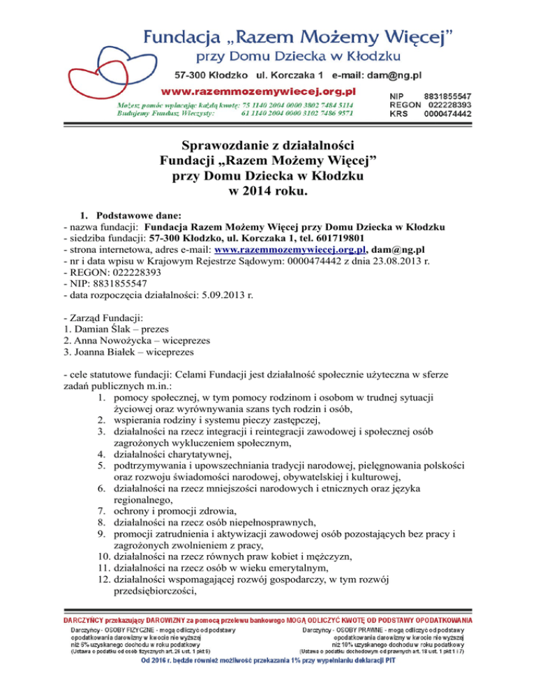 Sprawozdanie z działalności Fundacji „Razem Możemy Więcej” przy Domu Dziecka w Kłodzku w 2014 roku. 1. Podstawowe dane: - nazwa fundacji: Fundacja Razem Możemy Więcej przy Domu Dziecka w Kłodzku - siedziba fundacji: 57-300 Kłodzko, ul. Korczaka 1, tel. 601719801 - strona internetowa, adres e-mail: www.razemmozemywiecej.org.pl, [email protected] - nr i data wpisu w Krajowym Rejestrze Sądowym: 0000474442 z dnia 23.08.2013 r. - REGON: 022228393 - NIP: 8831855547 - data rozpoczęcia działalności: 5.09.2013 r. - Zarząd Fundacji: 1. Damian Ślak – prezes 2. Anna Nowożycka – wiceprezes 3. Joanna Białek – wiceprezes - cele statutowe fundacji: Celami Fundacji jest działalność społecznie użyteczna w sferze zadań publicznych m.in.: 1. pomocy społecznej, w tym pomocy rodzinom i osobom w trudnej sytuacji życiowej oraz wyrównywania szans tych rodzin i osób, 2. wspierania rodziny i systemu pieczy zastępczej, 3. działalności na rzecz integracji i reintegracji zawodowej i społecznej osób zagrożonych wykluczeniem społecznym, 4. działalności charytatywnej, 5. podtrzymywania i upowszechniania tradycji narodowej, pielęgnowania polskości oraz rozwoju świadomości narodowej, obywatelskiej i kulturowej, 6. działalności na rzecz mniejszości narodowych i etnicznych oraz języka regionalnego, 7. ochrony i promocji zdrowia, 8. działalności na rzecz osób niepełnosprawnych, 9. promocji zatrudnienia i aktywizacji zawodowej osób pozostających bez pracy i zagrożonych zwolnieniem z pracy, 10. działalności na rzecz równych praw kobiet i mężczyzn, 11. działalności na rzecz osób w wieku emerytalnym, 12. działalności wspomagającej rozwój gospodarczy, w tym rozwój przedsiębiorczości, 13. działalności wspomagającej rozwój techniki, wynalazczości i innowacyjności oraz rozpowszechnianie i wdrażanie nowych rozwiązań technicznych w praktyce gospodarczej, 14. działalności wspomagającej rozwój wspólnot i społeczności lokalnych, 15. nauki, szkolnictwa wyższego, edukacji, oświaty i wychowania, 16. wypoczynku dzieci i młodzieży, 17. kultury, sztuki, ochrony dóbr kultury i dziedzictwa narodowego, 18. wspierania i upowszechniania kultury fizycznej, 19. ekologii i ochrony zwierząt oraz ochrony dziedzictwa przyrodniczego, 20. turystyki i krajoznawstwa, 21. porządku i bezpieczeństwa publicznego, 22. upowszechniania i ochrony wolności i praw człowieka oraz swobód obywatelskich, a także działań wspomagających rozwój demokracji, 23. ratownictwa i ochrony ludności, 24. pomocy ofiarom katastrof, klęsk żywiołowych, konfliktów zbrojnych i wojen w kraju i za granicą, 25. upowszechniania i ochrony praw konsumentów, 26. działalności na rzecz integracji europejskiej oraz rozwijania kontaktów i współpracy między społeczeństwami, 27. promocji i organizacji wolontariatu, 28. pomocy Polonii i Polakom za granicą, 29. działalności na rzecz kombatantów i osób represjonowanych, 30. promocji Rzeczypospolitej Polskiej za granicą, 31. działalności na rzecz rodziny, macierzyństwa, rodzicielstwa, upowszechniania i ochrony praw dziecka, 32. przeciwdziałania uzależnieniom i patologiom społecznym, 33. działalności na rzecz organizacji pozarządowych oraz podmiotów działających w sferze zadań publicznych - sposób realizacji celów: fundacja realizuje swoje cele m.in. poprzez: 1.pozyskiwanie środków finansowych z przeznaczenie na działalność Fundacji, 2.prowadzenie i wspieranie działalności na rzecz dzieci z domu dziecka, dzieci samotnych, porzuconych, zaniedbanych wychowawczo i fizycznie, pozbawionych opieki rodzicielskiej, dzieci z rodzin zagrożonych wykluczeniem społecznym, 3.prowadzenie i wspieranie działalności na rzecz wypoczynku dzieci i młodzieży, 4.przyznawanie stypendiów i nagród, 5.wykonywanie zadań zleconych przez organy administracji publicznej. 2. Formy realizacji celów statutowych: A. Zbiórka publiczna Do 30.10.2014 r. Fundacja prowadziła zbiórkę publiczną na podstawie pozwolenie nr ZZK.5311.03.2013.ZZK4 wydanego przez Starostę Kłodzka z przeznaczeniem na wypoczynek dzieci i młodzieży z Domu zdiecka w Kłodzku oraz stypendia. Zbiórka przeprowadzona jest w formie zbierania ofiar do zaplombowanych puszek kwestarskich zgodnie z planem zbiórek oraz dobrowolnych wpłat na konto. Zebrano następujące środki finansowe: - do zaplombowanych puszek kwestarskich – 3628,60 zł - dobrowolne wpłaty ma konto: 07 1140 2004 0000 3702 7486 9570 – 1450,00 zł - zaksięgowane odsetki – 2,86 zł Razem: 5081,46 zł Wykorzystanie środków finansowych: - na wypoczynek dzieci z Domu Dziecka w Kłodzku (wyjazd do Pogórza k. Gdyni w dniach 5-17 sierpnia 2014 r.) - 2906,50 zł Koszty zbiórki publicznej: za pozwolenie na zbiórkę publiczną – 82,00 zł Niewykorzystane środki w kwocie 2029,96 zł zostaną wykorzystane na stypendia dla uzdolnionej młodzieży oraz wypoczynek dzieci z Domu Dziecka w Kłodzku. 28 listopada 2014 r. sprawozdanie ze zbiórki publicznej złożono Staroście Kłodzkiemu. B. Wspieranie Domu Dziecka Zakupiono 3 namioty na potrzeby Obozu Żeglarsko-Rekreacyjnego w Siemianach, którego organizatorem jest Dom Dziecka w Kłodzku. Wartość namiotów to 3.297 zł. W dniach 5-17 sierpnia 2014 r. czternastka dzieci z Domu Dziecka w Kłodzku przebywała na wakacjach w Pogórzu k. Gdyni. Fundacja sfinansowała wszystkie atrakcje, w jakich mogły uczestniczyć dzieci. A były to: zwiedzania Akwanarium Gdyńskiego, rejsy po porcie gdyńskim, po zatoce gdańskiej (Gdynia-Sopot, Gdynia-Hel-Gdynia, Sopot-Gdynia, Gdańsk-Sopot), pobyt w parku linowym, zwiedzanie molo w Sopocie. Koszt 2.906,50 zł został pokryty ze Zbiórki Publiczne. 25 października 2014 r. najstarsi wychowankowie Domu Dziecka w Kłodzku wraz z wychowawcami udali się do Wrocławia do Teatru Komedii na przedstawienie "Szalone Nożyczki". Bilety zostały sfinansowane przez Fundację z darowizny przekazanej przez Towarzystwo Niem