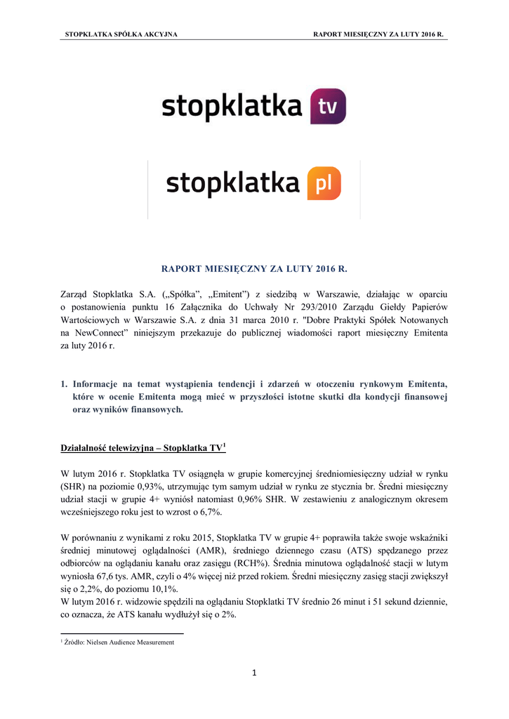 STOPKLATKA SPÓŁKA AKCYJNA RAPORT MIESIĘCZNY ZA LUTY 2016 R. RAPORT MIESIĘCZNY ZA LUTY 2016 R. Zarząd Stopklatka S.A. („Spółka”, „Emitent”) z siedzibą w Warszawie, działając w oparciu o postanowienia punktu 16 Załącznika do Uchwały Nr 293/2010 Zarządu Giełdy Papierów Wartościowych w Warszawie S.A. z dnia 31 marca 2010 r. "Dobre Praktyki Spółek Notowanych na NewConnect” niniejszym przekazuje do publicznej wiadomości raport miesięczny Emitenta za luty 2016 r. 1. Informacje na temat wystąpienia tendencji i zdarzeń w otoczeniu rynkowym Emitenta, które w ocenie Emitenta mogą mieć w przyszłości istotne skutki dla kondycji finansowej oraz wyników finansowych. Działalność telewizyjna – Stopklatka TV1 W lutym 2016 r. Stopklatka TV osiągnęła w grupie komercyjnej średniomiesięczny udział w rynku (SHR) na poziomie 0,93%, utrzymując tym samym udział w rynku ze stycznia br. Średni miesięczny udział stacji w grupie 4+ wyniósł natomiast 0,96% SHR. W zestawieniu z analogicznym okresem wcześniejszego roku jest to wzrost o 6,7%. W porównaniu z wynikami z roku 2015, Stopklatka TV w grupie 4+ poprawiła także swoje wskaźniki średniej minutowej oglądalności (AMR), średniego dziennego czasu (ATS) spędzanego przez odbiorców na oglądaniu kanału oraz zasięgu (RCH%). Średnia minutowa oglądalność stacji w lutym wyniosła 67,6 tys. AMR, czyli o 4% więcej niż przed rokiem. Średni miesięczny zasięg stacji zwiększył się o 2,2%, do poziomu 10,1%. W lutym 2016 r. widzowie spędzili na oglądaniu Stopklatki TV średnio 26 minut i 51 sekund dziennie, co oznacza, że ATS kanału wydłużył się o 2%. 1 Źródło: Nielsen Audience Measurement 1 STOPKLATKA SPÓŁKA AKCYJNA RAPORT MIESIĘCZNY ZA LUTY 2016 R. Stacja cieszy się popularnością wśród ogółu widzów Naziemnej Telewizji Cyfrowej. AMR kanału w tej grupie wyniosła w lutym 42,3 tys. odbiorców. Wynik ten przełożył się na 1,87% udziału w rynku, co w porównaniu z lutym 2015 r. oznacza wzrost o 8,7%. Złożenie wniosku o wprowadzenie instrumentów finansowych do obrotu na rynku NewConnect 24 lutego 2016 r. Spółka złożyła do Zarządu Giełdy Papierów Wartościowych w Warszawie S.A. („GPW”) wniosek o wprowadzenie do obrotu w alternatywnym systemie obrotu organizowanym przez GPW 4 641 304 (słownie: czterech milionów sześciuset czterdziestu jeden tysięcy trzystu czterech) akcji zwykłych na okaziciela serii E. Zmiana warunków koncesji na rozpowszechnianie programu Stopklatka TV 23 lutego 2016 r. Zarząd Emitenta powziął informację o podjęciu przez Przewodniczącego Krajowej Rady Radiofonii i Telewizji („KRRiT”) decyzji o wyrażeniu zgody na wnioskowane przez Spółkę zmiany w koncesji Nr 544/2013-T z dnia 30 października 2013 r. („Koncesja”), udzielonej Stopklatka S.A. na rozpowszechnianie programu telewizyjnego pod nazwą „STOPKLATKA TV” w sposób cyfrowy rozsiewczy naziemny w multipleksie pierwszym. Na mocy niniejszej decyzji od kwietnia 2016 r.: udział filmów fabularnych wynosił będzie min. 53% w tygodniowym czasie nadawania programu; udział filmów dokumentalnych wynosił będzie min. 10% w tygodniowym czasie nadawania programu; wprowadzono nową kategorię audycji – rozrywka – na poziomie min. 5% w tygodniowym czasie nadawania programu; udział audycji powtórkowych wynosił będzie nie więcej niż 30% w tygodniowym czasie nadawania programu. Pozostałe warunki Koncesji pozostają bez zmian. W ocenie Spółki wyżej wskazana zmiana warunków udzielonej Koncesji w stopniu znaczącym podniesie jakość oferowanych programów, a w konsekwencji zwiększy satysfakcję odbiorców kanału Stopklatka TV. Przyczyni się tym samym do wzrostu oglądalności kanału oraz przychodów Emitenta z reklam. Rejestracja zmiany wysokości kapitału zakładowego Stopklatka S.A. oraz zmiany statutu Spółki w związku z emisją akcji serii E 9 lutego 2016 r. Sąd Rejonowy dla m.st. Warszawy, XIII Wydział Gospodarczy Krajowego Rejestru Sądowego dokonał rejestracji zmiany wysokości kapitału zakładowego Emitenta oraz zmiany Statutu 2 STOPKLATKA SPÓŁKA AKCYJNA RAPORT MIESIĘCZNY ZA LUTY 2016 R. Spółki (Rozdział III, Art. 7), wynikających z emisji 4 641 304 akcji serii E Stopklatka S.A. o wartości nominalnej 1,00 zł jedna akcja. Po dokonaniu powyższych zmian kapitał zakładowy Emitenta wynosi 11 171 260,00 zł i dzieli się na: • • • • • • 1 271 000 akcji serii A1, 485 000 akcji serii A2, 193 045 akcji serii B, 326 201 akcji serii C, 4 254 710 akcji serii D, 4 641 304 akcji serii E. Ogólna liczba głosów na walnym zgromadzeniu Stopklatka S.A. wynikająca ze wszystkich wyemitowanych akcji Spółki wynosi 11 171 260.2 Zmiany te zostały wprowadzone na mocy uchwały nr 4 Nadzwyczajnego Walnego Zgromadzenia Stopklatka S.A. z dnia 7 grudnia 2015 r., uchwały nr 1 Zarządu Stopklatka S.A. z dnia 19 stycznia 2016 r. w sprawie dookreślenia wysokości kapitału zakładowego w Statucie Spółki oraz uchwały nr 2 Zarządu Stopklatka S.A. z dnia 19 stycznia 2016 r. w sprawie zmiany Statutu Spółki. Koszty emisji akcji serii E Stopklatka S.A. Na dzień publikacji niniejszego raportu łączne koszty emisji akcji serii E wyniosły 241 318,49 zł., w tym: a) przygotowanie i przeprowadzenie oferty: 96 074,99 zł b) wynagrodzenie subemitentów, oddzielnie dla każdego z nich: 0,00 zł c) sporządzenie publicznego dokumentu informacyjnego lub dokumentu informacyjnego, z uwzględnieniem kosztów doradztwa: 95 000,00 zł, d) opłaty administracyjne na rzecz KDPW, GPW, opłaty notarialne, podatki i inne: 50 243,50 zł. Z uwagi na brak ostatecznego rozliczenia kosztów emisji do dnia przekazania niniejszego raportu, Spółka sporządzi i udostępni w terminie późniejszym do publicznej wiadomości raport bieżący dotyczący ostatecznej wysokości kosztów emisji, w tym kosztów według ich tytułów, po otrzymaniu i zaakceptowaniu wszystkich faktur o