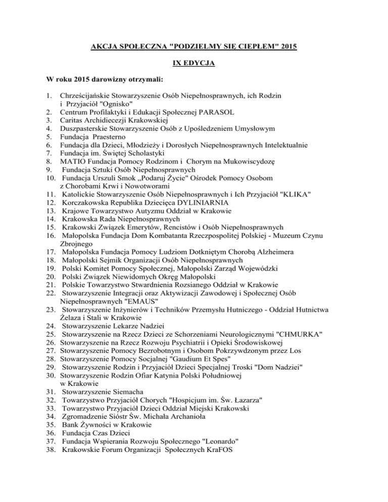AKCJA SPOŁECZNA "PODZIELMY SIĘ CIEPŁEM" 2015 IX EDYCJA W roku 2015 darowizny otrzymali: 1. 2. 3. 4. 5. 6. 7. 8. 9. 10. 11. 12. 13. 14. 15. 16. 17. 18. 19. 20. 21. 22. 23. 24. 25. 26. 27. 28. 29. 30. 31. 32. 33. 34. 35. 36. 37. 38. Chrześcijańskie Stowarzyszenie Osób Niepełnosprawnych, ich Rodzin i Przyjaciół "Ognisko" Centrum Profilaktyki i Edukacji Społecznej PARASOL Caritas Archidiecezji Krakowskiej Duszpasterskie Stowarzyszenie Osób z Upośledzeniem Umysłowym Fundacja Praesterno Fundacja dla Dzieci, Młodzieży i Dorosłych Niepełnosprawnych Intelektualnie Fundacja im. Świętej Scholastyki MATIO Fundacja Pomocy Rodzinom i Chorym na Mukowiscydozę Fundacja Sztuki Osób Niepełnosprawnych Fundacja Urszuli Smok „Podaruj Życie" Ośrodek Pomocy Osobom z Chorobami Krwi i Nowotworami Katolickie Stowarzyszenie Osób Niepełnosprawnych i Ich Przyjaciół "KLIKA" Korczakowska Republika Dziecięca DYLINIARNIA Krajowe Towarzystwo Autyzmu Oddział w Krakowie Krakowska Rada Niepełnosprawnych Krakowski Związek Emerytów, Rencistów i Osób Niepełnosprawnych Małopolska Fundacja Dom Kombatanta Rzeczpospolitej Polskiej - Muzeum Czynu Zbrojnego Małopolska Fundacja Pomocy Ludziom Dotkniętym Chorobą Alzheimera Małopolski Sejmik Organizacji Osób Niepełnosprawnych Polski Komitet Pomocy Społecznej, Małopolski Zarząd Wojewódzki Polski Związek Niewidomych Okręg Małopolski Polskie Towarzystwo Stwardnienia Rozsianego Oddział w Krakowie Stowarzyszenie Integracji oraz Aktywizacji Zawodowej i Społecznej Osób Niepełnosprawnych "EMAUS" Stowarzyszenie Inżynierów i Techników Przemysłu Hutniczego - Oddział Hutnictwa Żelaza i Stali w Krakowie Stowarzyszenie Lekarze Nadziei Stowarzyszenie na Rzecz Dzieci ze Schorzeniami Neurologicznymi "CHMURKA" Stowarzyszenie na Rzecz Rozwoju Psychiatrii i Opieki Środowiskowej Stowarzyszenie Pomocy Bezrobotnym i Osobom Pokrzywdzonym przez Los Stowarzyszenie Pomocy Socjalnej "Gaudium Et Spes" Stowarzyszenie Rodzin i Przyjaciół Dzieci Specjalnej Troski "Dom Nadziei" Stowarzyszenie Rodzin Ofiar Katynia Polski Południowej w Krakowie Stowarzyszenie Siemacha Towarzystwo Przyjaciół Chorych "Hospicjum im. Św. Łazarza" Towarzystwo Przyjaciół Dzieci Oddział Miejski Krakowski Zgromadzenie Sióstr Św. Michała Archanioła Bank Żywności w Krakowie Fundacja Czas Dzieci Fundacja Wspierania Rozwoju Społecznego "Leonardo" Krakowskie Forum Organizacji Społecznych KraFOS 39. Zgromadzenie Sióstr Miłosierdzia św. Wincentego a Paulo Prowincja Krakowska 40. Fundacja Pomocy Rodzinie w Wychowaniu Dom dla Dziecka