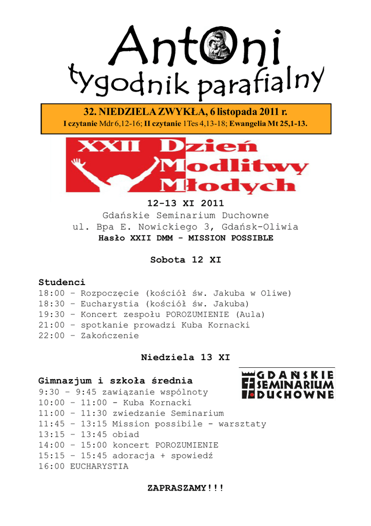 AntOni 32. NIEDZIELA ZWYKŁA, 6 listopada 2011 r. I czytanie Mdr 6,12-16; II czytanie 1Tes 4,13-18; Ewangelia Mt 25,1-13. 12-13 XI 2011 Gdańskie Seminarium Duchowne ul. Bpa E. Nowickiego 3, Gdańsk-Oliwia Hasło XXII DMM - MISSION POSSIBLE Sobota 12 XI Studenci 18:00 18:30 19:30 21:00 22:00 – – – – – Rozpoczęcie (kościół św. Jakuba w Oliwe) Eucharystia (kościół św. Jakuba) Koncert zespołu POROZUMIENIE (Aula) spotkanie prowadzi Kuba Kornacki Zakończenie Niedziela 13 XI Gimnazjum i szkoła średnia 9:30 – 9:45 zawiązanie wspólnoty 10:00 – 11:00 - Kuba Kornacki 11:00 – 11:30 zwiedzanie Seminarium 11:45 – 13:15 Mission possibile - warsztaty 13:15 – 13:45 obiad 14:00 – 15:00 koncert POROZUMIENIE 15:15 – 15:45 adoracja + spowiedź 16:00 EUCHARYSTIA ZAPRASZAMY!!! KOMENTARZE BIBLIJNE Wielokrotnie słyszy się skargi, że ktoś czytając Pismo Święte nie zrozumiał sensu przesłania. Może i nas czasami ogarnia takie odczucie? Dlaczego nie rozumiemy o co chodzi Bogu, który kieruje do nas swoje słowo? Jak powinniśmy się przygotowywać do rozmowy z Bogiem poprzez lekturę Jego Słowa? Zawsze należy pamiętać że Pismo Święte to wspólne dzieło Boga i człowieka. Bez pomocy Ducha Świętego nie jesteśmy w stanie usłyszeć głosu Boga Ojca, dlatego powinniśmy modlić się o dar rozumu, który pomoże nam zrozumieć Boże Słowo. Po lekturze Słowa Bożego powinniśmy poszukać właściwego sensu przeczytanych słów. I tutaj na szczęście nie jesteśmy osamotnieni. Z pomocą przychodzą nam duchowni i świeccy bibliści. Naszym zadaniem jest tylko dotrzeć do ich komentarzy, do ich wyjaśnień sensu Świętych Ksiąg. Komentarz biblijny pozwoli nam poczuć atmosferę odległych czasów, uchwycić sens tego, co autor natchniony chciał przekazać czytelnikowi. Doktor teologii Krzysztof Mielcarek (wykładowca KUL) wyróżnia cztery grupy wierzących. Do pierwszej zali- cza tych, którzy są przekonani o swojej głębokiej religijności, ale do Biblii nie zaglądają. Ich kontakt ze Słowem Bożym ogranicza się tylko do liturgii słowa podczas Eucharystii. Drugą grupę stanowią z reguły osoby starsze i oczytane, które sięgnęły po niejedną książkę o Piśmie Świętym, traktują jednak jego tekst jedynie jako zjawisko kulturowe. Pojawiło się także wiele ruchów formacyjnych, praktykujących kontakt ze Słowem Bożym, ale uznających książki o Biblii za niepotrzebne. Czwarta grupa tworzona jest przez ludzi starających się o duchowy wzrost przez kontakt (regularny!) ze Słowem Bożym, a jednocześnie zdających sobie sprawę z konieczności poznawania środowiska biblijnego i zdobywania wiedzy teologicznej. Wszystko po to, aby jak najlepiej poznać Biblię a dzięki temu Jezusa Chrystusa. Jeśli znaleźliśmy siebie wśród członków jednej z trzech pierwszych grup postarajmy się, poprzez regularny kontakt z Pismem Świętym i lekturę komentarzy do Biblii, przejść do tej ostatniej grupy. Wielką pomocą w tej przemianie będą z pewnością katechezy księdza Piotra, które odbywają się w naszej kaplicy w każdy poniedziałek o godzinie 19.10. Janusz Szwoch Święty Marcin z Tours - 11 listopada Święty Marcin urodził się ok. 316 r. na terenie dzisiejszych Węgier. Zgodnie z obowiązującym ówcześnie prawem, jako syn żołnierza, w wieku 15 lat wstąpił do armii cesarskiej. W trakcie pobytu w Galii wydarzyło się coś, co na zawsze zmieniło jego życie. Zdjęty litością na widok biedaka drżącego z zimna u bram miasta, Marcin oddał mu większą część swego płaszcza. Następnej nocy ukazał mu się Chrystus odziany w ten właśnie płaszcz. Po tym wydarzeniu Marcin przyjmuje chrzest. Gaśnie w nim duch żołnierski i pragnie wystąpić z armii. Uważa, że wiara kłóci się z przelewem krwi. Przed ukończeniem służby, w czasie szturmu, Marcin staje na czele nacierających za jedyną broń mając krzyż. Tuż przed szturmem przeciwnicy cesarza poddają się, za co zasługa przypisana została właśnie Marcinowi. Marcin nie zostawia odkrytej miłości Bożej dla siebie, ale pragnie dzielić się nią z innymi. Jego pierwszym dziełem misyjnym jest powrót do domu rodzinnego i doprowadzenie rodziców do chrześcijaństwa. Święty Marcin jest nazywany ewangelizatorem Galii. Szedł naprzód bez lęku, głosił Ewangelię z entuzjazmem, dobierał słowa w zależności od słuchaczy. Uzbrojony w wiarę wchodził na wrogie terytoria, rzucał wyzwania poganom i niewierzącym. W przypadku silnego oporu uciekał się do postu, pokuty i żarliwej modlitwy. Kasia Kowalczyk SPOWIEDŹ POWSZECHNA Nosimy w swoich sercach tęsknotę za Bogiem. Chcielibyśmy Go spotkać, zobaczyć, cieszyć się Jego obecnością w życiu – i często EUCHARYSTIA nic z tego nie wychodzi. Wielu zniechęca się po jakimś czasie i traci nadzieję na to, że jest to w ogóle możliwe. Jezus odpowiada bardzo konkretnie na to ludzkie pragnienie: „Błogosławieni czystego serca, albowiem oni Boga oglądać będą”. To jest pierwszy i najważniejszy warunek spotkania z miłującym Ojcem. Dlatego podczas Mszy świętej, po powitaniu, zostajemy wezwani do uznania własnej grzeszności i proszenia Boga o przebaczenie, nawet najmniejszych przewinień tak, by z czystym sercem móc oglądać Go i przyjąć w Komunii świętej. Akt pokuty, bo tak nazywa się ta część Mszy świętej, gładzi grzechy powszednie (lekkie) i przybiera najczęściej formę modlitwy rozpoczynającej się od słów: „Spowiadam się Bogu wszechmogącemu i wam bracia i siostry”. Modlitwa ta poprzedzona jest chwilą milczenia, podczas której mamy wzbudzić w swoim sercu żal za grzechy, uznając jednocześnie naszą niegodność w spotkaniu z Bogiem. W czasie spowiedzi powszechnej wyciągamy do Boga ręce i bijemy się w piersi, tak jak ewangeliczny celnik, który wołał: „Panie, miej litość nade mną grzesznikiem”. Prosimy Najwyższego, „byśmy mogli godnie uczest