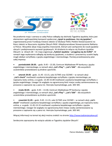 Na przełomie maja i czerwca w całej Polsce odbędą się obchody Tygodnia Języków, który jest elementem ogólnopolskiej kampanii społecznej „Język to podstawa. Ucz się języków”, organizowanej przez Fundację Instytut Jakości w Edukacji FIJED, Polskie Stowarzyszenie na Rzecz Jakości w Nauczaniu Języków Obcych PASE i Międzynarodowe Stowarzyszenie Reklamy w Polsce. Wszystkie akcje mają wspólny mianownik, którym jest zachęcenie do nauki języków obcych i podejmowania wyzwao językowych. W działania te włącza się Studium Języków Obcych i w dniach 28 – 31 maja organizuje „Tydzień Języków – przygotuj się do EURO”. W ramach tego wydarzenia odbędą się konkursy językowe, a studenci i pracownicy uczelni będą mogli zdobyd certyfikaty z języka angielskiego i niemieckiego. Poniżej przedstawiamy plan całej imprezy: • poniedziałek 28.05. - godz. 9.45 – 13.30, Centrum Wykładowe PP konkursy z języka angielskiego i niemieckiego, w ramach akcji „Let's Play” i „Let's Talk” - dla wszystkich uczestników przewidziane są drobne upominki. • wtorek 29.05 - godz. 11.45 -13.15, sala 317WE oraz 322WE – w ramach akcji „Let’s check” możliwośd uzyskania bezpłatnego certyfikatu z języka niemieckiego, po napisaniu testu online, a w godz. 13.30-15.00 możliwośd uzyskania bezpłatnego certyfikatu z języka angielskiego. Uwaga! Ze względu na ograniczoną ilośd miejsc osoby zainteresowane są proszone o zapisanie się u pana inż. Henryka Szymaoskiego, pok. 305 WE. • środa 30.05. - godz. 9.45 – 13.30, Centrum Wykładowe PP konkursy z języka angielskiego i niemieckiego, w ramach akcji „Let's Play” i „Let's Talk” - dla wszystkich uczestników przewidziane są drobne upominki. • czwartek 31.05 – godz. 9.45 -11.15, sala 317WE oraz 322WE – w ramach akcji „Let’s check” możliwośd uzyskania bezpłatnego certyfikatu z języka angielskiego, po napisaniu testu online, a w godz. 11.45-13.15 możliwośd uzyskania bezpłatnego certyfikatu z języka niemieckiego. Uwaga! Ze względu na ograniczoną ilośd miejsc osoby zainteresowane są proszone o zapisanie się u pana inż. Henryka Szymaoskiego, pok. 305 WE. Więcej informacji na temat tej akcji można znaleźd na stronie http://www.tydzienjezykow.pl/ Serdecznie zapraszamy do wzięcia udziału w Tygodniu Języków Obcych! Patron Medialny