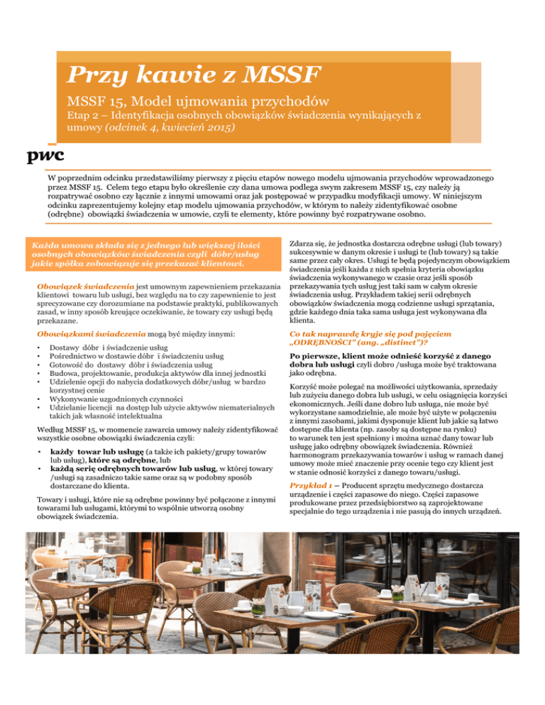 Przy kawie z MSSF MSSF 15, Model ujmowania przychodów Etap 2 – Identyfikacja osobnych obowiązków świadczenia wynikających z umowy (odcinek 4, kwiecień 2015) W poprzednim odcinku przedstawiliśmy pierwszy z pięciu etapów nowego modelu ujmowania przychodów wprowadzonego przez MSSF 15. Celem tego etapu było określenie czy dana umowa podlega swym zakresem MSSF 15, czy należy ją rozpatrywać osobno czy łącznie z innymi umowami oraz jak postępować w przypadku modyfikacji umowy. W niniejszym odcinku zaprezentujemy kolejny etap modelu ujmowania przychodów, w którym to należy zidentyfikować osobne (odrębne) obowiązki świadczenia w umowie, czyli te elementy, które powinny być rozpatrywane osobno. Każda umowa składa się z jednego lub większej ilości osobnych obowiązków świadczenia czyli dóbr/usług jakie spółka zobowiązuje się przekazać klientowi. Obowiązek świadczenia jest umownym zapewnieniem przekazania klientowi towaru lub usługi, bez względu na to czy zapewnienie to jest sprecyzowane czy dorozumiane na podstawie praktyki, publikowanych zasad, w inny sposób kreujące oczekiwanie, że towary czy usługi będą przekazane. Obowiązkami świadczenia mogą być między innymi: • • • • • • • Dostawy dóbr i świadczenie usług Pośrednictwo w dostawie dóbr i świadczeniu usług Gotowość do dostawy dóbr i świadczenia usług Budowa, projektowanie, produkcja aktywów dla innej jednostki Udzielenie opcji do nabycia dodatkowych dóbr/usług w bardzo korzystnej cenie Wykonywanie uzgodnionych czynności Udzielanie licencji na dostęp lub użycie aktywów niematerialnych takich jak własność intelektualna Według MSSF 15, w momencie zawarcia umowy należy zidentyfikować wszystkie osobne obowiązki świadczenia czyli: • • każdy towar lub usługę (a także ich pakiety/grupy towarów lub usług), które są odrębne, lub każdą serię odrębnych towarów lub usług, w której towary /usługi są zasadniczo takie same oraz są w podobny sposób dostarczane do klienta. Towary i usługi, które nie są odrębne powinny być połączone z innymi towarami lub usługami, którymi to wspólnie utworzą osobny obowiązek świadczenia. Zdarza się, że jednostka dostarcza odrębne usługi (lub towary) sukcesywnie w danym okresie i usługi te (lub towary) są takie same przez cały okres. Usługi te będą pojedynczym obowiązkiem świadczenia jeśli każda z nich spełnia kryteria obowiązku świadczenia wykonywanego w czasie oraz jeśli sposób przekazywania tych usług jest taki sam w całym okresie świadczenia usług. Przykładem takiej serii odrębnych obowiązków świadczenia mogą codzienne usługi sprzątania, gdzie każdego dnia taka sama usługa jest wykonywana dla klienta. Co tak naprawdę kryje się pod pojęciem „ODRĘBNOŚCI” (ang. „distinct”)? Po pierwsze, klient może odnieść korzyść z danego dobra lub usługi czyli dobro /usługa może być traktowana jako odrębna. Korzyść może polegać na możliwości użytkowania, sprzedaży lub zużyciu danego dobra lub usługi, w celu osiągnięcia korzyści ekonomicznych. Jeśli dane dobro lub usługa, nie może być wykorzystane samodzielnie, ale może być użyte w połączeniu z innymi zasobami, jakimi dysponuje klient lub jakie są łatwo dostępne dla klienta (np. zasoby są dostępne na rynku) to warunek ten jest spełniony i można uznać dany towar lub usługę jako odrębny obowiązek świadczenia. Również harmonogram przekazywania towarów i usług w ramach danej umowy może mieć znaczenie przy ocenie tego czy klient jest w stanie odnosić korzyści z danego towaru/usługi. Przykład 1 – Producent sprzętu medycznego dostarcza urządzenie i części zapasowe do niego. Części zapasowe produkowane przez przedsiębiorstwo są zaprojektowane specjalnie do tego urządzenia i nie pasują do innych urządzeń. Przygotuj się już dziś… …dzięki naszej serii „Przy kawie z MSSF” Rozwiązanie przykład 1: Ilość osobnych obowiązków świadczeń zależy w tym przypadku od kolejności dostarczenia dóbr / usług w ramach umowy. Jeżeli najpierw zostanie dostarczone urządzenie, a następnie części zapasowe – klient, zaopatrzony już w urządzenie, będzie mógł korzystać z części zapasowych przy użyciu posiadanych zasobów (tj. urządzenia), co powinno skutkować rozpoznaniem dwóch osobnych obowiązków świadczenia. W przeciwnym przypadku klient nie może odnosić korzyści z samych części zapasowych, co wskazuje na istnienie pojedynczego obowiązku świadczenia. Po drugie, towar lub usługa nie jest zależny czy powiązany z innym towarem czy usługą z tej samej umowy (ang. „separately identifiable”), czyli dobro usługa jest odrębna w kontekście tej specyficznej umowy. kompletnego budynku mieszkalnego. Spółka świadczy istotne usługi integrujące poszczególne czynności, nie jest więc spełniony warunek mówiący o odrębności poszczególnych elementów w kontekście umowy i spółka dla celów rozpoznawania przychodu powinna połączyć poszczególne elementy umowy w jeden obowiązek świadczenia. Przykład 3 – Spółka podpisała z klientem umowę na dostawę licencji na program komputerowy na czas nieograniczony, usługi instalacyjne oraz 3-letnie usługi wsparcia powdrożeniowego. W ramach instalacji wymagana jest konfiguracja niektórych elementów programu, bez istotnej modyfikacji samego programu. Usługi te nie wymagają wiedzy, która nie jest dostępna na rynku – inne spółki z branży IT mogłyby świadczyć te same usługi. Usługi wsparcia nie są niezbędne, aby zapewnić prawidłowe funkcjonowanie programu komputerowego. W ocenie tego warunku najważniejszym jest to, czego oczekuje klient jako ostatecznego produktu i to oczekiwanie klienta w dużym stopniu determinuje, czy dobra /usługi powinny być połączone i rozliczane jako pojedynczy obowiązek świadczenia, czy też powinny być wykazywane odrębnie. R