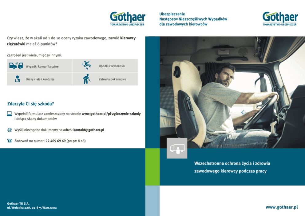 Ubezpieczenie Następstw Nieszczęśliwych Wypadków dla zawodowych kierowców Czy wiesz, że w skali od 1 do 10 oceny ryzyka zawodowego, zawód kierowcy ciężarówki ma aż 8 punktów? Zagrożeń jest wiele, między innymi: Wypadki komunikacyjne Upadki z wysokości Urazy ciała i kontuzje Zatrucia pokarmowe Zdarzyła Ci się szkoda? Wypełnij formularz zamieszczony na stronie www.gothaer.pl/pl-zgloszenie-szkody i dołącz skany dokumentów @ Wyślij niezbędne dokumenty na adres: [email protected] Zadzwoń na numer: 22 469 69 69 (pn-pt: 8-18) Wszechstronna ochrona życia i zdrowia zawodowego kierowcy podczas pracy oświatowych „oświata” 2016/2017 Gothaer TU S.A. ul. Wołoska 22A, 02-675 Warszawa Ubezpieczenie NNW dla zawodowych kierowców Ubezpieczenie Następstw Nieszczęśliwych Wypadków dla zawodowych kierowców zapewnia im ochronę ubezpieczeniową przez całą dobę na terenie całego świata. Wybierz zakres ubezpieczenia spośród 2 wariantów: dla kierowców pracujących w Polsce, jak i za granicą: • Ubezpieczenie kosztów leczenia • Ubezpieczenie następstw nieszczęśliwych NNW poniesionych na terenie RP wypadków • Ubezpieczenie odpowiedzialności • Zasiłek dzienny z tytułu niezdolności cywilnej w życiu prywatnym do pracy bądź nauki lub zasiłek (nie dotyczy USA i Kanady) dzienny w związku z pobytem w szpitalu dodatkowo, dla kierowców pracujących za granicą: • Ubezpieczenie kosztów leczenia za granicą RP i kraju stałego pobytu KORZYŚCI Z UBEZPIECZENIA PRACODAWCA • zabezpieczenie od ewentualnych roszczeń w związku z nieszczęśliwym wypadkiem pracownika • możliwość ujęcia opłacanych składek w kosztach firmy n Ubezpieczenie następstw nieszczęśliwych wypadków zapewnia pomoc finansową w chwilach, gdy Ubezpieczonemu stanie się fizyczna krzywda w wyniku niezależnych od niego zdarzeń, takich jak wypadek komunikacyjny, złamania, urazy ciała, skręcenia, etc. Za nieszczęśliwy wypadek Gothaer uważa także zawał serca i udar mózgu, jeżeli nie były spowodowane wcześniejszymi stanami chorobowymi. Ubezpieczenie kosztów leczenia następstw nieszczęśliwych wypadków obejmuje n poniesione na terenie RP, niezbędne z medycznego punktu widzenia, koszty leczenia zalecone przez lekarza, udokumentowane i związane z nieszczęśliwym wypadkiem. Ubezpieczony w ramach tej klauzuli może uzyskać zwrot za m.in. prywatną wizytę u lekarza, zakup leków i środków opatrunkowych, rehabilitację. Zasiłek dzienny z tytułu niezdolności do pracy bądź nauki lub pobytu w szpitalu. n Zasiłek dzienny jest wypłacany Ubezpieczonemu za udokumentowany okres niezdolności do pracy bądź nauki lub udokumentowany okres pobytu w szpitalu w związku z nieszczęśliwym wypadkiem. Ubezpieczony chroniony jest na całym świecie. PRACOWNIK • brak konieczności ponoszenia kosztów leczenia za granicą z własnej kieszeni (w szczególności kosztów transportu medycznego, nierefundowanych przez NFZ na podstawie karty EKUZ) • szeroka ochrona ubezpieczeniowa (w tym zawał serca i udar mózgu w definicji NNW) • wsparcie finansowe w trakcie rekonwalescencji po wypadku Ubezpieczenie kosztów leczenia za granicą RP i kraju stałego pobytu obejmuje n udokumentowane koszty powstałe w związku z nagłym zachorowaniem lub nieszczęśliwym wypadkiem. W przypadku spraw realizowanych przez Centrum Alarmowe Gothaer, koszty leczenia pokrywane są bezpośrednio na konto placówki medycznej, z usług której Ubezpieczony korzystał w ramach bezgotówkowej pomocy. Ubezpieczony chroniony jest na całym świecie za wyjątkiem RP i kraju stałego pobytu. Ubezpieczenie OC w życiu prywatnym obejmuje ochroną odpowiedzialność cywilną n Ubezpieczonego za szkody osobowe lub w mieniu, wyrządzone poszkodowanemu, w związku z wykonywaniem czynności życia prywatnego. Ubezpieczony chroniony jest na całym świecie, z wyjątkiem USA i Kanady.
