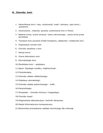 B. Choroby koni 1. Identyfikacja koni ( rasy, użytkowość, maść i odmiany, opis konia ) ,paszporty. 2. Użytkowanie , hodowla, sposoby użytkowania koni w Polsce. 3. Badanie konia, ocena kondycji i stanu zdrowotnego , ocena konia przed sprzedażą. 4. Transport koni,używane środki transportu, załadunek i rozładunek koni. 5. Organizacja rozrodu koni. 6. Choroby zaraźliwe u koni. 7. Sekcja konia. 8. Ocena dobrostanu koni. 9. Dermatologia koni. 10.Okulistyka koni – podstawy. 11.Sport, fizjologia wysiłku, mięśniochwat . 12.Fizykoterapia. 13.Choroby układu oddechowego. 14.Podstawy stomatologii . 15.Choroby układu pokarmowego – kolki. 16.Parazytologia. 17.Ortopedia – choroby kończyn i kręgosłupa. 18.Choroby kopyt . 19.Diagnostyka laboratoryjna i techniki obrazowe. 20.Moduł informatyczno-komputerowy. 21.Ekonomika prowadzenia zakładu leczniczego dla zwierząt .
