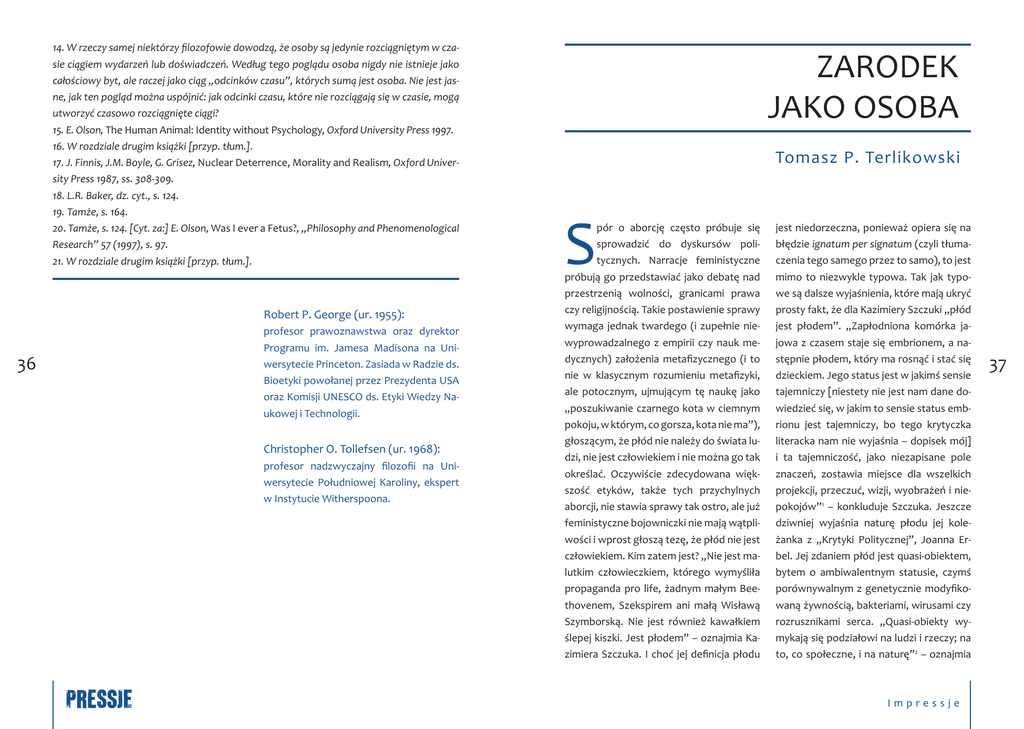 14. W rzeczy samej niektórzy filozofowie dowodzą, że osoby są jedynie rozciągniętym w czasie ciągiem wydarzeń lub doświadczeń. Według tego poglądu osoba nigdy nie istnieje jako całościowy byt, ale raczej jako ciąg „odcinków czasu”, których sumą jest osoba. Nie jest jasne, jak ten pogląd można uspójnić: jak odcinki czasu, które nie rozciągają się w czasie, mogą utworzyć czasowo rozciągnięte ciągi? 15. E. Olson, The Human Animal: Identity without Psychology, Oxford University Press 1997. 16. W rozdziale drugim książki [przyp. tłum.]. 17. J. Finnis, J.M. Boyle, G. Grisez, Nuclear Deterrence, Morality and Realism, Oxford University Press 1987, ss. 308-309. 18. L.R. Baker, dz. cyt., s. 124. 19. Tamże, s. 164. 20. Tamże, s. 124. [Cyt. za:] E. Olson, Was I ever a Fetus?, „Philosophy and Phenomenological Research” 57 (1997), s. 97. 21. W rozdziale drugim książki [przyp. tłum.]. Robert P. George (ur. 1955): 36 profesor prawoznawstwa oraz dyrektor Programu im. Jamesa Madisona na Uniwersytecie Princeton. Zasiada w Radzie ds. Bioetyki powołanej przez Prezydenta USA oraz Komisji UNESCO ds. Etyki Wiedzy Naukowej i Technologii. Christopher O. Tollefsen (ur. 1968): profesor nadzwyczajny filozofii na Uniwersytecie Południowej Karoliny, ekspert w Instytucie Witherspoona. ZARODEK JAKO OSOBA Tomasz P. Terlikowski S pór o aborcję często próbuje się sprowadzić do dyskursów politycznych. Narracje feministyczne próbują go przedstawiać jako debatę nad przestrzenią wolności, granicami prawa czy religijnością. Takie postawienie sprawy wymaga jednak twardego (i zupełnie niewyprowadzalnego z empirii czy nauk medycznych) założenia metafizycznego (i to nie w klasycznym rozumieniu metafizyki, ale potocznym, ujmującym tę naukę jako „poszukiwanie czarnego kota w ciemnym pokoju, w którym, co gorsza, kota nie ma”), głoszącym, że płód nie należy do świata ludzi, nie jest człowiekiem i nie można go tak określać. Oczywiście zdecydowana większość etyków, także tych przychylnych aborcji, nie stawia sprawy tak ostro, ale już feministyczne bojowniczki nie mają wątpliwości i wprost głoszą tezę, że płód nie jest człowiekiem. Kim zatem jest? „Nie jest malutkim człowieczkiem, którego wymyśliła propaganda pro life, żadnym małym Beethovenem, Szekspirem ani małą Wisławą Szymborską. Nie jest również kawałkiem ślepej kiszki. Jest płodem” – oznajmia Kazimiera Szczuka. I choć jej definicja płodu jest niedorzeczna, ponieważ opiera się na błędzie ignatum per signatum (czyli tłumaczenia tego samego przez to samo), to jest mimo to niezwykle typowa. Tak jak typowe są dalsze wyjaśnienia, które mają ukryć prosty fakt, że dla Kazimiery Szczuki „płód jest płodem”. „Zapłodniona komórka jajowa z czasem staje się embrionem, a następnie płodem, który ma rosnąć i stać się dzieckiem. Jego status jest w jakimś sensie tajemniczy [niestety nie jest nam dane dowiedzieć się, w jakim to sensie status embrionu jest tajemniczy, bo tego krytyczka literacka nam nie wyjaśnia – dopisek mój] i ta tajemniczość, jako niezapisane pole znaczeń, zostawia miejsce dla wszelkich projekcji, przeczuć, wizji, wyobrażeń i niepokojów”1 – konkluduje Szczuka. Jeszcze dziwniej wyjaśnia naturę płodu jej koleżanka z „Krytyki Politycznej”, Joanna Erbel. Jej zdaniem płód jest quasi-obiektem, bytem o ambiwalentnym statusie, czymś porównywalnym z genetycznie modyfikowaną żywnością, bakteriami, wirusami czy rozrusznikami serca. „Quasi-obiekty wymykają się podziałowi na ludzi i rzeczy; na to, co społeczne, i na naturę”2 – oznajmia Impressje 37 „feministka, fotografka i socjolożka” (tak określa siebie samą w notce biograficznej). I choć w istocie takie deklaracje trudno potraktować inaczej niż jako ubrany w intelektualne szaty bełkot (bo co niby ma łączyć wirusa, rozrusznik serca, modyfi- 38 Poważniejsi uczeni, którzy liznęli choć trochę biologii i mają pojęcie o genetyce, nie kwestionują zazwyczaj człowieczeństwa płodu. Oni debatę nad aborcją przesuwają w innym kierunku. Nie mogąc zakwestionować człowieczeństwa, kwestionują osobową godność zarodka czy embrionu i triumfalnie obwieszczają, że nawet jeśli uznać ludzkie zarodki czy płody za ludzi, to nie istnieją najmniejsze wątpliwości co do tego, iż nie sposób ich uznać za osoby. kowaną żywność i płód albo w jaki sposób można uznać za rzecz płód lub bakterię), to niestety jest on coraz powszechniejszy. Moraliści, etycy, prawnicy, dziennikarze, a niestety niekiedy także lekarze z uczonymi minami zapewniają, że nie wiemy, czy płód jest człowiekiem, a nawet nie mamy pewności, kim lub raczej czym on jest…3 Poważniejsi uczeni, którzy liznęli choć trochę biologii i mają pojęcie o genetyce, nie kwestionują zazwyczaj człowieczeństwa płodu. Oni debatę nad aborcją przesuwają w innym kierunku. Nie mogąc zakwestionować człowieczeństwa, kwestionują osobową godność zarodka czy embrionu i triumfalnie obwieszczają, że nawet jeśli uznać ludzkie zarodki czy płody za ludzi, to nie istnieją najmniejsze wątpliwości co do tego, iż nie sposób ich uznać za osoby. A tylko osobom powinna przysługiwać prawna ochrona czy status podmiotów moralnych. „Przynależność do danego gatunku biologicznego nie wydaje się bardziej znacząca dla określenia statusu moralnego niż przynależność do jakiejś rasy czy płci”4 – stwierdza w eseju Przerywanie ciąży Warren. Pozbawione jakiejkolwiek wartości moralnej – dające się określić biologiczno-medycznie – człowieczeństwo zastąpione zostaje nieempirycznym i niepoddającym się żadnej weryfikacji pojęciem „osoby”. Habermas uznaje, że osobą w znaczeniu moralnym staje się w momencie narodzin, ponieważ „wówczas następuje społecznie indywidualizujący akt wejścia w cały układ publicznych interakc