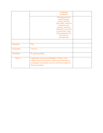 na ekranie komputera Oprogramowanie umoŜliwiające analizę obrazów (opis zdjęć, poprawa kontrastu oraz jasności, pomiary odległości oraz pola powierzchni, zapis skali pomiarowych dla róŜnych powiększeń) Instalacja Tak Gwarancja 24 m-ce Instrukcja W języku polskim Serwis organizacja serwisowa działająca w Polsce, czas reakcji serwisu 48 godzin w okresie gwarancyjnym, wymagane świadczenie serwisu równieŜ po upływie okresu gwarancji osłona od kurzu 2. Oświetlenie do światła przechodzącego i odbitego Źródło zimnego światła o mocy min. 150W Regulacja natęŜenia oświetlenia ze wskazaniem nastawionej wartości Wbudowany filtr konwersyjny Stabilna podstawa z ergonomicznym blatem roboczym 210x160mm, do obserwacji w jasnym i ciemnym polu widzenia w świetle przechodzącym z regulacją kąta padania światła Połączenie światłowodowe ze źródłem zimnego światła Oświetlacz pierścieniowy ze śwatłowodem do pracy w świetle odbitym 3. Kolorowa kamera cyfrowa Efektywna liczba pikseli: min. 5 milionów Przetwornik obrazu: min. 0,4 cala Złącze USB 2.0 Zewnętrzny układ sterowania z opcją podglądu i zapisu zdjęć na dysku Wybór ręczny lub automatyczny parametrów ekspozycji Tryb sterowania parametrami ekspozycji z komputera, podgląd obrazu w trybie „na Ŝywo” 1. Statyw Statyw mikroskopu badawczego z układem zoom min. 8:1 Płynna zmiana powiększeń typu zoom z optyką klasy APO Powiększenie głowicy mikroskopu regulowane w zakresie od 1x-8x Precyzyjny układ nastawiania ostrości i zmiany połoŜenia w osi Z Stabilna podstawa o wymiarach min. 370x440 mm z kolumną o wysokości min. 350mm Obiektyw klasy Plan-Achromat o powiększeniu 1x oraz odległości roboczej min. 81mm Apertura numeryczna dla powiększenia 80x min. 0,116, rozdzielczość min. 346 LP/mm Tubus trinokularny o kącie nachylenia 20º wyposaŜony w wyjście do kamery o podziale światła 100:0 / 0:100 Fabryczny adapter do kamery 1/2" o powiększeniu 0,63x Okulary 10x – 2 szt. o polu widzenia min. 23 mm, oba z korekcją dioptrii oraz muszlami ocznymi Regulacja odstępu między okularami Antystatyczna korekcja grubości szkiełka: 0-2mm, pierścień fazowy. Adapter do aparatu fotolustrzanki cyfrowej, z okularem typu Tak PL1-5x. Korpus lustrzanki cyfrowej klasy D 5000, z matrycą 12.3mln pikseli Tak i obrotowym ekranem o przekatnej 2.7”. Instalacja Tak Gwarancja 24 m-ce Instrukcja W języku polskim Serwis organizacja serwisowa działająca w Polsce, czas reakcji serwisu 48 godzin w okresie gwarancyjnym, wymagane świadczenie serwisu równieŜ po upływie okresu gwarancji Zadanie nr 6 Nazwa urządzenia: Mikroskop stereoskopowy, 1 szt Producent i model oferowanego aparatu…………………………………………………… Parametr Opis wymagań dla parametru Oferowane parametry 60mm, przeznaczone do obserwacji w jasnym polu i kontraście fazowym. a)wariant A: -CFI Plan Fluor 4x, N.A.0.13, odl.robocza W.D 16.4mm, pierścień fazowy DL, -CFI Achromat 10x, N.A.0.25, odl.robocza W.D.6.2mm, pierścień fazowy ADL (kontrast apodyzacyjny), -CFI Achromat 40x, N.A.0.55, odl.robocza W.D.2.1mm, pierścień fazowy ADL (kontrast apodyzacyjny). lub b)wariant B: - CFI Plan Fluor 4x, N.A.0.13 itd jak dla wariantu A - CFI Plan Fluor ELWD 20x, N.A.0.45, odl.robocza W.D.8.17.0mm, korekcja grubości szkiełka: 0-2mm, pierścień fazowy, - CFI Plan Fluor ELWD 40x, N.A.0.6, odl.robocza W.D.3.7-2.7mm, pierścieniowymi do kontrastu fazowego, 3pozycyjnych: przysłona PhL (powiększenie obiektywu 4x), Ph1 (powiększenie obiektywu 10-20x) i wolny przelot. Opcja- przysłona pierścieniowa Ph2, do obiektywów o powiększeniu 40x-60x. Wsuwki z przysłonami w 2-ch wersjach: z pokrętkami centrującymi i/lub z fabrycznie ustawionymi przysłonami. MoŜliwość zastosowania wsuwki do kontrastu Hoffmana (HMC). Regulowana przysłona aperturowa. Filtry umieszczane w układzie oświetlającym: niebieski (wybielający Tak typu NCB11), zielony, specjalnie do kontrastu fazowego i neutralny typu ND8 o przepuszczalności 12.5%. Okulary 10x, z regulacją dioptryjną i duŜym polem widzenia. Tak Średnica diafragmy pola (FOV) 22mm. Obiektywy klasy CFI (nieskończona długość tubusa) o długości parafokalnej minimum Tak nieruchoma. Stolik umieszczony na wysokości max.195mm, co gwarantuje optymalny ogląd preparatów na stoliku. Akrylowa wkładka w stoliku umoŜliwiająca podgląd obiektywów umieszczonych pod stolikiem. Mocowana do stolika i odejmowalna nasadka do przesuwu preparatu x,y. Współosiowe, nisko umieszczone z prawej strony pokrętki. Zakres przesuwu min.: 126x80mm. Nasadka musi akceptować standardowe płytki z mikro studzienkam oraz: uchwyt Terasaki, standardowe szkiełko podstawowe, płytkęhemacytometr. Tak Oświetlacz halogenowy 6-V-30W z fabrycznie ustawioną Ŝarówką. Regulowany zasilacz wbudowany w korpusie mikroskopu. Włącznik i pokrętka regulacji zasilania umieszczone z lewej strony, nisko nad stołem. Tak Kondensor typu ELWD (extra duŜa odległość robocza) o aperturze numerycznej N.A.0.3 i odległości roboczej min.75mm. Tak MoŜliwość zastosowania 2-ch wsuwek z przysłonami Tak Stabilny korpus z nasadką trinokularową i precyzyjnym ,2stopniowym (mikro/makro) mechanizmem ogniskującym działającym na rewolwer obiektywowy. Tak Współosiowe pokrętki mechanizmu ogniskującego, zapewniające przesuw makro i precyzyjny przesuw ogniskujący mikro. Przesuw makro37.7mm na obrót pokrętki, przesuw mikro0.2mm na obrót pokrętki. Pokrętki usytuowane nisko, ponad stołem, zapewniające wygodne połoŜenie rąk, bez potrzeby odrywania dłoni od stołu. Tak Nasadka trinokularowa zapewniająca podział światła pomiędzy okularami i tubusem pionowym: 100/0 i 0/100. Zakres regulacji rozstawienia tubusów nasadki okularowej: 5075mm. Tubusy ustawione pod kątem 45° względem poziomu, zapewniające ergonomiczną odległość źrenic okularów względem powierzchni stołu- 400mm. Tak 5-cio pozycyjn