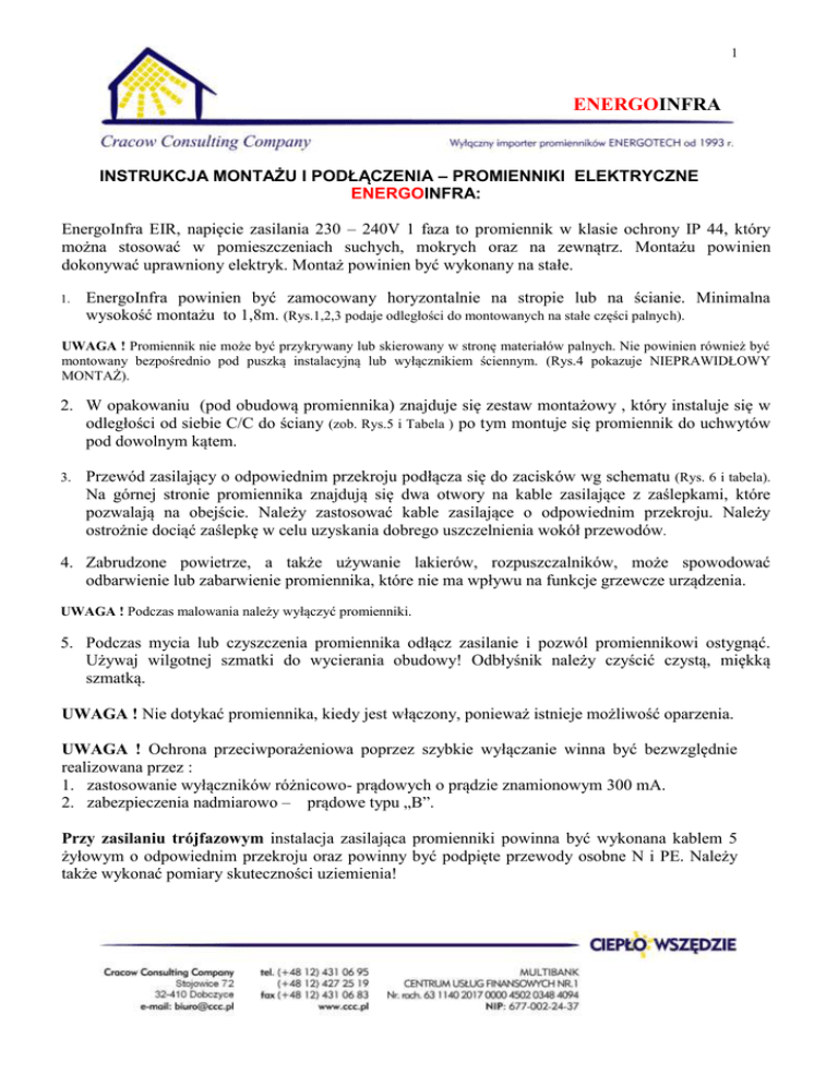 1 ENERGOINFRA INSTRUKCJA MONTAŻU I PODŁĄCZENIA – PROMIENNIKI ELEKTRYCZNE ENERGOINFRA: EnergoInfra EIR, napięcie zasilania 230 – 240V 1 faza to promiennik w klasie ochrony IP 44, który można stosować w pomieszczeniach suchych, mokrych oraz na zewnątrz. Montażu powinien dokonywać uprawniony elektryk. Montaż powinien być wykonany na stałe. 1. EnergoInfra powinien być zamocowany horyzontalnie na stropie lub na ścianie. Minimalna wysokość montażu to 1,8m. (Rys.1,2,3 podaje odległości do montowanych na stałe części palnych). UWAGA ! Promiennik nie może być przykrywany lub skierowany w stronę materiałów palnych. Nie powinien również być montowany bezpośrednio pod puszką instalacyjną lub wyłącznikiem ściennym. (Rys.4 pokazuje NIEPRAWIDŁOWY MONTAŻ). 2. W opakowaniu (pod obudową promiennika) znajduje się zestaw montażowy , który instaluje się w odległości od siebie C/C do ściany (zob. Rys.5 i Tabela ) po tym montuje się promiennik do uchwytów pod dowolnym kątem. 3. Przewód zasilający o odpowiednim przekroju podłącza się do zacisków wg schematu (Rys. 6 i tabela). Na górnej stronie promiennika znajdują się dwa otwory na kable zasilające z zaślepkami, które pozwalają na obejście. Należy zastosować kable zasilające o odpowiednim przekroju. Należy ostrożnie dociąć zaślepkę w celu uzyskania dobrego uszczelnienia wokół przewodów. 4. Zabrudzone powietrze, a także używanie lakierów, rozpuszczalników, może spowodować odbarwienie lub zabarwienie promiennika, które nie ma wpływu na funkcje grzewcze urządzenia. UWAGA ! Podczas malowania należy wyłączyć promienniki. 5. Podczas mycia lub czyszczenia promiennika odłącz zasilanie i pozwól promiennikowi ostygnąć. Używaj wilgotnej szmatki do wycierania obudowy! Odbłyśnik należy czyścić czystą, miękką szmatką. UWAGA ! Nie dotykać promiennika, kiedy jest włączony, ponieważ istnieje możliwość oparzenia. UWAGA ! Ochrona przeciwporażeniowa poprzez szybkie wyłączanie winna być bezwzględnie realizowana przez : 1. zastosowanie wyłączników różnicowo- prądowych o prądzie znamionowym 300 mA. 2. zabezpieczenia nadmiarowo – prądowe typu „B”. Przy zasilaniu trójfazowym instalacja zasilająca promienniki powinna być wykonana kablem 5 żyłowym o odpowiednim przekroju oraz powinny być podpięte przewody osobne N i PE. Należy także wykonać pomiary skuteczności uziemienia! 2 ENERGOINFRA Przy zasilaniu jednofazowym instalacja zasilająca promienniki powinna być wykonana kablem 3 żyłowym o odpowiednim przekroju oraz powinny być podpięte przewody osobne N i PE. Należy także wykonać pomiary skuteczności uziemienia! UWAGA!!! Przed podłączeniem promiennika ściągnij folię ochronną!!! Pod obudową promiennika znajduje się zestaw montażowy!!! UWAGA!!! Rysunek 1 Rysunek 2 Rysunek 3 Rysunek 4 Tabela Typ EIR 500 EIR 1000 EIR 1500 EIR 2000 230-240V 500-544 W 1000-1089 W 1500-1633 W 2000 W cm L 70 117 168 168 B 7,5 7,5 7,5 7,5 kg H 4 4 4 4 C/C 50 81 122 122 1,5 2,5 3,5 3,5 3 ENERGOINFRA Rysunek 5 Rysunek 6 Dla modeli EIR 500, 1000, 1500, 2000 z grzałkami na napięcie 230 V zasilanych napięciem 230 V. UWAGA! Grzałki są wrażliwe na wyższe harmoniczne – stosuj filtry ochronne. W zakładach, gdzie występują wyższe harmoniczne lub skoki napięcia, powstałe przez użytkowanie urządzeń sterowanych falownikami lub regulatorami tyrystorowymi lub inne urządzenia powodujące złą jakość prądu trwałość grzałek zależy od tej jakości, dlatego należy bezwzględnie stosować odpowiednie filtry ochronne. 4 ENERGOINFRA WARUNKI GWARANCJI: 1. Firma Cracow Consulting Company udziela Nabywcy gwarancji fabrycznej na okres 24 miesięcy ( 2 lata). 2. Cracow Consulting Company zapewnia Nabywcę o dobrej jakości sprzętu, na który wydawana jest niniejsza karta gwarancyjna. Cracow Consulting Company udziela na promiennik sufitowy gwarancji pod warunkiem, że promiennik będzie zainstalowany i użytkowany zgodnie z instrukcją montażową. Wszelkie przeróbki lub uszkodzenia mechaniczne spowodują utratę gwarancji . 3. Wady fabryczne sprzętu ujawnione w okresie gwarancji usuwane będą najszybciej, jak jest to możliwe. 4. Cracow Consulting Company zastrzega sobie prawo oceny, czy dana wada jest wada fabryczną. Należy pamiętać, ze używanie lakierów, działanie pyłów lub obecność innych zanieczyszczeń powietrza może powodować zmianę koloru obudowy promiennika lub emitorów. Jest to normalne zjawisko i nie ma wpływu na funkcje grzewcze promiennika. Podczas lakierowania należy promiennik wyłączyć. UWAGA! Jeżeli w obiekcie, w jakim są zamontowane promienniki występuje zanieczyszczenie powietrza (np. unosi się w powietrzu kurz, proch czy pył ) promienniki należy czyścić z zalegającego na nich kurzu, co najmniej 1 raz w tygodniu. 5. Okres gwarancji liczony jest od daty sprzedaży lub montażu. Informujemy, że sam dokument faktury VAT wystawiony przez firmę Cracow Consulting Company jest uznawany za kartę gwarancyjną. 6. W przypadku wady fabrycznej, koszty transportu promiennika do siedziby firmy ponosi: sprzedaż bez montażu- Nabywca dostarcza sprzęt do Punktu Serwisowego na swój koszt. Koszt dostawy powrotnej ponosi firma Cracow Consulting Company - sprzedaż z montażem- serwis gwarancyjny u Klienta na koszt Cracow Consulting Company 7. Liczba napraw, po dokonaniu których przysługuje prawo do wymiany sprzętu wynosi 3. 8. Gwarancja nie obejmuje odkształceń, przebarwień, itp., oraz elementów zużywających się ( element grzewczy, odbłyśnik). 9. Punktem serwisowym jest firma Cracow Consulting Company z siedzibą w: Stojowice 72, 32- 410 Dobczyce, tel. 12 431 06 95, 12 427 25 19 , fax.: 12 431 06 83. -