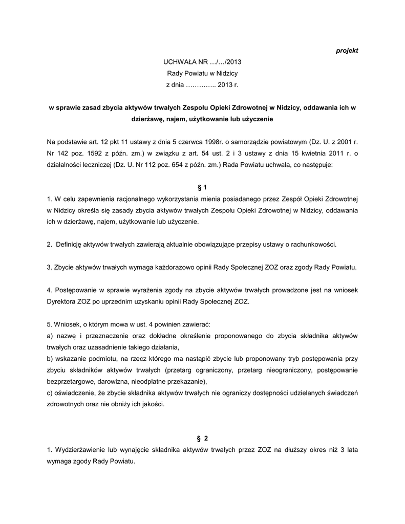 projekt UCHWAŁA NR …/…/2013 Rady Powiatu w Nidzicy z dnia ………….. 2013 r. w sprawie zasad zbycia aktywów trwałych Zespołu Opieki Zdrowotnej w Nidzicy, oddawania ich w dzierżawę, najem, użytkowanie lub użyczenie Na podstawie art. 12 pkt 11 ustawy z dnia 5 czerwca 1998r. o samorządzie powiatowym (Dz. U. z 2001 r. Nr 142 poz. 1592 z późn. zm.) w związku z art. 54 ust. 2 i 3 ustawy z dnia 15 kwietnia 2011 r. o działalności leczniczej (Dz. U. Nr 112 poz. 654 z późn. zm.) Rada Powiatu uchwala, co następuje: §1 1. W celu zapewnienia racjonalnego wykorzystania mienia posiadanego przez Zespół Opieki Zdrowotnej w Nidzicy określa się zasady zbycia aktywów trwałych Zespołu Opieki Zdrowotnej w Nidzicy, oddawania ich w dzierżawę, najem, użytkowanie lub użyczenie. 2. Definicję aktywów trwałych zawierają aktualnie obowiązujące przepisy ustawy o rachunkowości. 3. Zbycie aktywów trwałych wymaga każdorazowo opinii Rady Społecznej ZOZ oraz zgody Rady Powiatu. 4. Postępowanie w sprawie wyrażenia zgody na zbycie aktywów trwałych prowadzone jest na wniosek Dyrektora ZOZ po uprzednim uzyskaniu opinii Rady Społecznej ZOZ. 5. Wniosek, o którym mowa w ust. 4 powinien zawierać: a) nazwę i przeznaczenie oraz dokładne określenie proponowanego do zbycia składnika aktywów trwałych oraz uzasadnienie takiego działania, b) wskazanie podmiotu, na rzecz którego ma nastąpić zbycie lub proponowany tryb postępowania przy zbyciu składników aktywów trwałych (przetarg ograniczony, przetarg nieograniczony, postępowanie bezprzetargowe, darowizna, nieodpłatne przekazanie), c) oświadczenie, że zbycie składnika aktywów trwałych nie ograniczy dostępności udzielanych świadczeń zdrowotnych oraz nie obniży ich jakości. § 2 1. Wydzierżawienie lub wynajęcie składnika aktywów trwałych przez ZOZ na dłuższy okres niż 3 lata wymaga zgody Rady Powiatu. 2. Wydzierżawienie lub wynajęcie składnika aktywów trwałych przez ZOZ na okres do 3 lat wymaga uzyskania opinii Rady Społecznej. 3. Postępowanie w sprawie wyrażenia zgody na wydzierżawienie lub wynajem składnika aktywów trwałych określonego w ust. 1 prowadzone jest na wniosek Dyrektora ZOZ po uprzednim uzyskaniu opinii Rady Społecznej. 4. Wniosek o którym mowa w ust. 3 powinien zawierać: a) nazwę i przeznaczenie oraz dokładne określenie proponowanego do wydzierżawienia lub wynajęcia składnika aktywów trwałych oraz uzasadnienie takiego działania, b) wskazanie podmiotu, na rzecz którego ma nastąpić wydzierżawienie lub wynajęcie składników aktywów trwałych lub proponowany tryb postępowania przy wydzierżawieniu lub wynajęciu składników aktywów trwałych (przetarg ograniczony, przetarg nieograniczony, postępowanie bezprzetargowe, darowizna, nieodpłatne przekazanie), c)oświadczenie, że wydzierżawienie lub wynajęcie składnika aktywów trwałych nie ograniczy dostępności udzielanych świadczeń zdrowotnych oraz nie obniży ich jakości. 5. Umowę dzierżawy lub najmu składników aktywów trwałych należy sporządzić w formie pisemnej- w oparciu o przepisy Kodeksu Cywilnego. §3 Dyrektor ZOZ może oddać w użytkowanie lub użyczenie składnik aktywów trwałych na okres do 3 lat po uzyskaniu opinii Rady Społecznej, na podstawie pisemnej umowy na warunkach przewidzianych w odpowiednich przepisach Kodeksu Cywilnego. § 4 Dzierżawa, najem, użytkowanie lub użyczenie może być dokonane na niżej wymienione cele: 1) na potrzeby związane z opieką medyczną, 2) na działalność związaną z opieką medyczną, 3) na inne działalności nie kolidujące z przeznaczeniem nieruchomości, w przypadku braku chętnych do prowadzenia działalności wymienionej w pkt. 1 i 2 za zgodą Zarządu Powiatu. §5 Wykonanie uchwały powierza się Zarządowi Powiatu w Nidzicy oraz Dyrektorowi ZOZ w Nidzicy. §6 Traci moc Uchwała Nr XXXI/191/09 Rady Powiatu w Nidzicy z dnia 29 września 2009 r. w sprawie zasad zbywania, oddania w dzierżawę, najem, użytkowanie lub użyczenie przez samodzielny publiczny Zespół Opieki Zdrowotnej w Nidzicy majątku trwałego przekazanego Zespołowi w nieodpłatne użytkowanie wraz z późniejszymi zmianami oraz Uchwała Nr XXIV/4/2001 Rady Powiatu w Nidzicy z dnia 28 lutego 2001 r. w sprawie określenia standardu, przeznaczenia oraz zasad zakupu lub przyjęcia darowizny aparatury i sprzętu medycznego przez samodzielny publiczny Zespół Opieki Zdrowotnej w Nidzicy. §7 Uchwała wchodzi w życie z dniem podjęcia. Przewodniczący Rady Jacek Kosmala Opracowała: E.Bieniek UZASADNIENIE Uchwały Nr …/…/2013 Rady Powiatu w Nidzicy z dnia ………….. 2013 r. Zgodnie z art. 54 ust. 2 i 3 ustawy z dnia 15 kwietnia 2011 r. o działalności leczniczej zbycie aktywów trwałych samodzielnego publicznego zakładu opieki zdrowotnej oddawania ich w dzierżawę, najem, użytkowanie lub użyczenie może nastąpić wyłącznie na zasadach określonych przez podmiot tworzący. Uchwała zastępuje dotychczasową uchwałę Nr XXXI/191/09 Rady Powiatu w Nidzicy z dnia 29 września 2009 r. w sprawie zasad zbywania, oddania w dzierżawę, najem, użytkowanie lub użyczenie przez samodzielny publiczny Zespół Opieki Zdrowotnej w Nidzicy majątku trwałego przekazanego Zespołowi w nieodpłatne użytkowanie podjęta na podstawie ustawy z dnia 30 sierpnia 1991 r. o zakładach opieki zdrowotnej. Ustawa ta w 2011 r. została zastąpiona ustawą z dnia 15 kwietnia 2011r. o działalności leczniczej, w związku z czym zachodzi potrzeba podjęcia uchwały na podstawie aktualnie obowiązujących przepisów prawnych. Traci moc Uchwała Nr XXIV/4/2001 Rady Powiatu w Nidzicy z dnia 28 lutego 2001 r. w sprawie określenia standardu, przeznaczenia oraz zasad zakupu lub przyjęcia darowizny aparatury i sprzętu medycznego przez samodzielny publiczny Zespół Opieki Zdrowotnej w Nidzicy, bowiem zgodnie z art. 48 ust. 2 pkt 1 lit. a) ustawy z dnia 15 kwietnia 2011 r. o działa
