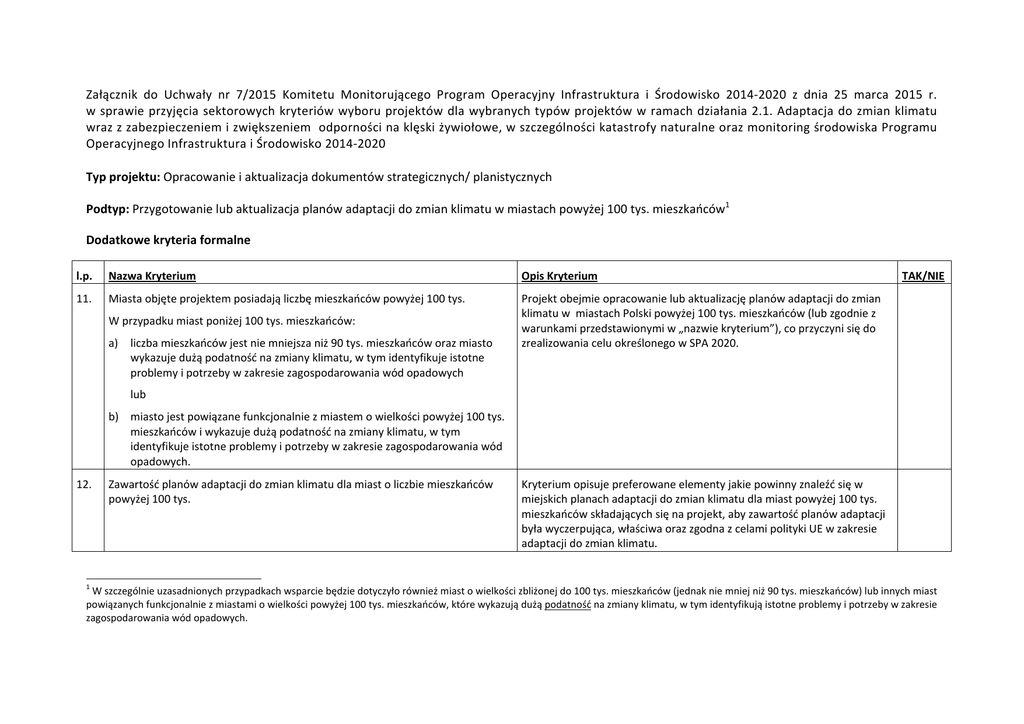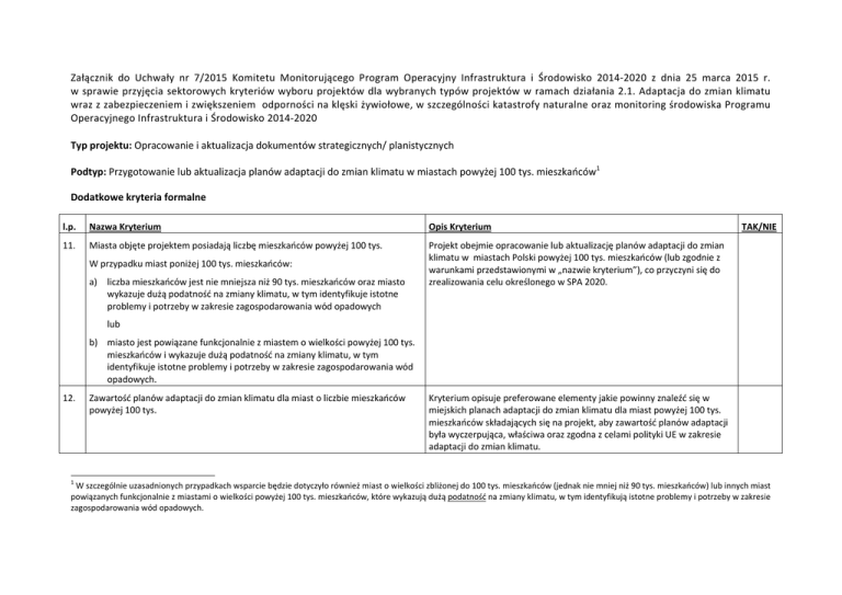 Załącznik do Uchwały nr 7/2015 Komitetu Monitorującego Program Operacyjny Infrastruktura i Środowisko 2014‐2020 z dnia 25 marca 2015 r. w sprawie przyjęcia sektorowych kryteriów wyboru projektów dla wybranych typów projektów w ramach działania 2.1. Adaptacja do zmian klimatu wraz z zabezpieczeniem i zwiększeniem odporności na klęski żywiołowe, w szczególności katastrofy naturalne oraz monitoring środowiska Programu Operacyjnego Infrastruktura i Środowisko 2014‐2020 Typ projektu: Opracowanie i aktualizacja dokumentów strategicznych/ planistycznych Podtyp: Przygotowanie lub aktualizacja planów adaptacji do zmian klimatu w miastach powyżej 100 tys. mieszkańców1 Dodatkowe kryteria formalne l.p. Nazwa Kryterium Opis Kryterium TAK/NIE 11. Miasta objęte projektem posiadają liczbę mieszkańców powyżej 100 tys. Projekt obejmie opracowanie lub aktualizację planów adaptacji do zmian klimatu w miastach Polski powyżej 100 tys. mieszkańców (lub zgodnie z warunkami przedstawionymi w „nazwie kryterium”), co przyczyni się do zrealizowania celu określonego w SPA 2020. W przypadku miast poniżej 100 tys. mieszkańców: a) liczba mieszkańców jest nie mniejsza niż 90 tys. mieszkańców oraz miasto wykazuje dużą podatność na zmiany klimatu, w tym identyfikuje istotne problemy i potrzeby w zakresie zagospodarowania wód opadowych lub b) miasto jest powiązane funkcjonalnie z miastem o wielkości powyżej 100 tys. mieszkańców i wykazuje dużą podatność na zmiany klimatu, w tym identyfikuje istotne problemy i potrzeby w zakresie zagospodarowania wód opadowych. 12. 1 Zawartość planów adaptacji do zmian klimatu dla miast o liczbie mieszkańców powyżej 100 tys. Kryterium opisuje preferowane elementy jakie powinny znaleźć się w miejskich planach adaptacji do zmian klimatu dla miast powyżej 100 tys. mieszkańców składających się na projekt, aby zawartość planów adaptacji była wyczerpująca, właściwa oraz zgodna z celami polityki UE w zakresie adaptacji do zmian klimatu. W szczególnie uzasadnionych przypadkach wsparcie będzie dotyczyło również miast o wielkości zbliżonej do 100 tys. mieszkańców (jednak nie mniej niż 90 tys. mieszkańców) lub innych miast powiązanych funkcjonalnie z miastami o wielkości powyżej 100 tys. mieszkańców, które wykazują dużą podatność na zmiany klimatu, w tym identyfikują istotne problemy i potrzeby w zakresie zagospodarowania wód opadowych. Opracowanie (plan adaptacji do zmian klimatu dla miasta powyżej 100 tys. mieszkańców) zawiera/obejmuje następujące elementy: 1. ocenę podatności na czynniki klimatyczne, a w tym analizę wrażliwości, 2. analizę opcji adaptacyjnych, 3. ocenę opcji adaptacyjnych, 4. wybór opcji adaptacyjnych, 5. działania monitoringowe i ewaluację działań adaptacyjnych. Zasady oceny kryterium 1. Liczba miast powyżej 100 tys. mieszkańców objętych projektem Kryterium opisuje ile miast 100 tys. przystąpi do projektu Jeżeli do projektu przystąpi liczba miast powyżej 100 tys. mieszkańców: 3 p. – powyżej 25 miast w Polsce o liczbie mieszkańców powyżej 100 tys. 2 2 p. – 15‐24 miast w Polsce o liczbie mieszkańców powyżej 100 tys. 1 p. – 1‐14 miast w Polsce o liczbie mieszkańców powyżej 100 tys. Jeżeli podpisano porozumienia z: 3 p. – więcej niż 25 miastami 1 2 p. – 15‐24 miastami 1 p. – 1‐14 miastami Powołanie jednostki realizującej projekt 1 p. – tak 1 2. 3. Liczba porozumień zawartych z miastami Kryterium opisuje z iloma miastami podpisano porozumienia w zakresie realizacji projektu Przygotowanie projektu ‐ gotowość do realizacji inwestycji (przygotowanie instytucjonalne do wdrażania) Przygotowanie instytucjonalne do wdrażania – powołanie jednostki realizującej projekt Suma Wynik Opis kryterium Max. punktacja Kryteria Waga Nr Punktacja Kryteria merytoryczne I stopnia 6 3 1 10 Typ projektu: Wsparcie ponadregionalnych systemów małej retencji Dodatkowe kryteria formalne l.p. Nazwa Kryterium Opis Kryterium TAK/NIE 11. Projekt realizowany jest na obszarze więcej niż jednego województwa Weryfikowany jest ponadregionalnym zasięg projektu (powyżej jednego województwa). 12. Projekt stanowi kontynuację wsparcia dla projektów z zakresu małej retencji realizowanych w POIiŚ w perspektywie finansowej 2007‐2013 Zakres rzeczowy projektu obejmuje tereny nieobjęte wsparciem w perspektywie 2007‐2013 lub przyczynia się do rozszerzenia i utrwalenia efektów udzielonego wsparcia. 13. Projekt wykorzystuje kompleksowe zabiegi łączące przyjazne środowisku Ocena zgodności planowanych działań z metodami opisanymi w przedmiotowych metody przyrodnicze i techniczne oraz inne najlepsze praktyki wytycznych. przedstawione w Wytycznych do realizacji obiektów małej retencji w Nadleśnictwach oraz Wytycznych do realizacji małej retencji w górach 14. Objętość retencjonowanej wody Kryterium określa przewidywaną liczbę m3 retencjonowanej wody. Dla projektów dotyczących retencji nizinnej projekt spełnia kryterium jeżeli planowana objętość retencjonowanej wody wynosi co najmniej 2,1 mln m3. Dla projektów dotyczących retencji górskiej projekt spełnia kryterium jeżeli planowana objętość retencjonowanej wody wynosi co najmniej 0,4 mln m3. Zasady oceny kryterium 1. Powierzchnia oddziaływania projektu Przy pomocy tego kryterium określa się łączny obszar (w ha), jaki będzie 4 p. –10 000 i powyżej ha 8 Wynik Opis kryterium Max. punktacja Kryteria Waga Nr Punktacja Kryteria merytoryczne I stopnia 2 poddany oddziaływaniu wskutek realizacji projektu 3 p. – 5 000 – 9 999 ha 2 p. – 1 000 – 4 999 ha 1 p. – 200 – 999 ha 0 p. – do 199 ha 2. 3. Liczba obiektów piętrzących wodę lub spowalniających jej odpływ Przygotowanie projektu ‐ gotowość do realizacji inwestycji (własność gruntów, i przygotowanie instytucjonalne do wdrażania –powołanie jednostki realizującej projekt) W