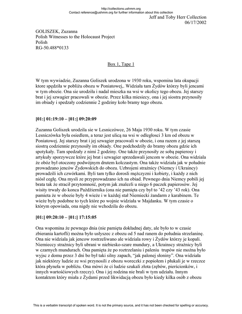 http://collections.ushmm.org Contact [email protected] for further information about this collection Jeff and Toby Herr Collection 06/17/2002 GOLISZEK, Zuzanna Polish Witnesses to the Holocaust Project Polish RG-50.488*0133 Box 1, Tape 1 W tym wywiadzie, Zuzanna Goliszek urodzona w 1930 roku, wspomina lata okupacji ktore spędziła w pobliżu obozu w Poniatowej,. Widziała tam Żydów ktòrzy byli jencami w tym obozie. Ona sie urodziła i nadal mieszka na wsi w okolicy tego obozu. Jej starszy brat i jej szwagier pracowali w obozie. Przez kilka miesiecy, ona i jej siostra przynosiły im obiady i spedzały codziennie 2 godziny koło bramy tego obozu. [01:] 01:19:10 – [01:] 09:20:09 Zuzanna Goliszek urodzila sie w Lesniczówce, 26 Maja 1930 roku. W tym czasie Lesniczówka była osiedlem, a teraz jest ulicą na wsi w odległosci 3 km od obozu w Poniatowej. Jej starszy brat i jej szwagier pracowali w obozie, i ona razem z jej starszą siostrą codziennie przynosiły im obiady. One podchodziły do bramy obozu gdzie ich spotykały. Tam spedzały z nimi 2 godziny. One także przynosiły ze sobą papierosy i artykuły sporzywcze ktòre jej brat i szwagier sprzedawali jencom w obozie. Ona widziala że obóz był otoczony podwójnym drutem kolczastym. Ona także widziała jak w południe prowadzano jenców Żydowskich do obozu. Uzbrojeni strażnicy (Niemcy i Ukraincy) prowadzili ich czwórkami. Byli tam tylko dorosli mężczyzni i kobiety, i każdy z nich niósł cegłę. Ona mysli ze przyprowadzano ich na obiad. Pewnego dnia Niemcy pobili jej brata tak że stracił przytomność, potym jak znalezli u niego 6 paczek papierosów. Jej wisity trwały do konca Paźdźiernika (ona nie pamięta czy był to ’42 czy ’43 rok). Ona pamieta że w obozie były 4 wieże i w każdej stał Niemiecki żandarm z karabinem. Te wieże były podobne to tych które po wojnie widziała w Majdanku. W tym czasie o ktòrym opowiada, ona nigdy nie wchodzila do obozu. [01:] 09:20:10 – [01:] 17:15:05 Ona wspomina że pewnego dnia (nie pamięta dokładnej daty, ale było to w czasie zbierania kartofli) można było usłyszec z obozu od 5 nad ranem do południa strzelaninę. Ona nie widziala jak jencow rostrzeliwano ale widziala rowy i Żydów którzy je kopali. Niemieccy strażnicy byli ubrani w niebiesko-szare mundury, a Ukrainscy strażnicy byli w czarnych mundurach. Ona pamięta że po roztrzelaniu i paleniu trupów nie można było wyjsc z domu przez 3 dni bo był taki silny zapach, “jak palonej słoniny”. Ona widziała jak niektórzy ludzie ze wsi przynosili z obozu woreczki z popiołem i płukali je w rzeczce która płyneła w pobliżu. Ona mòwi że ci ludzie szukali złota (zębów, pierścionków, i innych wartośćiowych rzeczy). Ona i jej rodzina nie brali w tym udziału. Innym kontaktem który miała z Żydami przed likwidacją obozu było kiedy kilka osób z obozu This is a verbatim transcript of spoken word. It is not the primary source, and it has not been checked for spelling or accuracy. http://collections.ushmm.org Contact [email protected] for further information about this collection Jeff and Toby Herr Collection 06/17/2002 prosiło ją żeby coś im kupić w miejscowym sklepie. Oni rozmawiali z nią po Polsku, ale ona mysli że mogli byc Czechami, albo z Wiednia czy getta Warszawskiego. Wyglądali wygłodzeni i byli bardzo chudzi. [01:] 17:15:06 – [01:] 24:53:05 Inne wydarzenia o których opowiada jak widziała kilkakrotnie transporty Żydow prowadzonych z Nałęczowa do Opola, skąd potem ich prowadzono do obozu. Ukrainscy strażnicy na koniach ich eskortowali. Ci Żydzi (było tam około 300 osób w każdym transporcie) wyglądali bardzo zmęczeni. Ich walizki byly wiezione na furmankach. Ona pamieta jak raz starsza kobieta, ubrana na czarno, ktòra jechała na furmance zeszła na pole, widocznie za potrzebą. Ta kobieta została w tyle, bo furmanka się nie zatrzymała, i była roztrzelana na miejscu. Ona to widziała z bliska (mniej wiecej 20 metròw) ponieważ jej siostra mieszkała koło drogi gdzie prowadzono Żydòw. Na pytanie wywiadowcy odpowiada że nie znała na wsi nikogo kto ukrywał Żydòw w czasie okupacji. Mowi także że kiedy ona kupowała dla Żydów to była sama w niebezpieczenstwie. Po wyzwoleniu ona i jej rodzina chodzili do obozu, ale wzieli z tamtąd tylko mydło, chociaż tam było także powidło. Oni się bali że może byc zatrute. This is a verbatim transcript of spoken word. It is not the primary source, and it has not been checked for spelling or accuracy.