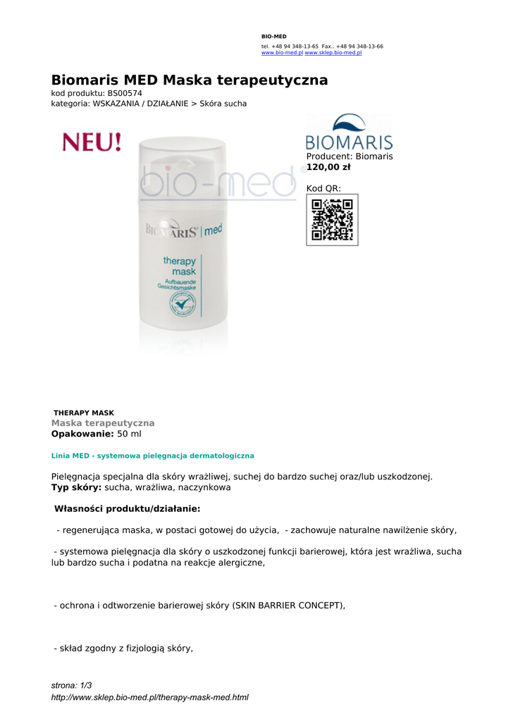 BIO-MED tel. +48 94 348-13-65 Fax.. +48 94 348-13-66 www.bio-med.pl www.sklep.bio-med.pl Biomaris MED Maska terapeutyczna kod produktu: BS00574 kategoria: WSKAZANIA / DZIAŁANIE > Skóra sucha Producent: Biomaris 120,00 zł Kod QR: THERAPY MASK Maska terapeutyczna Opakowanie: 50 ml Linia MED - systemowa pielęgnacja dermatologiczna Pielęgnacja specjalna dla skóry wrażliwej, suchej do bardzo suchej oraz/lub uszkodzonej. Typ skóry: sucha, wrażliwa, naczynkowa Własności produktu/działanie: - regenerująca maska, w postaci gotowej do użycia, - zachowuje naturalne nawilżenie skóry, - systemowa pielęgnacja dla skóry o uszkodzonej funkcji barierowej, która jest wrażliwa, sucha lub bardzo sucha i podatna na reakcje alergiczne, - ochrona i odtworzenie barierowej skóry (SKIN BARRIER CONCEPT), - skład zgodny z fizjologią skóry, strona: 1/3 http://www.sklep.bio-med.pl/therapy-mask-med.html - remineralizuje i rewitalizuje podrażnioną skórę, - bogaty w naturalne witaminy (A, D, E, B5), - bogaty w niezbędne kwasy tłuszczowe (omega-3 oraz kwas gamma-linolenowy), - ma działanie łagodzące, - testowany dermatologicznie przez Derma Consult GmbH, - przynosi ulgę w świądzie, - testowany i oceniony pozytywnie jako część codziennego programu pielęgnacji przez członków Stowarzyszenia AZS w Niemczech i osoby cierpiące na łuszczycę, - nie zawiera: barwników, konwencjonalnych emulgatorów, konserwantów, silikonu i olejów mineralnych, środków zapachowych. Składniki aktywne: • głębinowa woda morska • naturalny czynnik ochrony komórek: Ectoine • ekstrakt z koralowca Pseudopterogoria Elisabethae • ekstrakt z pąków kwiatów kaparów • olej z amarantusa • olej z pestek czarnej porzeczki • olej z wiesiołka • olej jojoba • olej z awokado • olej babassu • masło shea • prowitamina B5 • naturalna witamina E Stosowanie: Po oczyszczeniu stosować grubą warstwę na skórę twarzy, szyi i dekoltu; pozostawić na 15-20 minut. Łagodną chusteczką zdjąć pozostałość. W przypadku skóry suchej i wymagającej użyć kremu stosowanego na dzien lub na noc. strona: 2/3 http://www.sklep.bio-med.pl/therapy-mask-med.html Postać: emulsja o/w zaw. lipidów: 30% pH: 4.9-5.1 INCI Declaration [CTFA]: Aqua [Water], Maris Aqua [Sea Water], Cetearyl Alcohol, Glycerin, Butyrospermum Parkii (Shea Butter), Glyceryl Stearate, Candelilla/Jojoba/Rice Bran Polyglyceryl-3 Esters, Orbignya Oleifera Seed Oil, Magnesium Aluminum Silicate, Hydrogenated Jojoba Oil, Persea Gratissima (Avocado) Oil, Amaranthus Caudatus Seed Extract, Ribes Nigrum (Black Currant) Seed Oil, Oenothera Biennis (Evening Primrose) Oil, Carthamus Tinctorius (Safflower) Seed Oil, Panthenol, Caprylic/Capric Triglyceride, Octyldodecyl Myristate, Capparis Spinosa Fruit Extract, Sodium Stearoyl Lactylate, Ectoin, Simmondsia Chinensis (Jojoba) Seed Oil, Xanthan Gum, Glyceryl Caprylate, Sodium Levulinate, Sodium Anisate, Tocopherol, Sea Whip Extract strona: 3/3 http://www.sklep.bio-med.pl/therapy-mask-med.html