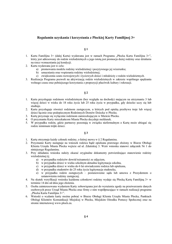 Regulamin uzyskania i korzystania z Płockiej Karty Familijnej 3+ §1 1. 2. 3. Karta Familijna 3+ (dalej Karta) wydawana jest w ramach Programu „Płocka Karta Familijna 3+”, który jest adresowany do rodzin wielodzietnych a jego istotą jest promocja dużej rodziny oraz działania na rzecz wzmacniania jej kondycji. Karta wydawana jest w celu: a) promowania modelu rodziny wielodzietnej i pozytywnego jej wizerunku; b) umacniania oraz wspierania rodziny wielodzietnej; c) zwiększenia szans rozwojowych i życiowych dzieci i młodzieży z rodzin wielodzietnych. Realizacja Programu pozwoli na aktywizację rodzin wielodzietnych w zakresie wspólnego spędzania wolnego czasu oraz pełniejszego korzystania z propozycji placówek kultury i rekreacji. §2 1. 2. 3. 4. 5. Karta przysługuje rodzinom wielodzietnym (bez względu na dochody) mającym na utrzymaniu 3 lub więcej dzieci w wieku do 18 roku życia lub 25 roku życia w przypadku, gdy dziecko uczy się lub studiuje. Karta przysługuje również rodzinom zastępczym, u których pod opieką przebywa troje lub więcej dzieci łącznie oraz podopiecznym Rodzinnych Domów Dziecka w Płocku. Kartę przyznaje się wyłącznie rodzinom zamieszkującym w Mieście Płocku. O przyznaniu Karty mieszkańcom Miasta Płocka decyduje meldunek. W przypadku rodzin, gdzie partnerzy pozostają w związku nieformalnym o Kartę może ubiegać się rodzic minimum trójki dzieci. §3 1. 2. 3. 4. 5. 6. Kartę otrzymuje każdy członek rodziny, o której mowa w § 2 Regulaminu. Przyznanie Karty następuje na wniosek rodzica bądź opiekuna prawnego złożony w Biurze Obsługi Klienta Urzędu Miasta Płocka wejście od ul. Zduńskiej 3. Wzór wniosku stanowi załącznik Nr 1 do niniejszego Regulaminu. Przy składaniu wniosku należy okazać oryginalne dokumenty potwierdzające stanowienie rodziny wielodzietnej tj; a) w przypadku rodziców dowód tożsamości ze zdjęciem, b) w przypadku dzieci w wieku szkolnym aktualna legitymacja szkolna, c) w przypadku dzieci w wieku do 6 lat oświadczenie rodzica lub opiekuna, d) w przypadku studentów do 25 roku życia legitymacja studencka, e) w przypadku rodzin zastępczych – postanowienie sądu lub umowa z Prezydentem o ustanowieniu rodziny zastępczej. Na skutek weryfikacji wniosku każdemu członkowi rodziny wydaje się Płocką Kartę Familijną 3+ w terminie 14 dni od dnia jego złożenia. Osoba zainteresowana wydaniem Karty zobowiązana jest do wyrażenia zgody na przetwarzanie danych osobowych przez Urząd Miasta Płocka oraz firmy z nim współpracujące w ramach realizacji programu „Płocka Karta Familijna 3+”. Wnioski o wydanie karty można pobrać w Biurze Obsługi Klienta Urzędu Miasta Płocka, Punktach Obsługi Klientów Komunikacji Miejskiej w Płocku, Miejskim Ośrodku Pomocy Społecznej oraz na stronie internetowej www.plock.eu. §4 1. 2. 3. 4. 5. 6. 7. Okres ważności Karty wynosi 1 rok od daty wydania. Kartę można przedłużyć nie wcześniej niż dwa miesiące przed upływem okresu jej ważności. Wszystkie Karty wydane danej rodzinie tracą ważność z końcem roku kalendarzowego, w którym choćby jedno z dzieci osiągnie kryterium wiekowe określone w § 2 ust. 1. W przypadku meldunku czasowego karta będzie wydawana na czas zameldowania w Mieście Płocku. Karta posiada numer oraz dane osoby, na którą została wystawiona. Wzór karty stanowi Załącznik Nr 2 do niniejszego Regulaminu. Karty są ważne z dokumentem tożsamości. W przypadku dziecka nie posiadającego jeszcze własnego dokumentu, z dokumentem rodzica lub opiekuna prawnego wraz z jego Kartą. W przypadku zagubienia lub utraty Karty wnioskodawcy lub członka jego rodziny, wnioskodawca zobowiązany jest niezwłocznie zawiadomić o tym emitenta Karty. W celu ponownego uzyskania Karty wnioskodawca składa wniosek o wydanie Karty wraz z oświadczeniem o jej zagubieniu. W takim przypadku wydawany będzie duplikat Karty z zaznaczeniem „Duplikat”. §5 1. 2. Potwierdzeniem możliwości korzystania z ulg, które zostały przewidziane dla posiadaczy Karty jest komunikat/naklejka informująca o honorowaniu Płockiej Karty Familijnej 3+ umieszczona w witrynach firm i instytucji współpracujących z Urzędem Miasta Płocka przy realizacji Programu (Załącznik Nr 3 do niniejszego Regulaminu). Przy odbiorze Karty uprawniony otrzymuje aktualny katalog przysługujących ulg i zwolnień. Katalog będzie publikowany na stronie internetowej Urzędu Miasta Płocka wraz z informacją o nowych propozycjach dla posiadaczy Karty. §6 Emitentem Karty jest Urząd Miasta Płocka. Znalezioną Kartę należy zwrócić emitentowi.