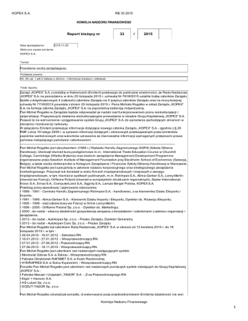 KOPEX S.A. RB 33 2015 KOMISJA NADZORU FINANSOWEGO Raport bieżący nr Data sporządzenia: 33 / 2015 2015-11-25 Skróc ona nazwa emitenta KOPEX S.A. Temat Powołanie osoby zarządzającej. Podstawa prawna Art. 56 ust. 1 pkt 2 Ustawy o oferc ie - informac je bieżąc e i okresowe Treść raportu: Zarząd „KOPEX” S.A. z siedzibą w Katowicach (Emitent) przekazuje do publicznej wiadomości, że Rada Nadzorcza „KOPEX” S.A. na posiedzeniu w dniu 25 listopada 2015 r. uchwałą Nr 76/VII/2015 ustaliła liczbę członków Zarządu Spółki z dotychczasowych 4 (czterech) członków Zarządu na 5 (pięciu) członków Zarządu oraz na mocy kolejnej uchwały Nr 77/VII/2015 powołała z dniem 25 listopada 2015 r. Pana Michała Rogatko w skład Zarządu „KOPEX” S.A. na funkcję członka Zarządu „KOPEX” S.A. na pięcioletnią kadencję indywidualną. Pan Michał Rogatko w Zarządzie będzie odpowiadał za nadzór nad funkcjonowaniem pionu restrukturyzacji i optymalizacji. Przyspieszy to działania restrukturyzacyjne prowadzone w obrębie Grupy Kapitałowej „KOPEX” S.A. Pozwoli to na wzmocnienie i przygotowanie spółek Grupy „KOPEX” S.A. do sprostania zachodzącym zmianom w otoczeniu i konkurencji rynkowej. W załączeniu Emitent przekazuje informacje dotyczące nowego członka Zarządu „KOPEX” S.A. - zgodnie z § 28 RMF z dnia 19 lutego 2009 r. w sprawie informacji bieżących i okresowych przekazywanych przez emitentów papierów wartościowych oraz warunków uznawania za równoważne informacji wymaganych przepisami prawa państwa niebędącego państwem członkowskim. ----------------------------------------------------------------------------------------------------------------------------------------------Pan Michał Rogatko jest absolwentem (1988 r.) Wydziału Handlu Zagranicznego SGPiS (Szkoła Główna Handlowa). Ukończył również kursy podyplomowe m.in.: International Trade Education Course w Churchill College, Cambridge (Wielka Brytania) oraz studium zarządzania Management Development Programme organizowane przez Swedish Institute of Management Foundation przy Stockholm School of Economics (Szwecja, Belgia), a także studia doktoranckie w Kolegium Zarządzania i Finansów Szkoły Głównej Handlowej w Warszawie. Pan Michał Rogatko jest specjalistą w zakresie nadzoru korporacyjnego oraz strategicznego zarządzania marketingowego. Pracował lub doradzał w wielu firmach międzynarodowych i krajowych o zasięgu międzynarodowym, w tym również w spółkach publicznych, m.in. Rolimpex S.A., Alima-Gerber S.A., Leroy-Merlin (również we Francji), Oriflame Poland (również w europejskich strukturach regionalnych), Zepter International, Kross S.A., Emax S.A., ComputerLand S.A., Sygnity S.A., Lampe Berger Polska, KOPEX S.A. Przebieg pracy zawodowej i zajmowane stanowiska: • 1988 - 1991 - Centrala Handlu Zagranicznego Rolimpex S.A. - handlowiec, z-ca kierownika Działu Eksportu i Importu; • 1991 - 1995 - Alima-Gerber S.A. - Kierownik Działu Importu i Eksportu, Dyrektor ds. Rozwoju Eksportu; • 1995 - 1996 - staż szkoleniowy we Francji w firmie Leroy-Merlin; • 1996 - 2000 - Oriflame Poland Sp. z o.o. - Dyrektor ds. Marketingu; • 2000 - do nadal - własna działalność gospodarcza związana z doradztwem i szkoleniami z zakresu organizacji i zarządzania, • 2013 - do nadal - Autokopex Sp. z o.o. - Prezes Zarządu, Dyrektor Generalny • 2013 - do nadal - Autokopex Cars Sp. z o.o. - Prezes Zarządu Pan Michał Rogatko był członkiem Rady Nadzorczej „KOPEX” S.A. w okresie od 12 kwietnia 2010 r. do 18 listopada 2015 r. w tym : • 26.04.2010 - 16.01.2012 - Sekretarz RN • 16.01.2012 - 27.01.2012 - Wiceprzewodniczący RN • 27.01.2012 - 27.06.2012 - Przewodniczący RN • 27.06.2012 - 18.11.2015 - Wiceprzewodniczący RN. Pan Michał Rogatko jest członkiem rad nadzorczych następujących spółek: • Mostostal Zabrze S.A. w Zabrzu - Wiceprzewodniczący RN • Fabryka Obrabiarek RAFAMET S.A. w Kuźni Raciborskiej, • HYDRAPRES S.A. w Solcu Kujawskim - Wiceprzewodniczący RN Ponadto Pan Michał Rogatko jest członkiem rad nadzorczych poniższych spółek należących do Grupy Kapitałowej „KOPEX” S.A. : • Fabryka Maszyn i Urządzeń „TAGOR” S.A. - Z-ca Przewodniczącego RN • Elgór + Hansen S.A. • HS Lubań Sp. z o.o. • DOZUT-TAGOR Sp. z o.o. Pan Michał Rogatko oświadczył ponadto, iż wykonywana poza przedsiębiorstwem Emitenta działalność nie jest Komisja Nadzoru Finansowego 1 KOPEX S.A. RB 33 2015 Pan Michał Rogatko oświadczył ponadto, iż wykonywana poza przedsiębiorstwem Emitenta działalność nie jest konkurencyjna w stosunku do wykonywanej przez Emitenta, oraz nie uczestniczy w spółce konkurencyjnej jako wspólnik spółki cywilnej, spółki osobowej lub jako członek organu spółki kapitałowej, a także nie uczestniczy w innej konkurencyjnej osobie prawnej jako członek jej organu. Pan Michał Rogatko oświadczył, że nie posiada osobistych, faktycznych lub organizacyjnych powiązań z akcjonariuszem „KOPEX” S.A. dysponującym ponad 5% ogólnej liczby głosów na walnym zgromadzeniu akcjonariuszy. Pan Michał Rogatko oświadczył ponadto, że nie posiada akcji spółki „KOPEX” S.A. oraz akcji bądź udziałów w spółkach zależnych od „KOPEX” S.A. Zgodnie ze złożonym oświadczeniem Pan Michał Rogatko nie figuruje w Rejestrze Dłużników Niewypłacalnych, prowadzonym na podstawie ustawy o KRS. Podstawa prawna: § 5 ust. 1 pkt 22 w związku z § 28 Rozporządzenia Ministra Finansów z dnia 19.02.2009 r. w sprawie informacji bieżących i okresowych przekazywanych przez emitentów papierów wartościowych oraz warunków uznawania za równoważne informacji wymaganych przepisami prawa państwa niebędącego państwem członkowskim (t.j. Dz.U. z 2014 r. poz. 133). KOPEX Spółka Akc yjna (pełna nazwa emitenta) Elektromaszynowy (ele) KOPEX S.A. (skróc ona nazwa emitenta) 40-172 (sektor wg. klasyfika