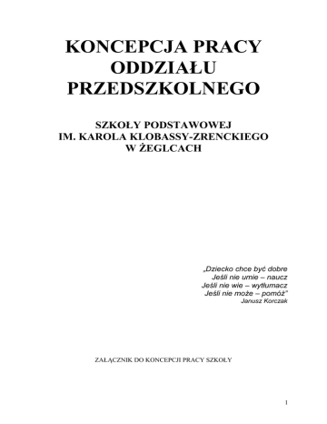 KONCEPCJA PRACY ODDZIAŁU PRZEDSZKOLNEGO SZKOŁY PODSTAWOWEJ IM. KAROLA KLOBASSY-ZRENCKIEGO W ŻEGLCACH „Dziecko chce być dobre Jeśli nie umie – naucz Jeśli nie wie – wytłumacz Jeśli nie może – pomóż” Janusz Korczak ZAŁĄCZNIK DO KONCEPCJI PRACY SZKOŁY 1 Temat wiodący: „ Książka jest dobra na wszystko” Uzasadnienie wyboru tematu wiodącego do rocznej koncepcji pracy oddziału przedszkolnego Dziecko kończące edukację przedszkolną i rozpoczynające naukę w szkole, zgodnie z nową podstawą programową wychowania przedszkolnego, powinno m.in. interesować się pisaniem i czytaniem oraz być do tego przygotowane, powinno umieć słuchać opowiadań, baśni i rozmawiać na ich temat. W miarę dorastania zainteresowania czytelnicze przedszkolaka stają się coraz rozleglejsze. Chętnie słucha "bajek łańcuszkowych", łańcuszkowych wierszyków, doskonali sobie umiejętność śledzenia losów bohatera, rozumie sens użytych zwrotów. Wielokrotnie przeżywa, potrafi słuchać ulubionych utworów codziennie, odkrywając wciąż na nowo zaskakujące historie, jeśli tylko w otoczeniu znajdzie się cierpliwy rodzic, brat, siostra czy nauczyciel. Umiejętności te zdobywa poprzez odpowiednio kierowane, wczesne kontakty z książką na terenie domu rodzinnego, ale przede wszystkim w przedszkolu i w szkole, co poprzez własne działania zamierzamy osiągnąć. Analizując formy aktywności dzieci przedszkolnych, na podstawie obserwacji nauczycieli, rozmów z dziećmi i rodzicami, widoczne jest, że dzieci preferują zabawy z wykorzystaniem różnych zabawek, oglądanie telewizji lub gry komputerowe. Ogólnie dzieci zbyt dużo czasu czasy spędzają przed ekranem telewizora lub komputera. Wiele oglądanych przez nich treści pozostaje bez komentarza lub opinii osób dorosłych, co pozwala dziecku przyjmować oglądane programy bez ich wartościowania. Przebywanie przed ekranem stało się sposobem spędzania wolnego czasu w rodzinie, eliminując nie tylko kontakty rodzinne, różne formy aktywności ruchowej, ale także wspólne kontakty z książką w domu czy wizyty z rodzicem w bibliotece. Często zapracowani rodzice nie mają czasu na długie rozmowy z dzieckiem czy systematyczne czytanie dzieciom literatury. Problemy te dotyczą również dzieci z naszej szkoły co stwierdzają nauczyciele obserwując i analizując normy zachowań w sytuacjach z życia przedszkolnego i szkolnego. Dla tych dzieci, które w domu nie zaznały przyjemności słuchania bajek na kolanach rodziców, dziadków czy starszego rodzeństwa, to właśnie przedszkole i szkoła stwarza szansę 2 inicjacji czytelniczej, w warunkach gorszych, bo w grupie zamiast indywidualnie, bez silnych kontaktów emocjonalnych, które cechuje czytanie w domu. Odbiór w grupie ma jednak też zalety- buduje poczucie przynależności, wzmacnia wspólne reakcje. Szukając sposobów przeciwdziałania dla tego stanu rzeczy Rada Pedagogiczna Szkoły podjęła decyzję, iż głównym celem pracy w oddziale przedszkolnym będzie rozwijanie i kształtowanie zainteresowań czytelniczych dzieci z wykorzystaniem bogatej literatury zgromadzonej w bibliotece. 1. Cel: Rozwijanie i kształtowanie podstawowych czynności czytelniczych z wykorzystaniem bogatej literatury dla dzieci. 2. Zadania: 1. Organizowanie sytuacji edukacyjnych kształtujących zainteresowania czytelnicze oraz gotowość do nauki czytania i pisania. 2. Wykorzystywanie wartości wychowawczych literatury w celu kształtowania właściwych postaw społecznych. 3. Nabywanie kompetencji językowych i komunikacyjnych. 3. Spodziewane efekty: Dziecko: - uważnie słucha tekstu czytanego i ocenia zachowania bohaterów, - wykazuje się wiedzą na temat poznawanych utworów literackich, - poprawnie komunikuje się w różnych sytuacjach życia społecznego, - prawidłowo posługuje się książką zgodnie z jej przeznaczeniem, - wie, kiedy należy stosować formy grzecznościowe i je stosuje w życiu codziennym, 3 - uczestniczy w wymianie książek pomiędzy dziećmi w grupie i szanuje cudzą własność, - wykorzystuje papierowe nieużytki do własnych działań plastycznych, - zna działania związane z ochroną środowiska i aktywnie w nich uczestniczy (gromadzi makulaturę). Rodzice i społeczeństwo lokalne: - interesują się życiem dziecka w środowisku przedszkolnym oraz działalnością placówki, - włączają się w działania związane z akcją „Książka jest dobra na wszystko", - włączają się w akcję zbiórki makulatury. 4. Praca z wychowankami - Systematyczne wizyty w szkolnej bibliotece, - Ustalenie zasad korzystania z książek, rola zakładki, - Uczestnictwo w naprawianiu uszkodzonych książek, - Systematyczne czytanie utworów literackich: J. Brzechwy J. Tuwima, L. Krzemienieckiej, H. Ożogowskiej, - Wykonywanie prac plastyczno-technicznych z wykorzystaniem papierowych nieużytków, prezentowanie wykonanych prac społeczności szkolnej, - Improwizacje literackie i muzyczne z wykorzystaniem wybranej literatury dziecięcej, - Wykonywanie ćwiczeń narządów mowy i oddechowych, - Tworzenie własnych opowiadań, wykonywanie składanych książeczek harmonijkowych, - Zorganizowanie wycieczek do: Miejskiej Biblioteki dla Dzieci i Młodzieży w Krośnie, - Prezentacja poznanych utworów literackich podczas uroczystości przedszkolnych, - Zajęcia wyciszające prowadzone w czasie czytania bajek i wierszy w bibliotece, - Organizowanie cyklicznych wizyt w Bibliotece Wiejskiej w celu czytania i wymiany książek, - Głośne czytanie dzieciom bajek, baśni, wierszy przez rodziców, osoby z życia publicznego, a także osoby reprezentujące różne zawody. 4 5. Dodatkowe atuty naszego OP - prowadzenie koła informatycznego, - organizowanie tradycyjnych uroczystości z udziałem zaproszonych gości - Dzień Babci i Dziadka, Dzień Matki i Ojca - uroczyste pasowanie na „Prawdziwego Przedszkolaka”, - uczestnictwo w konkursach plastycznych, - „Dzień