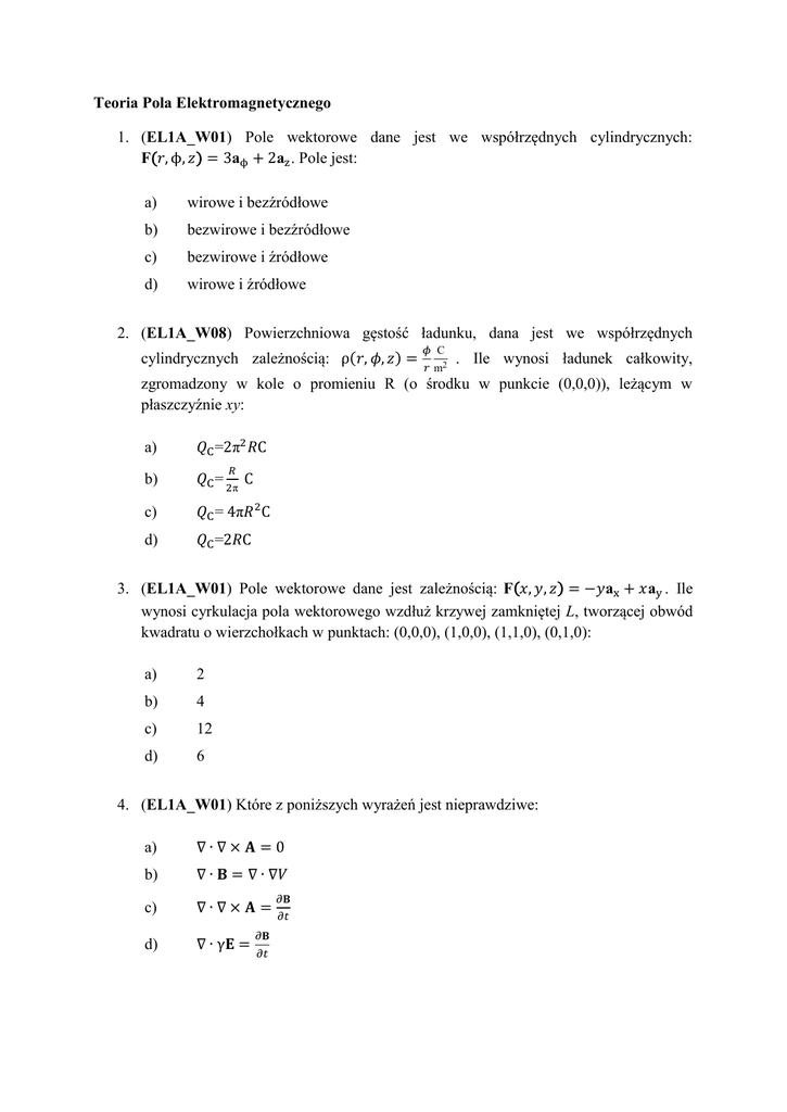 Teoria Pola Elektromagnetycznego 1. (EL1A_W01) Pole wektorowe dane jest we współrzędnych cylindrycznych: F(𝑟, ϕ, 𝑧) = 3aϕ + 2az . Pole jest: a) wirowe i bezźródłowe b) bezwirowe i bezźródłowe c) bezwirowe i źródłowe d) wirowe i źródłowe 2. (EL1A_W08) Powierzchniowa gęstość ładunku, dana jest we współrzędnych cylindrycznych zależnością: ρ(𝑟, 𝜙, 𝑧) = 𝜙 C 𝑟 m2 . Ile wynosi ładunek całkowity, zgromadzony w kole o promieniu R (o środku w punkcie (0,0,0)), leżącym w płaszczyźnie xy: a) 𝑄C =2π2 𝑅C b) 𝑄C = 2π C c) 𝑄C = 4π𝑅 2 C d) 𝑄C =2𝑅C 𝑅 3. (EL1A_W01) Pole wektorowe dane jest zależnością: F(𝑥, 𝑦, 𝑧) = −𝑦ax + 𝑥ay . Ile wynosi cyrkulacja pola wektorowego wzdłuż krzywej zamkniętej L, tworzącej obwód kwadratu o wierzchołkach w punktach: (0,0,0), (1,0,0), (1,1,0), (0,1,0): a) 2 b) 4 c) 12 d) 6 4. (EL1A_W01) Które z poniższych wyrażeń jest nieprawdziwe: a) ∇∙∇×𝐀=0 b) ∇ ∙ 𝐁 = ∇ ∙ ∇𝑉 c) ∇∙∇×𝐀= d) ∇ ∙ γ𝐄 = 𝜕𝐁 𝜕𝑡 𝜕𝐁 𝜕𝑡 5. (EL1A_W01) Która z poniższych funkcji może być rozwiązaniem Równania Laplace’a w pewnym obszarze przestrzeni 𝑹3 : 1 a) f(𝑥, 𝑦, 𝑧) = π 𝑥𝑦𝑧 b) g(𝑥, 𝑦, 𝑧) = 𝑥 2 𝑦𝑧 c) h(𝑥, 𝑦, 𝑧) = 𝑥𝑦 2 𝑧 d) k(𝑥, 𝑦, 𝑧) = 𝑥 2 + 𝑦 + 3𝑧 3 6. (EL1A_W01) Gradient pola skalarnego V( x, y, z) = xyz jest równy: a) grad V = xax + yay + zaz b) grad V = yzax + xzay + xyaz c) grad V = ax + ay + az d) grad V = 3 7. (EL1A_W01) Dywergencja pola wektorowego D = y2ax + x2ay + xyaz jest równa: a) div D = 0 b) div D = 2y+2x+2 c) div D = 5 d) div D = 2yax + 2xay + 2az 8. (EL1A_W01) Cechą pola potencjalnego nie jest: a) zerowa rotacja b) istnienie dywergencji c) istnienie potencjału skalarnego d) istnienie rotacji 9. (EL1A_W01) Cechą pola solenoidalnego nie jest: a) zerowa dywergencja b) niewystępowanie potencjału skalarnego c) zerowy gradient d) istnienie rotacji 10. (EL1A_W01) Trzy wektory, w kartezjańskim układzie współrzędnych: A = ax − 1 3ay + az , C = 3ax + ay + 2az , D = 2ax − ay , oraz wielkość skalarna: 𝑘 = 2 , 1 związane są zależnością: D = 𝐀 + 2 (𝐁 − 𝐂). Wówczas: a) B = 5ax + 5ay b) B = −5ax + ay + 2az c) B = 2ax + 2ay + 4az d) B = −ax + 5ay + 3az 11. (EL1A_W01) Trzy wektory, w kartezjańskim układzie współrzędnych: A = 2ax + 𝟑 𝟑 3ay − 8az , B = 2ax + 6ay + 4az , C = 𝟖 a + 𝟐 az , oraz wielkość skalarna: 𝑘 = 4 , y związane są zależnością: A = 𝐁 − 𝟐𝑘𝐂. Wówczas: a) k=4 b) k=3 c) k= 𝟐 d) 𝑘=3 1 𝟏 12. (EL1A_W01) Dywergencja wektora indukcji magnetycznej B jest równa zero: a) tylko w środowisku przewodzącym b) tylko w środowisku magnetycznym c) wszędzie d) tylko w środowisku dielektrycznym 13. (EL1A_W01) Zmieniające się w czasie pole magnetyczne wywołuje wirowe pole elektryczne. Przedstawia to równanie: a) rot𝐇 = 𝐣, 𝐣 = 𝛾𝐄 + b) div𝐃 = 𝜌 c) rot𝐄 = − 𝜕𝑡 d) div𝐁 = 0 𝜕𝐁 𝜕𝐃 𝜕𝑡 + 𝜌𝐯 14. (EL1A_W01) Dywergencja wektora gęstości prądu j jest równa zero: a) tylko w środowisku dielektrycznym b) tylko w środowisku przewodzącym c) tylko w przypadku prądów stałych d) w każdym przypadku 15. (EL1A_W01) W przypadku pola wektorowego A, w każdym przypadku prawidłowa jest tożsamość: a) ∇∙∇×A=0 b) ∇ ∙ ∇ × A = ∇2 × A c) ∇ × A = ∇𝐀 − ∂𝑡 d) ∇∙A=0 ∂𝐀 16. (EL1A_W08) W pewnym obszarze, rozkład potencjału pola elektrostatycznego dany jest zależnością: V(𝑥, 𝑦, 𝑧) = 8𝑥𝑦 + 4𝑥𝑦 2 − 4𝑥𝑧 2 . Czy w omawianym obszarze występuje ładunek elektryczny: a) brak ładunku w całym omawianym obszarze b) tak, w całym omawianym obszarze c) tak, dla x>0 d) tak, dla x+y>0 17. (EL1A_W08) Zmieniające się w czasie pole elektryczne wywołuje wirowe pole magnetyczne. Przedstawia to równanie: 𝜕𝐁 a) rot𝐄 = − 𝜕𝑡 b) rot𝐇 = 𝐣, 𝐣 = 𝛾𝐄 + c) div𝐁 = 0 d) 𝐁 = 𝜇𝐇 𝜕𝐃 𝜕𝑡 + 𝜌𝐯 18. (EL1A_W08) Całka liniowa ∮ 𝐇𝑑𝐥 po zaznaczonej krzywej, obejmującej trzy uzwojenia z prądami, jest równa: a) 35 A b) –35 A c) 65 A d) –65 A 19. (EL1A_W08) Pole pewnego wektora A w otoczeniu punktu M przedstawione jest na rysunku. Dla którego pola (a, b, c, d) w punkcie M divA>0: Odp c 20. (EL1A_W08) Obraz linii wektora gęstości prądu w przewodniku przedstawiony jest na rysunku. Która z czterech strzałek (a, b, c, d) przedstawia zwrot zgodny z wektorem gradV (V – potencjał pola elektrycznego): Odp a 21. (EL1A_W08) Jednostką przenikalności elektrycznej jest: a) b) c) d) F m H m C m Cm 22. (EL1A_W08) Źródłem pola elektrycznego jest dodatni ładunek punktowy. W punkcie C odległym od ładunku o rc=1 m natężenie pola elektrycznego Ec=120 V/m. Napięcie UAB między punktami: A odległym od ładunku o rA=0,25 m i B odległym od ładunku o rB=0,5 m jest równe: a) 240 V b) –240 V c) 120V d) 0V 23. (EL1A_W08) W pewnej ograniczonej objętości znajdują się w dowolny sposób położone 3 ładunki: Q1=200 µC, Q2=-300 µC i Q3=50 µC. Część linii sił pola elektrostatycznego wychodzi, a część wchodzi do tej objętości, przy czym: a) linii wchodzących jest tyle samo co wchodzących b) więcej jest linii wchodzących c) więcej jest linii wychodzących d) za mało danych, by określić ile których 24. (EL1A_W08) Kula o promieniu r0 wykonana z dielektryka o przenikalności elektrycznej ε jest naładowana równomiernie z gęstością objętościową ρ. Natężenie pola elektrycznego w punktach odległych o r r0 od środka kuli wyraża wzór: a) 𝐸= b) 𝐸= c) 𝐸= d) 𝐸= 𝜌 3𝜀 𝑟 𝜌 4𝜋𝜀 𝑟 𝜌4𝜋𝑟0 3𝜀 𝜌4𝜋 3𝜀 𝑟 𝑟 25. (EL1A_W08) Potencjał punktów pola elektrostatycznego w próżni określa wzór =ax3+by+cz2. Jeśli a = 3 kV/m2, b = 6 kV/m, c = –5 kV/m2, to