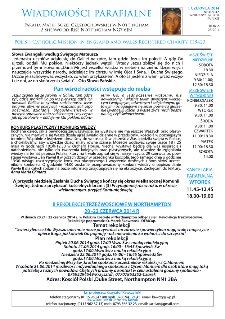 1 CZERWCA 2014 Wiadomości parafialne NIEDZIELA WNIEBOWSTĄPIENIE PAŃSKIE ! Parafia Matki Bożej Częstochowskiej w Nottingham 2 Sherwood Rise Nottingham NG7 6JN ROK A 23/2014 Polish Catholic Mission in England and Wales Registered Charity 1119423 Słowa Ewangelii według Świętego Mateusza Jedenastu uczniów udało się do Galilei na górę, tam gdzie Jezus im polecił. A gdy Go ujrzeli, oddali Mu pokłon. Niektórzy jednak wątpili. Wtedy Jezus zbliżył się do nich i przemówił tymi słowami: „Dana Mi jest wszelka władza w niebie i na ziemi. Idźcie więc i nauczajcie wszystkie narody, udzielając im chrztu w imię Ojca i Syna, i Ducha Świętego. Uczcie je zachowywać wszystko, co wam przykazałem. A oto Ja jestem z wami przez wszystkie dni, aż do skończenia świata”. . Oto Słowo Pańskie. MSZE ŚWIĘTE NIEDZIELNE SOBOTA 18.30 NIEDZIELA 9.30; 11.00; 12.30; 18.30 MSZE ŚWIĘTE W TYGODNIU PONIEDZIAŁEK 9.30; 11.00 WTOREK 9.30; 11.00 ŚRODA 9.30; 11.00 CZWARTEK 11.00; 18.30 PIĄTEK 11.00; 18.30 SOBOTA 14.00 Pan wśród radości wstępuje do nieba Jezus żegnał się ze swoimi w Galilei, tam gdzie żyli, gdzie spotkali Go po raz pierwszy, gdzie ich powołał. Galilea to symbol codzienności. Jezus pragnie, abyśmy odkrywali i rozpoznawali Jego obecność, działanie, błogosławieństwo w naszych sprawach dnia codziennego. I my często jak apostołowie – oddajemy Mu pokłon, adoru- jemy Go, a jednocześnie wątpimy, nie dowierzamy. I właśnie takim dwoistym: wierzącym i wątpiącym, odważnym i zalęknionym, gotowym i ociągającym się Jezus powierza głoszenie Ewangelii! Idźcie, a wasze życie niech będzie nauką, czyli świadectwem! !KONKURS PLASTYCZNY I KONKURS WIEDZY Kochane dzieci, jak z pewnością zauważyłyście, na wystawie nie ma jeszcze Waszych prac plastycznych. Nie martwcie się Wasze dzieła ujrzą światło dzienne w przedsionku kościoła w późniejszym terminie. Wspólnie z księdzem doszliśmy do wniosku, iż większość z Was spędziła święta w Polsce, a chcielibyśmy, aby wszystkie dzieci miały równe szanse. Możecie oddawać swoje prace 18 i 25 maja w godzinach 10:30-12:30 w Orchard House. Niechaj wystawa będzie dla was inspiracją i natchnieniem, nie tylko do tworzenia kolejnych prac plastycznych, ale również do zgłębiania wiedzy na temat papieża Polaka, który na trwałe zapisał się w naszym życiu. 29 czerwca br. powstanie wystawa „Jan Paweł II w oczach dzieci” w przedsionku kościoła, tego samego dnia o godzinie 13:30 nastąpi rozstrzygnięcie konkursu plastycznego i wręczenie drobnych upominków uczestnikom konkursu. O godzinie 14:00 zostanie przeprowadzony konkurs wiedzy o papieżu Janie Pawle II dla całych rodzin na bazie informacji znajdujących się na ekspozycji. Zachęcam do lektury. Anna Maria Chmara KANCELARIA PARAFIALNA W przyszłą niedzielę Zesłania Ducha Świętego kończy się okres wielkanocnej Komunii Świętej. Jedno z przykazań kościelnych brzmi: (3) Przynajmniej raz w roku, w okresie wielkanocnym, przyjąć Komunię świętą. II REKOLEKCJE TRZEŹWOŚCIOWE W NORTHAMPTON 20 -22 CZERWCA 2014 R WTOREK ! 11.45-12.45 18.00-19.00 W dniach 20,21 i 22 czerwca 2014 r. w Polskim Kościele w Northampton odbędą się II Rekolekcje Trzeźwościowe. Rekolekcje poprowadzi O. Marek Skowroński OFMCap. Temat rekolekcji "Uwierzyłem że Siła Wyższa ode mnie może przywrócić mi zdrowie i powierzyłem moją wolę i moje życie opiece Boga ,jakkolwiek Go pojmuję - od zniewolenia ku wolności do szczęścia" Plan rekolekcji Piątek 20.06.2014 godz.17:00 Msza Św z nauką rekolekcyjną Sobota 21.06.2014 godz.16:00 - 16:45 Spowiedź Św godz.17:00 Msza Św z nauką rekolekcyjną Niedziela 22.06.2014 godz.16 :00 - 16:45 Spowiedź Św godz.17:00 Msza Św z nauką rekolekcyjną Po niedzielnej Mszy Św ,krótkie spotkanie uczestników rekolekcji z O.Markiem W sobotę 21.06.2014 możliwość indywidualnego spotkania z Ojcem Markiem dla osób które mają taką potrzebę z różnych powodów. Chętnych prosimy o kontakt w celu ustalenia godziny spotkania 07595294549-Krzysztof , 07707863352-Czarek Adres: Kosciół Polski ,Duke Street, Northampton NN1 3BA ks. proboszcz Krzysztof Kawczyński telefon stacjonarny (0115 960 47 40) mob. 0780 941 21 45 email: [email protected] ks. wikariusz dr Jarosław Kozak telefon stacjonarny (0115 962 37 13) mob. 0793 566 32 23 email: [email protected] ! KATECHEZY PRZED CHRZTEM INTENCJE MSZY ŚWIĘTYCH W każdy piątek o godz. 19.15 odbywają się katechezy przed chrztem dziecka dla rodziców i chrzestnych. W czasie trwania kate- 31 maja 2014 r. SOBOTA chez można również załatwić wszelkie for- 14.00 Msza Święta dziękczynna w intencji wnuka Marka Krzanickiego z okazji 40 rocz. urodzin z prośbą o dalsze łaski i bło malności związane z chrztem w naszej gosławieństwo Boże - intencja babci parafii. 15.00 Ślub Marcelina Ciemka i Michał Wieczorek I SPOWIEDŹ ŚWIĘTA 18.00 Nabożeństwo majowe 5 czerwca 2014 r. (czwartek) od godz. 16.30 18.30 W intencji Lotniczek o Boże błogosławieństwo a dla Śp. 18.00 Zmarłych Lotniczek o wieczne zbawienie. I KOMUNIA ŚWIĘTA ! 7 czerwca 2014 r. (sobota) godz. 11.30 *** SPOWIEDŹ DLA BIERZMOWANYCH 20 czerwca 2014 r. (piątek) godz. 17.00 - 18.00 BIERZMOWANIE 21 czerwca 2014 r. (sobota) godz. 18.00 !! KURS DLA PROWADZĄCYCH FIRMY I SAMOZATRUDNIONYCH Osoby zainteresowane założeniem własnej firmy Ltd oraz self-employed zapraszamy na weekendowe szkolenie. W programie między innymi jak założyć firmę lub samodzielną działalność, sposób rejestracji w Inland Revenue i urzędach, jak pozyskiwać granty lub dofinansowanie. Kurs prowadzony jest przez Księgowego, członka Member of the Institute od Charted Accountants. Kontakt i zgloszenia Email : [email protected] lub Telefon : 01159 693000 OGŁOSZENIE POLSKIEJ SZKOŁY Polska Szkoła Przedmiotów Ojczystych w Nottingham poszukuje pracowników! Więcej informacji na stronie internetowej s