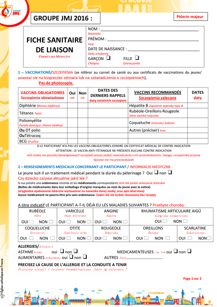 Pèlerin majeur GROUPE JMJ 2016 : NOM : _____________________________________________ Nazwisko FICHE SANITAIRE DE LIAISON FORMULARZ MEDYCZNY PRÉNOM : __________________________________________ Imię DATE DE NAISSANCE : _________________________________ Data urodzenia GARÇON FILLE Chłopiec Dziewczynka 1 – VACCINATIONS/SZCZEPIENIA (se référer au carnet de santé ou aux certificats de vaccinations du jeune/ powołać sie na ksiązeczke zdrowia lub na zaświadczenia o szczepieniach). Pas de photocopie. VACCINS OBLIGATOIRES Szczepienia obowiazkowe Oui Non tak nie DATES DES DERNIERS RAPPELS daty ostatnich szczepień Diphtérie Błonica (dyfteryt) VACCINS RECOMMANDÉS Szczepienia zalecane Tétanos Tężec Hépatite B Zapalenie wątroby typu B Rubéole-Oreillons-Rougeole Poliomyélite Coqueluche krztusiec/ koklusz DATES daty Odra-świnka-rożyczka Paraliż dziecięcy (Heine medina) Ou DT polio OuTétracoq BCG Gruźlica Autres (préciser) Inne SI LE PARTICIPANT N'A PAS LES VACCINS OBLIGATOIRES JOINDRE UN CERTIFICAT MÉDICAL DE CONTRE-INDICATION ATTENTION : LE VACCIN ANTI-TÉTANIQUE NE PRÉSENTE AUCUNE CONTRE-INDICATION Jeśli osoba nie posiada obowiązkowych szczepień prosze podać zaświadczenie o ich przeciwskazaniu. Uwaga, szczepionka przeciw tęzcowi nie ma przeciwskazań 2 – RENSEIGNEMENTS MEDICAUX CONCERNANT LE PARTICIPANT / INFORMACJE MEDYCZNE Le jeune suit-il un traitement médical pendant la durée du pèlerinage ? Oui Czy dziecko zażywa aktualnie jakiś lek ? non Si oui joindre une ordonnance récente et les médicaments correspondants Jeśli tak podać wskazanie lekarskie (Boîtes de médicaments dans leur emballage d’origine marquées au nom du jeune avec la notice) (oryginalne opakowanie lekarstw wystawione na nazwisko danej osoby, oraz opis lekarstwa) Aucun médicament ne pourra être pris sans ordonnance. Zaden lek nie będzie stosowany bez recepty A titre indicatif LE PARTICIPANT A-T-IL DÉJÀ EU LES MALADIES SUIVANTES ? Przebyte choroby : RUBÉOLE VARICELLE ANGINE RHUMATISME ARTICULAIRE AIGÜ Odra OUI NON COQUELUCHE Krztusiec OUI NON Ospa wietrzna OUI NON OTITE NON ALLERGIES/Alergie : ASTHMEAstma oui non ALIMENTAIRES pokarmowa oui non OUI OUI NON ROUGEOLE Rożyczka Zapalenie ucha OUI Gorączka reumatyczna Angina OUI NON OUI NON OREILLONS SCARLATINE Świnka Szkarlatyna NON MEDICAMENTEUSES na lek oui AUTRES Inne………………………………. OUI NON non PRECISEZ LA CAUSE DE L’ALLERGIE ET LA CONDUITE A TENIR Przyczyny alergii i leczenie farmakologiczne. Jakie są zalecenia ? Page 1 sur 2 P.A.I (projet d’accueil individualisé) en cours podać stan aktualnego leczenia ? oui non (joindre le protocole et toutes informations utiles) (podać wszystkie niezbędne informacje) ………………………………………………………………………………………………………………………………………………………………………………… …………………………………………………………………………………………………………………………………………………………… INDIQUEZ LES DIFFICULTÉS DE SANTÉ (MALADIE, ACCIDENT, CRISES CONVULSIVES, HOSPITALISATION, OPÉRATION, RÉÉDUCATION) EN PRÉCISANT LES PRÉCAUTIONS À PRENDRE. Prosze wskazać problemy zdrowotne (choroba, wypadek, drgawki, hospitalizacja, chirurgia, rehabilitacja) określając środki ostrożności. ………………………………………………………………………………………………………………………………………………………………………………… …………………………………………………………………………………………………………………………………………………………… 3 – INFORMATIONS COMPLEMENTAIRES Dodatkowe informacje obowiazkowe (à renseigner obligatoirement.) LE PARTICIPANT PORTE-T-IL DES LENTILLES : oui Czy dziecko nosi soczewki kontaktowe DES PROTHÈSES AUDITIVES Aparat słuchowy,: oui non non DES LUNETTES Okulary: oui non au besoin prévoir un étui au nom du jeune au besoin prévoir un étui au nom du jeune DES PROTHÈSES ou APPAREIL DENTAIRE Protezy stomatologiczne: oui non au besoin prévoir un étui au nom du jeune AUTRES RECOMMANDATIONS inne zalecenia/ PRÉCISEZ prosze sprecyzować (ex : qualité de peau, crème solaire) (rodzaj skóry, krem słoneczny) ………………………………………………………………………………………………………………………………… 4- PERSONNE A PREVENIR EN CAS D’URGENCE NOM Nazwisko..................................................................... PRÉNOM Imie..................................................................... TÉL JOIGNABLE PENDANT TOUTE LA DUREE DU PELERINAGE : ............................................. Telefon kontaktowy w trakcie całej pielgrzymki NOM ET TÉL. DU MÉDECIN TRAITANT (FACULTATIF) numer telefonu lekarza prowadzącego (nieobowiązkowo) ........................................................................................................... Je soussigné(e), .................................................................................................................responsable légal du jeune, déclare exacts les renseignements portés sur cette fiche et autorise le responsable à prendre, le cas échéant, toutes mesures (traitement médical, hospitalisation, intervention chirurgicale) rendues nécessaires par l'état du jeune, ceci suivant les prescriptions d’un médecin et/ou un service d’urgence seuls habilités à définir l’hôpital de secteur. J’autorise le responsable à sortir le jeune des urgences sur avis médical. Ja, niżej podpisany,.............................................................odpowiadający prawnie za dziecko, deklaruje ze powyzsze dane zawarte w niniejszym formularzu są prawdziwe i zezwalam odpowiedzialnemu do podjęcia wszelkich decyzji (lecze