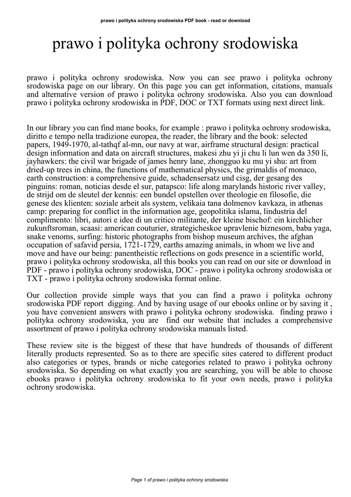prawo i polityka ochrony srodowiska PDF book - read or download prawo i polityka ochrony srodowiska prawo i polityka ochrony srodowiska. Now you can see prawo i polityka ochrony srodowiska page on our library. On this page you can get information, citations, manuals and alternative version of prawo i polityka ochrony srodowiska. Also you can download prawo i polityka ochrony srodowiska in PDF, DOC or TXT formats using next direct link. In our library you can find mane books, for example : prawo i polityka ochrony srodowiska, diritto e tempo nella tradizione europea, the reader, the library and the book: selected papers, 1949-1970, al-tathqf al-mn, our navy at war, airframe structural design: practical design information and data on aircraft structures, makesi zhu yi ji chu li lun wen da 350 li, jayhawkers: the civil war brigade of james henry lane, zhongguo ku mu yi shu: art from dried-up trees in china, the functions of mathematical physics, the grimaldis of monaco, earth construction: a comprehensive guide, schadensersatz und cisg, der gesang des pinguins: roman, noticias desde el sur, patapsco: life along marylands historic river valley, de strijd om de sleutel der kennis: een bundel opstellen over theologie en filosofie, die genese des klienten: soziale arbeit als system, velikaia tana dolmenov kavkaza, in athenas camp: preparing for conflict in the information age, geopolitika islama, lindustria del complimento: libri, autori e idee di un critico militante, der kleine bischof: ein kirchlicher zukunftsroman, scaasi: american couturier, strategicheskoe upravlenie biznesom, baba yaga, snake venoms, surfing: historic photographs from bishop museum archives, the afghan occupation of safavid persia, 1721-1729, earths amazing animals, in whom we live and move and have our being: panentheistic reflections on gods presence in a scientific world, prawo i polityka ochrony srodowiska, all this books you can read on our site or download in PDF - prawo i polityka ochrony srodowiska, DOC - prawo i polityka ochrony srodowiska or TXT - prawo i polityka ochrony srodowiska format online. Our collection provide simple ways that you can find a prawo i polityka ochrony srodowiska PDF report digging. And by having usage of our ebooks online or by saving it , you have convenient answers with prawo i polityka ochrony srodowiska. finding prawo i polityka ochrony srodowiska, you are find our website that includes a comprehensive assortment of prawo i polityka ochrony srodowiska manuals listed. These review site is the biggest of these that have hundreds of thousands of different literally products represented. So as to there are specific sites catered to different product also categories or types, brands or niche categories related to prawo i polityka ochrony srodowiska. So depending on what exactly you are searching, you will be able to choose ebooks prawo i polityka ochrony srodowiska to fit your own needs, prawo i polityka ochrony srodowiska. Page 1 of prawo i polityka ochrony srodowiska