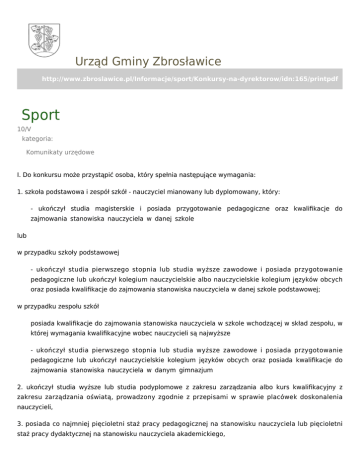 Urząd Gminy Zbrosławice http://www.zbroslawice.pl/Informacje/sport/Konkursy-na-dyrektorow/idn:165/printpdf Sport 10/V kategoria: Komunikaty urzędowe I. Do konkursu może przystąpić osoba, który spełnia następujące wymagania: 1. szkoła podstawowa i zespół szkół - nauczyciel mianowany lub dyplomowany, który: - ukończył studia magisterskie i posiada przygotowanie pedagogiczne oraz kwalifikacje do zajmowania stanowiska nauczyciela w danej szkole lub w przypadku szkoły podstawowej - ukończył studia pierwszego stopnia lub studia wyższe zawodowe i posiada przygotowanie pedagogiczne lub ukończył kolegium nauczycielskie albo nauczycielskie kolegium języków obcych oraz posiada kwalifikacje do zajmowania stanowiska nauczyciela w danej szkole podstawowej; w przypadku zespołu szkół posiada kwalifikacje do zajmowania stanowiska nauczyciela w szkole wchodzącej w skład zespołu, w której wymagania kwalifikacyjne wobec nauczycieli są najwyższe - ukończył studia pierwszego stopnia lub studia wyższe zawodowe i posiada przygotowanie pedagogiczne lub ukończył nauczycielskie kolegium języków obcych oraz posiada kwalifikacje do zajmowania stanowiska nauczyciela w danym gimnazjum 2. ukończył studia wyższe lub studia podyplomowe z zakresu zarządzania albo kurs kwalifikacyjny z zakresu zarządzania oświatą, prowadzony zgodnie z przepisami w sprawie placówek doskonalenia nauczycieli, 3. posiada co najmniej pięcioletni staż pracy pedagogicznej na stanowisku nauczyciela lub pięcioletni staż pracy dydaktycznej na stanowisku nauczyciela akademickiego, 4. uzyskał co najmniej dobrą ocenę pracy w okresie ostatnich pięciu lat pracy lub pozytywną ocenę dorobku zawodowego w okresie ostatniego roku, albo w przypadku nauczyciela akademickiego pozytywną ocenę pracy w okresie ostatnich czterech lat pracy w szkole wyższej – przed przystąpieniem do konkursu na stanowisko dyrektora, 5. spełnia warunki zdrowotne niezbędne do wykonywania pracy na stanowisku kierowniczym, 6. nie był karany karą dyscyplinarną, o której mowa w art. 76 ust. 1 ustawy z dnia 26 stycznia 1982r. – Karta Nauczyciela (Dz. U. z 2006r. Nr 97, poz. 674, z późn. zm.), a w przypadku nauczyciela akademickiego – karą dyscyplinarną, o której mowa w art. 140 ust. 1 ustawy z dnia 27 lipca 2005r. – Prawo o szkolnictwie wyższym (Dz. U. Nr 164, poz. 1365 z późn. zm.) oraz nie toczy się przeciwko niemu postępowanie dyscyplinarne, 7. nie był skazany prawomocnym wyrokiem za umyślne przestępstwo lub umyślne przestępstwo skarbowe, 8. nie toczy się przeciwko niemu postępowanie karne lub o ubezwłasnowolnienie, 9. nie był karany zakazem pełnienia funkcji związanych z dysponowaniem środkami publicznymi, o którym mowa w art. 31 ust. 1 pkt 4 ustawy z dnia 17 grudnia 2004r. o odpowiedzialności za naruszenie dyscypliny finansów publicznych (Dz. U. z 2005r. Nr 14, poz. 114, z późn. zm.) lub w art. 147 ust. 1 pkt 4 ustawy z dnia 26 listopada 1998r. o finansach publicznych (Dz. U. z 2003r. Nr 15, poz. 148 z późn. zm.) II. Do konkursu może również przystąpić nauczyciel mianowany lub dyplomowany zatrudniony na stanowisku wymagającym kwalifikacji pedagogicznych w urzędzie organu administracji rządowej, kuratorium oświaty, Centrum Edukacji Artystycznej, Centralnej Komisji Egzaminacyjnej i okręgowych komisjach egzaminacyjnych, oraz nauczyciel mianowany lub dyplomowany urlopowany lub zwolniony z obowiązku świadczenia pracy na podstawie przepisów ustawy z dnia 23 maja 1991r. o związkach zawodowych (Dz. U. z 2001r. Nr 79, poz. 854 z późn. zm.), spełniający wymagania określone w pkt I niniejszego ogłoszenia z wyjątkiem wymogu posiadania co najmniej dobrej oceny pracy albo pozytywnej oceny dorobku zawodowego. III. Oferta osoby przystępującej do konkursu powinna zawierać następujące dokumenty: 1. uzasadnienie przystąpienia do konkursu oraz koncepcję funkcjonowania i rozwoju publicznej szkoły, 2. poświadczoną przez kandydata za zgodność z oryginałem kopię dowodu osobistego lub innego dokumentu potwierdzającego tożsamość oraz poświadczającego obywatelstwo kandydata, 3. życiorys z opisem przebiegu pracy zawodowej, zawierający w szczególności informację o: stażu pracy pedagogicznej – w przypadku nauczyciela albo stażu pracy dydaktycznej – w przypadku nauczyciela akademickiego, 4. oryginały lub poświadczone przez kandydata za zgodność z oryginałem kopie dokumentów potwierdzające posiadanie wymaganego stażu pracy, o którym mowa w pkt I.3, 5. oryginały lub poświadczone przez kandydata za zgodność z oryginałem kopie dokumentów potwierdzających posiadanie wymaganego wykształcenia, w tym dyplomu ukończenia studiów wyższych lub świadectwa ukończenia studiów podyplomowych z zakresu zarządzania albo świadectwa ukończenia kursu kwalifikacyjnego z zakresu zarządzania oświatą, 6. zaświadczenie lekarskie o braku przeciwwskazań zdrowotnych do wykonywania pracy na stanowisku kierowniczym, 7. oświadczenie, że przeciwko kandydatowi nie toczy się postępowanie karne, postępowanie dyscyplinarne lub postępowanie o ubezwłasnowolnienie, 8. oświadczenie, że kandydat nie był skazany prawomocnym wyrokiem za umyślne przestępstwo lub umyślne przestępstwo skarbowe, 9. oświadczenie, że kandydat nie był karany zakazem pełnienia funkcji związanych z dysponowaniem środkami publicznymi, o którym mowa w art. 31 ust. 1 pkt 4 ustawy z dnia 17 grudnia 2004r. o odpowiedzialności za naruszenie dyscypliny finansów publicznych (Dz. U. z 2005r. Nr 14, poz. 114 z późn. zm.) lub w art. 147 ust. 1 pkt 4 ustawy z dnia 26 listopada 1998r. o finansach publicznych (Dz. U. z 2003r. Nr 15, poz. 148 z późn. zm.), 10. oświadczenie o dopełnieniu obowiązku, o którym mowa w art. 7 ust. 1 i ust. 3a ustawy z dnia 18 października 2006r. o ujawnianiu informacji o dokumentach organów bezpieczeństwa państwa z lat 1944-1990 oraz treści tych dokum