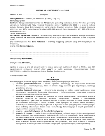 PROJEKT UMOWY UMOWA NR CUI/ZP/PN/…...../2015 zawarta w dniu ............................. pomiędzy: Gminą Wrocław z siedzibą we Wrocławiu, pl. Nowy Targ 1-8, działającą poprzez: Centrum Usług Informatycznych we Wrocławiu, jednostkę budżetową Gminy Wrocław, powołaną uchwałą nr XLIX/1221/13 Rady Miejskiej Wrocławia z dnia 17 października 2013 r. w sprawie nadania statutu Centrum Usług Informatycznych we Wrocławiu (Biuletyn Urzędowy Rady Miejskiej Wrocławia z 2013 r., poz. 407), z siedzibą we Wrocławiu (50-304) przy ul. Namysłowskiej 8, NIP: 897-179-38-46; REGON 022287361, i którą reprezentuje: Pan Dariusz Jędryczek – Dyrektor Centrum Usług Informatycznych we Wrocławiu, działający w imieniu Gminy Wrocław na podstawie pełnomocnictwa Nr 2/III/JO/14 Prezydenta Wrocławia z dnia 2 stycznia 2014 r. przy kontrasygnacie Pani Ewy Koleszko – Głównej Księgowej Centrum Usług Informatycznych we Wrocławiu, zwaną dalej Zamawiającym, a ......................................................................................................................................... ......................................................................................................................................... ......................................................................................................................................... zwanym dalej Wykonawcą, zwanymi dalej Stronami, zgodnie z ustawą z dnia 29 stycznia 2004 r. Prawo zamówień publicznych (Dz.U. z 2013 r., poz. 907 z późniejszymi zmianami; zwanej dalej „pzp”) w trybie przetargu nieograniczonego (znak: CUI/ZP/PN/.....…/2015) i finansowana jest ze środków budżetowych, o następującej treści: §1 Definicje pojęć Poniższe pojęcia powołane będą w treści niniejszej Umowy w następującym znaczeniu: 1) analiza przedwdrożeniowa – zespół czynności zmierzający do rozpoznania środowiska biznesowego i informatycznego, które w efekcie mają zapewnić jak najpełniejszą realizację przedmiotu Umowy; 2) Analiza Przedwdrożeniowa – dokumentacja powstała w efekcie przeprowadzonego przez Wykonawcę rozpoznania środowiska biznesowego i informatycznego, zawierająca wszystkie elementy przewidziane niniejszą Umową; 3) aplikacja mobilna – dostępna do pobrania w sklepie internetowym, dedykowana aplikacja mobilna stworzona na potrzeby Systemu, zintegrowana z System i umożliwiająca w szczególności: zgłaszanie do Systemu poprzez urządzenia mobilne, w trybie on-line, awarii (w rozumieniu potocznym) i innych zdarzeń, które wystąpiły na terenie miasta Wrocławia, automatyczne odnotowywanie tych zgłoszeń w Systemie w celu podjęcia przez Zamawiającego i inne podmioty stosownych działań oraz komunikację Zamawiającego i innych podmiotów z użytkownikiem poprzez System, 4) awaria – Awaria Krytyczna lub Awaria Niekrytyczna; 5) Awaria Krytyczna – wada Systemu uniemożliwiająca realizację przez System podstawowych funkcjonalności; lista podstawowych funkcjonalności, które w szczególności będą kwalifikowane jako Awaria Krytyczna, zostanie wskazana przez Zamawiającego w Analizie Przedwdrożeniowej; 6) Awaria Niekrytyczna – każda wada Systemu nie będąca Awarią Krytyczną; w szczególności stan, w którym System realizuje podstawowe funkcjonalności, lecz może pracować z mniejszą wydajnością, z wykorzystaniem rozwiązań zastępczych zaproponowanych przez Wykonawcę; Strona 1 z 33 7) 8) 9) 10) 11) 12) 13) 14) 15) 16) 17) 18) 19) 20) 21) 22) 23) 24) 25) 26) 27) 28) 29) całkowite wynagrodzenie brutto Wykonawcy – wynagrodzenie, o którym mowa w § 21 ust. 1 zd. 1; dni robocze – dni tygodnia od poniedziałku do piątku, z wyłączeniem dni ustawowo wolnych w Polsce od pracy oraz wewnętrznych dni wolnych Zamawiającego (tj. dni określonych przez zarządzenia wewnętrzne Zamawiającego), jeśli Wykonawca został o takim wewnętrznym dniu wolnym powiadomiony, co najmniej 7 dni kalendarzowych przed danym wewnętrznym dniem wolnym; Dokumentacja Systemu – Analiza Przedwdrożeniowa oraz dokumentacja, o której mowa w załączniku nr 3 do Umowy; Ekosystem sp. z o.o. – Ekosystem sp. z o.o. z siedzibą we Wrocławiu, KRS: 0000426169, NIP: 899-273-64-47; HelpDesk – system informatyczny działający u Zamawiającego, za pośrednictwem którego Zamawiający będzie zgłaszał wszystkie wady i uwagi do działania Systemu po jego odbiorze. Wykonawca będzie miał wgląd do systemu HelpDesk i będzie realizował zadania w nim zgłoszone; Kwartał – kolejne trzy miesiące liczone od daty dokonania Odbioru Końcowego; Odbiór Końcowy – procedura odbioru, w ramach, której weryfikowana będzie realizacja przedmiotu Umowy zgodnie z postanowieniami Umowy (w szczególności: Analizą Przedwdrożeniową, SIWZ, ofertą Wykonawca, innymi dokumentami powstałymi w trakcie procedur odbioru); Oferta Wykonawcy – oferta Wykonawcy złożona w ramach postępowania o udzielenie zamówienia publicznego znak: CUI/ZP/PN/.....…/2015; Okres Gwarancyjny – okres trwający przez 36 miesięcy od dnia podpisania Protokołu Odbioru Końcowego; Okres Rozliczeniowy – kwartał roku kalendarzowego (pierwszym dniem pierwszego kwartału jest pierwszy dzień roku kalendarzowego); Protokół Odbioru – protokół, o którym mowa w § 16 ust. 4; Protokół Odbioru Końcowego – Protokół Odbioru, o którym mowa w § 16 ust. 5; w razie wątpliwości poczytuje się, że ilekroć w Umowie mowa o podpisaniu Protokołu Odbioru Końcowego, oznacza to jego podpisanie przez obie strony; Reklamacja – żądanie ponownego rozpatrzenia zadania wcześniej zgłoszonego w HelpDesk i rozwiązanego przez Wykonawcę - w sytuacji, gdy podane rozwiązanie nie jest wystarczające dla Zamawiającego; Serwis Gwarancyjny – serwis wykraczający poza standardowe warunki gwarancji udzielanej przez producenta Systemu, w ramach którego Wykonawca jest zobowiązany do usuwania awarii Systemu (