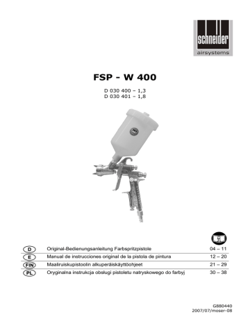 FSP - W 400 D 030 400 – 1,3 D 030 401 – 1,8 Original-Bedienungsanleitung Farbspritzpistole 04 – 11 Manual de instrucciones original de la pistola de pintura 12 – 20 Maaliruiskupistoolin alkuperäiskäyttöohjeet 21 – 29 Oryginalna instrukcja obsługi pistoletu natryskowego do farbyj 30 – 38 G880440 2007/07/moser-08 2 1a 1b 2a 2b 2c 3a FSP-W 400 3b 3c 3d 3e 4 FSP-W 400 3 DEUTSCH Inhalt 1. 2. 3. 4. 5. 6. 7. 8. 9. Allgemeine Hinweise ............................4 Lieferumfang.........................................4 Mitgeltende Dokumente........................4 Bestimmungsgemäße Verwendung......4 Symbole................................................5 Technische Daten.................................5 Sicherheitshinweise ..............................6 Aufbau ..................................................7 Inbetriebnahme.....................................7 9.1 Vor erster Inbetriebnahme ............7 9.2 Inbetriebnahme.............................7 9.3 Druckluftanschluss........................8 9.4 Betrieb ..........................................8 9.5 Nach dem Einsatz.........................8 9.6 Düsenwechsel ..............................8 10. Wartung ................................................8 10.1 Vor Wartungstätigkeiten ...............8 11. Außerbetriebnahme ..............................9 11.1 Lagerung ......................................9 11.2 Entsorgung ...................................9 12. Zubehör ................................................9 13. Störungsbehebung ...............................9 14. Gewährleistungsbedingungen ............11 15. Konformitätserklärung.........................11 1. Allgemeine Hinweise Prüfungen, Einstellungen und Wartungsarbeiten sollten immer von der gleichen Person oder deren Stellvertreter durchgeführt und in einem Wartungsbuch dokumentiert werden. Bei Fragen bitten wir Sie, die Artikelnummer und Bezeichnung des Gerätes anzugeben. Beachten Sie die Sicherheitshinweise! Bedienungsanleitung lesen! Der Betreiber (Besitzer / Verantwortliche) ist verpflichtet, die Bedienungsanleitung zu beachten und alle Anwender dieses Gerätes gemäß der Bedienungsanleitung zu unterweisen. Die Unterweisung ist jährlich zu wiederholen. 2. • • • • • • 3. • • 4. Lieferumfang Farbspritzpistole Montageschlüssel Reinigungsbürsten Filter Garantiekarte Bedienungsanleitung Mitgeltende Dokumente Ersatzteilliste EG-Konformitätserklärung Bestimmungsgemäße Verwendung Die Farbspritzpistole Typ W 400 ist ein handliches, druckluftbetriebenes Gerät für den handwerklichen Einsatz. Sie eignet sich besonders zum Lackieren von großen Flächen. Jede andere Verwendung ist mit dem Hersteller abzustimmen. Wird das Gerät außerhalb von Deutschland betrieben, können andere gesetzliche Vorschriften für den Betrieb des Gerätes vorgeschrieben sein, als sie in dieser Bedienungsanleitung beschrieben sind. 4 Deutsch FSP-W 400 5. Symbole Achtung: Schenken Sie diesen Symbolen höchste Aufmerksamkeit! Symbol Signalwort GEFAHR WARNUNG VORSICHT HINWEIS Gefahrenstufe unmittelbar drohende Gefahr mögliche drohende Gefahr mögliche gefährliche Situation mögliche gefährliche Situation Folgen bei Nichtbeachtung Tod, schwere Körperverletzung Tod, schwere Körperverletzung Leichte Körperverletzung Sachschaden Sicherheitshinweise Symbol Bedeutung Bedienungsanleitung lesen! Symbol Bedeutung Folgen bei Nichtbeachtung Körperverletzung oder Tod des Bedieners Sachschaden am Gerät falsche Bedienung des Gerätes Symbol Atemschutz verwenden! Bedeutung Schutzhandschuhe tragen! Schutzbrille tragen! 6. Technische Daten Luftverbrauch Maximal zulässiger Arbeitsdruck (Fließdruck) Arbeitsdruck (Fließdruck) Düsendurchmesser Fließbecherinhalt Auftragswirkungsgrad Strahleinstellung Impulsschalldruckpegel LPA 1 m (in 1 m Abstand) nach DIN 45 635, Teil 20 Empfohlener Schlauchdurchmesser (innen) bei L= 10 m Abmessungen Breite x Tiefe x Höhe Gewicht Benötigte Luftqualität Mindestleistungsgröße des Kompressors 270 2 1-2 1,3 / 1,8 0,6 ≤ 95 Rund oder breit l/min bar bar mm l % 79,7 9 170 x 100 x 345 0,44 dB(A) mm mm kg Gereinigt, kondensat- und ölfrei 280 l/min Füllleistung, 2,2 kW Motorleistung, 50 l Behältergröße Technische Änderungen vorbehalten. Abbildungen können vom Original abweichen. Stand: März 2007 FSP-W 400 Deutsch 5 7. Sicherheitshinweise • GEFAHR Gefahr schwerer Verletzung! Peitschender Druckluftschlauch beim Öffnen der Schnellkupplung. Æ Druckluftschlauch festhalten. • GEFAHR Gefahr schwerer Verletzung! Æ Bei Wartungs-, Reparaturarbeiten und beim Nachfüllen von Material gilt: Gerät vom Druckluftanschluss trennen, Gerät drucklos. • WARNUNG Gefahr schwerer Verletzung! Vernebelung von Farben und Ausdünsten von Lösungsmitteln während des Betriebes möglich. ÆDen Vorschriften entsprechend ist beim Lackieren der entsprechende Arbeits- und Atemschutz zu verwenden! WARNUNG Explosionsgefahr! Lebensgefahr! Æ Gerät nicht in explosionsgefährdeten Bereichen der Zone 0 und Zone 20 einsetzen! Æ Maximal zulässigen Druck beachten! • • • • • • • VORSICHT Gefahr Verletzung! Stolperfalle! Druckluftschläuche, die über den Boden geführt werden. Æ Vermeiden bzw. beachten. • • • • 6 Schützen Sie sich, andere Personen, Sachgegenstände und ihre Umwelt durch die jeweils notwendige Schutzmaßnahmen oder Vorkehrungen um Gesundheits-, Sach-, Wert- oder Umweltschäden sowie Unfallgefahren zu vermeiden. Deutsch • Tragen Sie beim Arbeiten mit der Farbspritzpistole die erforderliche Schutzkleidung: insbesondere eine Atemschutzmaske, Schutzbrille und Arbeitshandschuhe. Bei höherem Arbeitsdruck kann der Schalldruckpegel 80 dB(A) überschreiten. Gehörschutz tragen. Farben, Lacke und Reinigungsmittel nicht mit der Haut oder den Augen in Verbindung bringen. Der Betreiber hat den sachgerechten Betrieb sicherzustellen. Kinder und Tiere vom Betriebsbereich und vom Druckluftgerät fernhalten. Druckluftgerät