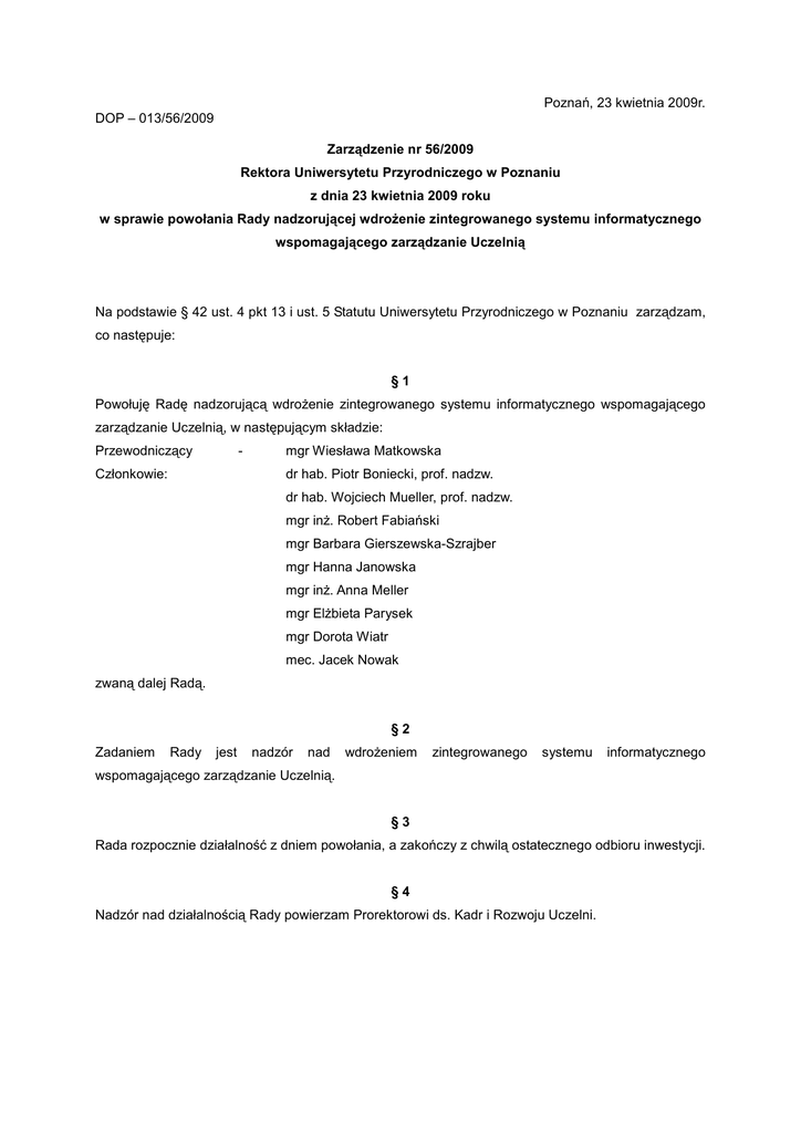 Poznań, 23 kwietnia 2009r. DOP – 013/56/2009 Zarządzenie nr 56/2009 Rektora Uniwersytetu Przyrodniczego w Poznaniu z dnia 23 kwietnia 2009 roku w sprawie powołania Rady nadzorującej wdroŜenie zintegrowanego systemu informatycznego wspomagającego zarządzanie Uczelnią Na podstawie § 42 ust. 4 pkt 13 i ust. 5 Statutu Uniwersytetu Przyrodniczego w Poznaniu zarządzam, co następuje: §1 Powołuję Radę nadzorującą wdroŜenie zintegrowanego systemu informatycznego wspomagającego zarządzanie Uczelnią, w następującym składzie: Przewodniczący - Członkowie: mgr Wiesława Matkowska dr hab. Piotr Boniecki, prof. nadzw. dr hab. Wojciech Mueller, prof. nadzw. mgr inŜ. Robert Fabiański mgr Barbara Gierszewska-Szrajber mgr Hanna Janowska mgr inŜ. Anna Meller mgr ElŜbieta Parysek mgr Dorota Wiatr mec. Jacek Nowak zwaną dalej Radą. §2 Zadaniem Rady jest nadzór nad wdroŜeniem zintegrowanego systemu informatycznego wspomagającego zarządzanie Uczelnią. §3 Rada rozpocznie działalność z dniem powołania, a zakończy z chwilą ostatecznego odbioru inwestycji. §4 Nadzór nad działalnością Rady powierzam Prorektorowi ds. Kadr i Rozwoju Uczelni. §5 Tracą moc: 1) zarządzenie nr 90/2008 Rektora Uniwersytetu Przyrodniczego w Poznaniu z dnia 5 czerwca 2008 roku w sprawie powołania Rady nadzorującej wdroŜenie zintegrowanego systemu informatycznego wspomagającego zarządzanie Uczelnią, 2) zarządzenie nr 142/2008 Rektora Uniwersytetu Przyrodniczego w Poznaniu z dnia 14 października 2008 roku w sprawie zmiany zarządzenia nr 90/2008 Rektora Uniwersytetu Przyrodniczego w Poznaniu z dnia 5 czerwca 2008r. w sprawie powołania Rady nadzorującej wdroŜenie zintegrowanego systemu informatycznego wspomagającego zarządzanie Uczelnią. §6 Zarządzenie wchodzi w Ŝycie z dniem podpisania. Rektor /-/ prof. dr hab. Grzegorz Skrzypczak