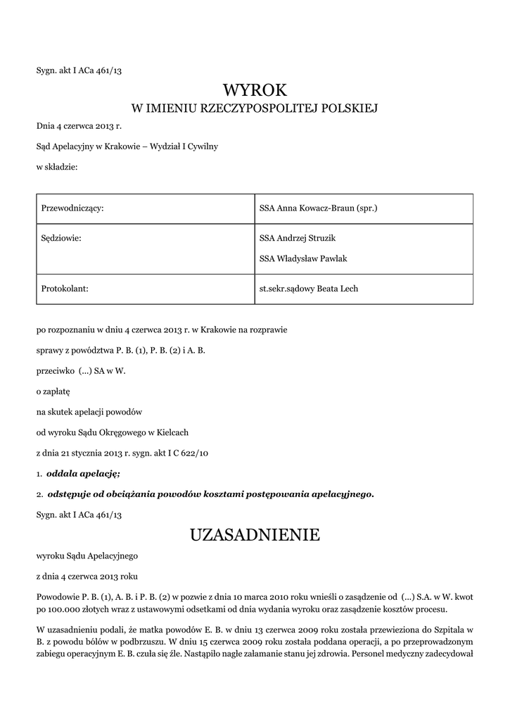 Sygn. akt I ACa 461/13 WYROK W IMIENIU RZECZYPOSPOLITEJ POLSKIEJ Dnia 4 czerwca 2013 r. Sąd Apelacyjny w Krakowie – Wydział I Cywilny w składzie: Przewodniczący: SSA Anna Kowacz-Braun (spr.) Sędziowie: SSA Andrzej Struzik SSA Władysław Pawlak Protokolant: st.sekr.sądowy Beata Lech po rozpoznaniu w dniu 4 czerwca 2013 r. w Krakowie na rozprawie sprawy z powództwa P. B. (1), P. B. (2) i A. B. przeciwko (...) SA w W. o zapłatę na skutek apelacji powodów od wyroku Sądu Okręgowego w Kielcach z dnia 21 stycznia 2013 r. sygn. akt I C 622/10 1. oddala apelację; 2. odstępuje od obciążania powodów kosztami postępowania apelacyjnego. Sygn. akt I ACa 461/13 UZASADNIENIE wyroku Sądu Apelacyjnego z dnia 4 czerwca 2013 roku Powodowie P. B. (1), A. B. i P. B. (2) w pozwie z dnia 10 marca 2010 roku wnieśli o zasądzenie od (...) S.A. w W. kwot po 100.000 złotych wraz z ustawowymi odsetkami od dnia wydania wyroku oraz zasądzenie kosztów procesu. W uzasadnieniu podali, że matka powodów E. B. w dniu 13 czerwca 2009 roku została przewieziona do Szpitala w B. z powodu bólów w podbrzuszu. W dniu 15 czerwca 2009 roku została poddana operacji, a po przeprowadzonym zabiegu operacyjnym E. B. czuła się źle. Nastąpiło nagłe załamanie stanu jej zdrowia. Personel medyczny zadecydował o ponownej operacji, aby sprawdzić czy poprzedni zabieg chirurgiczny został przeprowadzony w sposób prawidłowy. Po kolejnej operacji, która miała miejsce w dniu 18 czerwca 2009 roku E. B. zapadła w śpiączkę, z której się nie wybudziła i zmarła w dniu 26 czerwca 2009 roku. Zdaniem powodów to, iż E. B. została przyjęta do Szpitala w stanie stabilnym oraz, że nie cierpiała na żadne schorzenia stanowiące wedle jej wiedzy zagrożenie dla życia, należy uznać, iż jej śmierć była wynikiem błędu popełnionego przez personel medyczny Szpitala. Wskazywali, że podstawę dochodzenia roszczenia stanowi umowa odpowiedzialności cywilnej zawarta pomiędzy Zespołem Opieki Zdrowotnej w B., a Ubezpieczycielem. Strona pozwana (...) S.A. w W. Inspektorat w K. w odpowiedzi na pozew wniosła o oddalenie powództwa i zasądzenie kosztów procesu. Strona pozwana nie kwestionowała, że Zakład Opieki Zdrowotnej w B. zawarł z pozwanym umowę obowiązkowego ubezpieczenia odpowiedzialności cywilnej za szkody wyrządzone w następstwie działania lub zaniechania ubezpieczonego w okresie trwania ochrony ubezpieczeniowej. Podnosiła, że brak jest podstaw do twierdzenia, że zgon E. B. był skutkiem błędu w sztuce lekarskiej, czy też niedołożenia staranności personelu w opiece nad pacjentką. Tym samym brak jest podstaw do przyjęcia, by za śmierć E. B. odpowiedzialność ponosił pozwany (...) Zakład (...). Wyrokiem z dnia 21 stycznia 2012 roku Sąd Okręgowy w Kielcach oddalił powództwo i odstąpił od obciążania powodów kosztami procesu. Powyższy wyrok został oparty na następujących ustaleniach i rozważaniach: E. B. została przyjęta do Szpitala w B. w dniu 13 czerwca 2009 roku z powodu utrzymujących się od 3 dni bólów brzucha, wymiotów, żółtaczki i stanów podgorączkowych. W wywiadzie chorobowym odnotowano stwierdzenie kamicy pęcherzykowej i cystę tarczycy. Przy przyjęciu do szpitala zlecono wykonanie badań pracownianych w tym rtg klatki piersiowej i brzucha. Badanie usg jamy brzusznej nie było zlecane przy przyjęciu do szpitala. Wśród badań pracownianych nie ma wyników badań rtg klatki piersiowej i brzucha. W dniu 15 czerwca 2009 roku zapisano wskazania do zabiegu operacyjnego. W dniu 15 czerwca 2009 roku E. B. poddano zabiegowi operacyjnemu usunięcia pęcherzyka żółciowego z rewizją dróg żółciowych. Rozpoznanie przedoperacyjne sklasyfikowano jako kamica pęcherzyka żółciowego i przewodu żółciowego wspólnego. Dokonano usunięcia pęcherzyka żółciowego, instrumentalnej rewizji dróg żółciowych i rewizji jamy brzusznej. W czasie zabiegu stwierdzono wypływy zastoinowej żółci bez obecności złogów i uzyskano swobodne przejście do dwunastnicy. Rozpoznanie pooperacyjne stwierdzało kamicę pęcherzyka żółciowego, zastój żółci. W dniu operacji włączono leczenie antybiotykami. W ciągu pierwszej doby po zabiegu chora była niespokojna, pokrzykiwała ale nie zgłaszała dolegliwości bólowych. W godzinach rannych w dniu 17 czerwca 2009 roku wymiotowała, wystąpiły zaburzenia świadomości, pojawiła się gorączka i wystąpiła niewydolność oddechowa. Po skutecznej akcji reanimacyjnej chorą przekazano na OIOM. Założono sondę żołądkową, wykonano wkłucie do tętnicy promieniowej. Pobrano krew na posiew z wkłucia centralnego i dotętniczego. W dokumentacji brak jest wyników badań bakteriologicznych. W dniu 18 czerwca 2009 roku stan zdrowia E. B. uległ pogorszeniu. Została zakwalifikowana do ponownego zabiegu operacyjnego w trybie pilnym. Rozpoznanie przedoperacyjne przed ponownym zabiegiem stwierdzało jatrogenne uszkodzenie dwunastnicy, stan po usunięciu pęcherzyka i rewizji dróg żółciowych. W czasie zabiegu operacyjnego stwierdzono niewielki ropień nadpowięziowy w powłokach brzusznych, a po otwarciu jamy brzusznej obfity krwisty wysięk w całej jamie brzusznej. Trzustka zmieniona martwiczo. Na sieci, jelitach i w krezce stwierdzono liczne mydła. Nie potwierdzono jatrogennej perforacji dwunastnicy. Pobrano materiały do badań bakteriologicznych. Do dotychczas stosowanych antybiotyków dołączono biodacynę i meronem. Wyniki badań bakteriologicznych uzyskano w dniach 22 i 23 czerwca. We wszystkich wynikach badań bakteriologicznych, poza moczem, stwierdzono obecność metycylinoopornego gronkowca koagulazo-ujemnego wrażliwego na biodacynę, sulperazon i ciprofloksacynę. W dniach 20 i 22 czerwca pobrano do badania bakteriologicznego wymaz z drenu i posiew krwi. W obydwu próbach stwierdzono obecność gronkowca. Przez cały okres leczenia w OIOM chora wysoko gorączkowała, a jej stan zdrowi