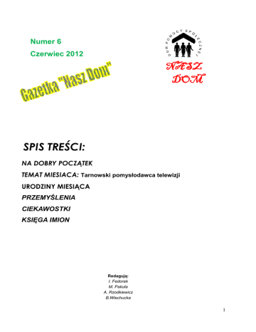 Numer 6 Czerwiec 2012 NASZ DOM SPIS TREŚCI: NA DOBRY POCZĄTEK TEMAT MIESIACA: Tarnowski pomysłodawca telewizji URODZINY MIESIĄCA PRZEMYŚLENIA CIEKAWOSTKI KSIĘGA IMION Redagują: I. Fedorek M. Pakuła A. Rzodkiewicz B.Wiechucka 1 Na DOBRY POCZĄTEK Sinclair Lewis Kiedy człowiek kłamie, to zawsze to robi zbyt artystycznie i niepotrzebnie wzbudza podejrzenie. TEMAT MIESIĄCA Tarnowski pomysłodawca telewizji Witold Iwańczak Nazywany był polskim Edisonem. Przed ponad stu laty o wynalazkach tego Polaka pisała prasa w całej Europie oraz w Ameryce. Z prezentacją swoich osiągnięć zapraszano go nawet do Chin. Na pytanie, skąd się wzięła jego fascynacja techniką, odpowiedział krótko, że to dar Boży. Znał się z Gabrielą Zapolską, Ignacym Janem Paderewskim, a przyjaźnił z Markiem Twainem i Kazimierzem Przerwą-Tetmajerem. Cesarz Austrii Franciszek Józef I osobiście odbierał od niego dar na 50-lecie swego panowania. Król Hiszpanii Alfons XIII, któremu materiał kuloodporny wynalazcy uratował życie w zamachu bombowym, udekorował go Orderem Izabeli Katolickiej, co było równoznaczne z nadaniem szlachectwa. Za udoskonalenie opatentowanej wcześniej przez innego Polaka – zakonnika Kazimierza Żeglenia kamizelki kuloodpornej car Mikołaj II nadał mu Order Świętej Anny, ale wynalazca nie przyjął go z powodów patriotycznych. Jego nazwisko wymieniają dziś wszystkie fachowe encyklopedie i leksykony na świecie. Jan Szczepanik, o którym mowa, był znanym i podziwianym w świecie wynalazcą, a dziś – 2 może poza Krosnem, gdzie dorastał, i Tarnowem, gdzie jest pochowany – właściwie jest nieznany w swoim rodzinnym kraju. Trudne dzieciństwo Szczepanik, zwany polskim Edisonem albo da Vincim z Galicji, urodził się 140 lat temu – 13 czerwca 1872 r. w Rudnikach k. Mościsk (obecnie Ukraina) jako nieślubne dziecko Marianny Szczepanik. Gdy Marianna musiała wyjechać do Lwowa w celach zarobkowych, małym Jankiem zaopiekował się jej brat Ludwik. Po niespodziewanej śmierci Marianny (data śmierci się nie zachowała) wychowaniem Janka zajęła się ciocia Salomea oraz dziadkowie ze Zręcina k. Krosna – Stanisław i Katarzyna Szczepanikowie. Swoją edukację Jan Szczepanik rozpoczął w szkole ludowej w Krośnie, do którego to miasta przeniosła się po swym ślubie z Wawrzyńcem Gradowiczem ciocia Salomea. Sami nie mieli dzieci, więc zaopiekowali się Janem jak rodzonym synem. W tamtym czasie rozpoczęła się długoletnia przyjaźń Jana z późniejszym poetą, prozaikiem i tłumaczem – Franciszkiem Pikiem. Inspirowali się wzajemnie. Dzielili pasje humanistyczne i ambicje twórcze, o czym mogą świadczyć prace malarskie Szczepanika czy jego gra na skrzypcach. Ojcem chrzestnym Franciszka Pika był Ignacy Łukasiewicz, którego twórcza postawa mogła być inspiracją dla Jana Szczepanika. Razem z Franciszkiem zwiedzał pola naftowe i urządzenia wiertnicze, bywał w pracowni Łukasiewicza i poznawał aparaturę badawczą. Po ukończeniu w 1885 r. szkoły podstawowej kontynuował naukę w gimnazjum w Jaśle, w którym zabłysnął z matematyki i fizyki, ale szkoły nie ukończył, głównie z powodu poważnych problemów z greką. Wtedy przyszli 3 mu z pomocą rodzice przyjaciela –Pikowie. Szczepanik przeniósł się w 1888 r. do Krakowa i zamieszkał u państwa Pików, którzy się tam przeprowadzili, i w roku 1891 został absolwentem seminarium nauczycielskiego w Krakowie z uprawnieniami nauczyciela szkoły ludowej. Pasja wynalazcza Szczepanik został skierowany do pracy i nauczał w podkarpackich wioskach, takich jak Potok k. Jedlicza, Lubatówka k. Iwonicza-Zdroju, Korczyna k. Krosna. W tym czasie dokonywał pierwszych odkryć, które spowodowały, że w 1896 r. porzucił zawód nauczyciela i wrócił do Krakowa, gdzie oddał się swej prawdziwej pasji. Roczny pobyt w tym mieście był punktem zwrotnym w jego życiu, gdyż zetknął się tam ze środowiskiem naukowym i nawiązał znajomości, z których najważniejsza była ta z właścicielem sklepu fotograficznego – Ludwikiem Kleinbergiem. Kleinberg zgodził się finansować badania i wdrażanie wynalazków Szczepanika. Już w 1896 r. dokonał on gruntownych zmian w maszynie tkackiej, służącej do wytwarzania gobelinów. Tworzenie patronów, tzn. schematów tkanego później obrazka (pracownik malował odpowiednie kratki papieru farbą), zastąpił urządzeniem przenoszącym obrazek na patron jak w aparacie fotograficznym. Dodatkowo uprościł proces przenoszenia obrazka z patronu na elementy maszyny tkackiej za pomocą elektromagnesów. Spowodowało to, że gobelin, tworzony do tej pory przez 5 tygodni, można było wykonać w pół godziny. W roku 1898 Szczepanik wyjechał do Wiednia, gdzie nie tylko prowadził swoje badania w różnych dziedzinach techniki, ale utkał największy wówczas gobelin 4 świata – 148 cm długości i 120 cm szerokości. Było to odwzorowanie obrazu Henryka Rauchingera przedstawiające apoteozę 50-lecia panowania cesarza Austro-Węgier Franciszka Józefa I. Cesarz osobiście odebrał gobelin podarowany mu przez Szczepanika i w dowód wdzięczności zwolnił go, w drodze wyjątku, z 3-letniej służby wojskowej. W roku 1900 władze austriackie ponownie jednak wezwały wynalazcę do jej odbycia i w ten sposób trafił on do Przemyśla – pozwolono mu nadal pracować naukowo, ale poza swoim laboratorium. Tam poznał najpierw swojego przyszłego teścia – lekarza Zygmunta Dzikowskiego, a następnie jego córkę Wandę. W 1897 r. Szczepanik opatentował w Anglii telektroskop, czyli urządzenie do przekazu na odległość kolorowego obrazu i dźwięku przy pomocy impulsów elektrycznych. Projekt zawierał rozwiązania, które później faktycznie zastosowano w technikach telewizyjnych. Projekt ten wzbudził wówczas sporą sensację, ale ze względów finansowych i niedostatecznych możliwości ówczesnej techniki nie został zrealizowany. W tym czasie Sz