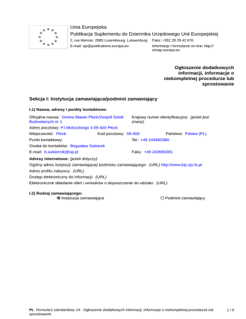 Unia Europejska Publikacja Suplementu do Dziennika Urzędowego Unii Europejskiej 2, rue Mercier, 2985 Luxembourg, Luksemburg Faks: +352 29 29 42 670 E-mail: [email protected] Informacje i formularze on-line: http:// simap.europa.eu Ogłoszenie dodatkowych informacji, informacje o niekompletnej procedurze lub sprostowanie Sekcja I: Instytucja zamawiająca/podmiot zamawiający I.1) Nazwa, adresy i punkty kontaktowe: Oficjalna nazwa: Gmina Miasto Płock/Zespół Szkół Budowlanych nr 1 Krajowy numer identyfikacyjny: (jeżeli jest znany) _____ Adres pocztowy: P.I.Mościckiego 4 09-400 Płock Miejscowość: Płock Kod pocztowy: 09-400 Punkt kontaktowy: _____ Państwo: Polska (PL) Tel.: +49 243660380 Osoba do kontaktów: Bogusław Sukienik E-mail: [email protected] Faks: +49 243660381 Adresy internetowe: (jeżeli dotyczy) Ogólny adres instytucji zamawiającej/ podmiotu zamawiającego: (URL) http://www.bip.zjo.lo.pl Adres profilu nabywcy: (URL) _____ Dostęp elektroniczny do informacji: (URL) _____ Elektroniczne składanie ofert i wniosków o dopuszczenie do udziału: (URL) _____ I.2) Rodzaj zamawiającego: Instytucja zamawiająca Podmiot zamawiający PL Formularz standardowy 14 - Ogłoszenie dodatkowych informacji, informacje o niekompletnej procedurze lub sprostowanie 1/5 Sekcja II: Przedmiot zamówienia II.1.1) Nazwa nadana zamówieniu: Realizacja usługi szkolenia zawodowego - kurs Innowacyjny przedsiębiorca. II.1.2) Krótki opis zamówienia lub zakupu: (podano w pierwotnym ogłoszeniu) - realizacja usługi szkolenia zawodowego - kurs Innowacyjny przedsiębiorca - 20 godzin. II.1.3) Wspólny Słownik Zamówień (CPV) Główny przedmiot Słownik główny 80570000 Słownik uzupełniający (jeżeli dotyczy) PL Formularz standardowy 14 - Ogłoszenie dodatkowych informacji, informacje o niekompletnej procedurze lub sprostowanie 2/5 Sekcja IV: Procedura IV.1)Rodzaj procedury (podano w pierwotnym ogłoszeniu) Otwarta Ograniczona Ograniczona przyspieszona Negocjacyjna Negocjacyjna przyspieszona Dialog konkurencyjny Negocjacyjna z uprzednim ogłoszeniem Negocjacyjna bez uprzedniego ogłoszenia Negocjacyjna z publikacją ogłoszenia o zamówieniu Negocjacyjna bez publikacji ogłoszenia o zamówieniu Udzielenie zamówienia bez uprzedniej publikacji ogłoszenia o zamówieniu w Dzienniku Urzędowym Unii Europejskiej IV.2)Informacje administracyjne IV.2.1)Numer referencyjny: (podano w pierwotnym ogłoszeniu) _____ IV.2.2)Dane referencyjne ogłoszenia w przypadku ogłoszeń przesłanych drogą elektroniczną: Pierwotne ogłoszenie przesłane przez eNotices TED eSender Login: ENOTICES_Sukiennik Dane referencyjne ogłoszenia: 2013-142422 rok i numer dokumentu IV.2.3)Ogłoszenie, którego dotyczy niniejsza publikacja: Numer ogłoszenia w Dz.U.: 2013/S 206-357022 z dnia: 23/10/2013 (dd/mm/rrrr) IV.2.4)Data wysłania pierwotnego ogłoszenia: 21/10/2013 (dd/mm/rrrr) PL Formularz standardowy 14 - Ogłoszenie dodatkowych informacji, informacje o niekompletnej procedurze lub sprostowanie 3/5 Sekcja VI: Informacje uzupełniające VI.1) Ogłoszenie dotyczy: Procedury niepełnej Sprostowania Informacji dodatkowych VI.2) Informacje na temat niepełnej procedury udzielenia zamówienia: Postępowanie o udzielenie zamówienia zostało przerwane Postępowanie o udzielenie zamówienia uznano za nieskuteczne Zamówienia nie udzielono Zamówienie może być przedmiotem ponownej publikacji VI.3) Informacje do poprawienia lub dodania : VI.3.1) Zmiana oryginalnej informacji podanej przez instytucję zamawiającą Publikacja w witrynie TED niezgodna z oryginalną informacją, przekazaną przez instytucję zamawiającą Oba przypadki VI.3.2) W ogłoszeniu pierwotnym W odpowiedniej dokumentacji przetargowej (więcej informacji w odpowiedniej dokumentacji przetargowej) W obu przypadkach (więcej informacji w odpowiedniej dokumentacji przetargowej) VI.3.3) Tekst, który należy poprawić w pierwotnym ogłoszeniu Miejsce, w którym znajduje się Zamiast: Powinno być: zmieniany tekst: Ze złożonych dokumentów i Ze złożonych dokumentów i Sekcja III.2.1) oświadczeń musi wynikać, iż oświadczeń musi wynikać, iż realizujący usługę szkolenia realizujący usługę szkolenia zawodowego – kurs „Innowacyjny zawodowego – kurs „Innowacyjny przedsiębiorca” posiada: przedsiębiorca” posiada: 1. wykształcenie wyższe 1. wykształcenie wyższe magisterskie, magisterskie, 2. przygotowanie w zakresie 2. przygotowanie w zakresie doradztwa zawodowego (studia doradztwa zawodowego (studia wyższe lub studia podyplomowe), wyższe lub studia podyplomowe), 3. co najmniej 3– letnie 3. co najmniej 3– letnie doświadczenie zawodowe w pracy w doświadczenie zawodowe w pracy w szkolnictwie zawodowym. zakresie doradztwa zawodowego. VI.3.4) Daty, które należy poprawić w pierwotnym ogłoszeniu Miejsce, w którym znajdują się Zamiast: zmieniane daty: Powinno być: VI.3.5) Adresy i punkty kontaktowe, które należy poprawić VI.3.6) Tekst, który należy dodać do pierwotnego ogłoszenia Miejsce, w którym należy dodać tekst: Tekst do dodania: VI.4) Inne dodatkowe informacje: PL Formularz standardowy 14 - Ogłoszenie dodatkowych informacji, informacje o niekompletnej procedurze lub sprostowanie 4/5 _____ VI.5) Data wysłania niniejszego ogłoszenia: 23/10/2013 (dd/mm/rrrr) - ID:2013-144206 PL Formularz standardowy 14 - Ogłoszenie dodatkowych informacji, informacje o niekompletnej procedurze lub sprostowanie 5/5