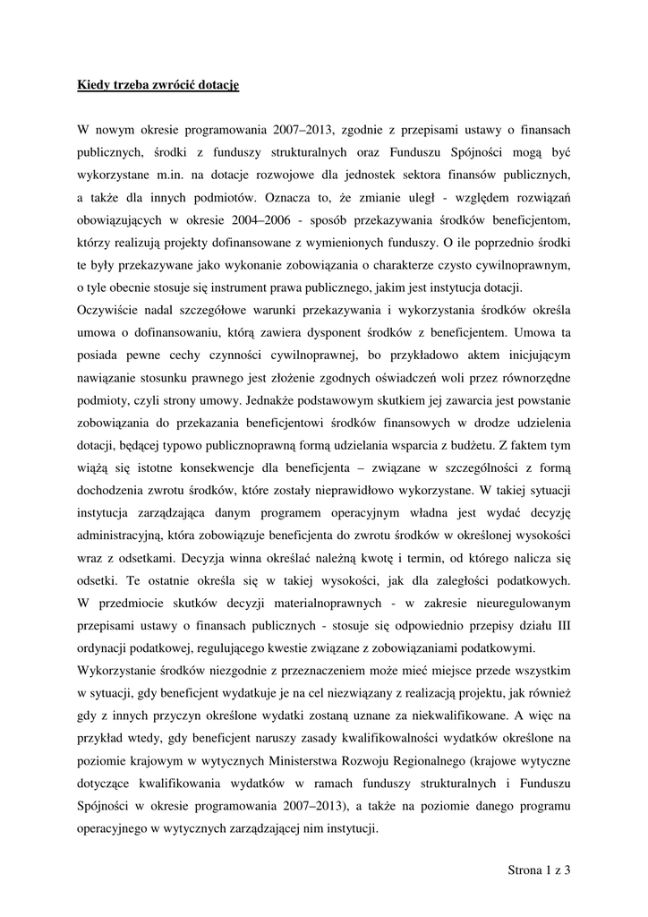 Strona 1 z 3 Kiedy trzeba zwrócić dotację W nowym okresie