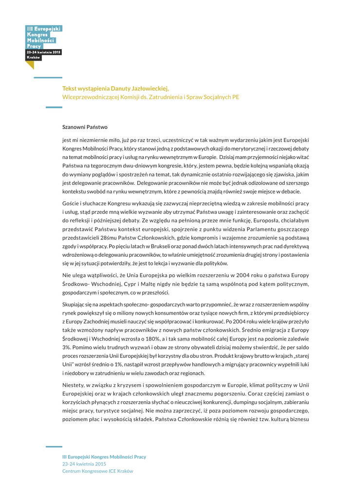 Tekst wystąpienia Danuty Jazłowieckiej, Wiceprzewodniczącej Komisji ds. Zatrudnienia i Spraw Socjalnych PE Szanowni Państwo jest mi niezmiernie miło, już po raz trzeci, uczestniczyć w tak ważnym wydarzeniu jakim jest Europejski Kongres Mobilności Pracy, który stanowi jedną z podstawowych okazji do merytorycznej i rzeczowej debaty na temat mobilności pracy i usług na rynku wewnętrznym w Europie. Dzisiaj mam przyjemności niejako witać Państwa na tegorocznym dwu-dniowym kongresie, który, jestem pewna, będzie kolejną wspaniałą okazją do wymiany poglądów i spostrzeżeń na temat, tak dynamicznie ostatnio rozwijającego się zjawiska, jakim jest delegowanie pracowników. Delegowanie pracowników nie może być jednak odizolowane od szerszego kontekstu swobód na rynku wewnętrznym, które z pewnością znajdą również swoje miejsce w debacie. Goście i słuchacze Kongresu wykazują się zazwyczaj nieprzeciętną wiedzą w zakresie mobilności pracy i usług, stąd przede mną wielkie wyzwanie aby utrzymać Państwa uwagę i zainteresowanie oraz zachęcić do refleksji i późniejszej debaty. Ze względu na pełnioną przeze mnie funkcję, Europosła, chciałabym przedstawić Państwu kontekst europejski, spojrzenie z punktu widzenia Parlamentu goszczącego przedstawicieli 28śmu Państw Członkowskich, gdzie kompromis i wzajemne zrozumienie są podstawą zgody i współpracy. Po pięciu latach w Brukseli oraz ponad dwóch latach intensywnych prac nad dyrektywą wdrożeniową o delegowaniu pracowników, to właśnie umiejętność zrozumienia drugiej strony i postawienia się w jej sytuacji potwierdziły, że jest to lekcja i wyzwanie dla polityków. Nie ulega wątpliwości, że Unia Europejska po wielkim rozszerzeniu w 2004 roku o państwa Europy Środkowo- Wschodniej, Cypr i Maltę nigdy nie będzie tą samą wspólnotą pod kątem politycznym, gospodarczym i społecznym, co w przeszłości. Skupiając się na aspektach społeczno- gospodarczych warto przypomnieć, że wraz z rozszerzeniem wspólny rynek powiększył się o miliony nowych konsumentów oraz tysiące nowych firm, z którymi przedsiębiorcy z Europy Zachodniej musieli nauczyć się współpracować i konkurować. Po 2004 roku wiele krajów przeżyło także wzmożony napływ pracowników z nowych państw członkowskich. Średnio emigracja z Europy Środkowej i Wschodniej wzrosła o 180%, a i tak sama mobilność całej Europy jest na poziomie zaledwie 3%. Pomimo wielu trudnych wyzwań i obaw ze strony obywateli dzisiaj możemy stwierdzić, że per saldo proces rozszerzenia Unii Europejskiej był korzystny dla obu stron. Produkt krajowy brutto w krajach „starej Unii” wzrósł średnio o 1%, nastąpił wzrost przepływów handlowych a migrujący pracownicy wypełnili luki i niedobory w zatrudnieniu w wielu zawodach oraz regionach. Niestety, w związku z kryzysem i spowolnieniem gospodarczym w Europie, klimat polityczny w Unii Europejskiej oraz w krajach członkowskich uległ znacznemu pogorszeniu. Coraz częściej zamiast o korzyściach płynących z rozszerzenia słychać o nieuczciwej konkurencji, dumpingu socjalnym, zabieraniu miejsc pracy, turystyce socjalnej. Nie można zaprzeczyć, iż poza poziomem rozwoju gospodarczego, poziomem płac i wysokością składek, Państwa Członkowskie różnią się również tzw. kulturą biznesu III Europejski Kongres Mobilności Pracy 23-24 kwietnia 2015 Centrum Kongresowe ICE Kraków i sposobem podchodzenia do przedsiębiorczości. Tak jak skandynawski przedsiębiorca różni się od swojego włoskiego odpowiednika, tak też widzimy różnice na linii wschód- zachód. Czasem tak różne „światy” potrzebują czasu, aby wypracować wspólny język i wspólne zasady, co nie odbywa się bez konfliktów i rosnącego antagonizmu. Nie możemy jednak dopuścić, aby jednostkowe przykłady złych doświadczeń tworzyły wizerunek współpracy przedsiębiorców na całym rynku wewnętrznym i stawały się przesłanką do wprowadzania barier. Aby jednak dowieść, o jakim procencie wykroczeń mówimy i czy stanowią one mniejszość czy większość przypadków, potrzebujemy danych. Rzetelnych danych. Danych zbieranych na poziomie unijnym, krajowym, ale i regionalnym i lokalnym. Danych nieprzetworzonych i zbieranych w sposób na tyle zharmonizowany, aby były one porównywalne. Dlaczego dane są w tym przypadku tak istotne? Ponieważ to one stanowią, bądź raczej powinny stanowić, punkt wyjścia do nowych propozycji legislacyjnych, to one mogą też powstrzymać propozycje czy poprawki płynące z czystego protekcjonizmu czy populizmu. Brak rzetelnych danych doprowadza zbyt często do sytuacji, w której podstawą pewnych propozycji legislacyjnych jest wizja rzeczywistości opartej o sporadyczne, bądź jednostkowe negatywne przypadki, na tyle nagłośnione i powtarzane, iż stają się one odnośnikiem realiów. Z puntu widzenia legislatora, dysponowanie rzetelnymi danymi i statystykami oraz ich odpowiednia analiza są podstawą solidnego ustawodawstwa. Niestety nie zawsze takie dane są dostępne, a oczywistym jest też, iż nie mogą być one zebrane z dnia na dzień i wymagają wieloletniej pracy i inwestycji. Aby powstrzymać więc falę narastającego antagonizmu i populizmu, potrzebujemy wzmocnić i usprawnić aspekt zbierania, archiwizowania i analizowania precyzyjnych i porównywalnych danych oraz informowania o nich naszych obywateli. Nasze obawy i wątpliwości, w przypadku ograniczonej wiedzy na dany temat, stają się często wspaniałą pożywką dla nieodpowiedzialnej działalności politycznej. To zdecydowanie utrudnia debatę na temat polityki zatrudnienia i polityki społecznej w Unii Europejskiej, a także debatę na temat przyszłości Wspólnego Rynku. Przeszkadza to szczególnie dzisiaj, gdy konieczna jest zmiana Europejskiego Modelu Społecznego, tak bardzo nieprzystającego do standardów XXI wieku. Rozmawiałam już na ten temat z Pani