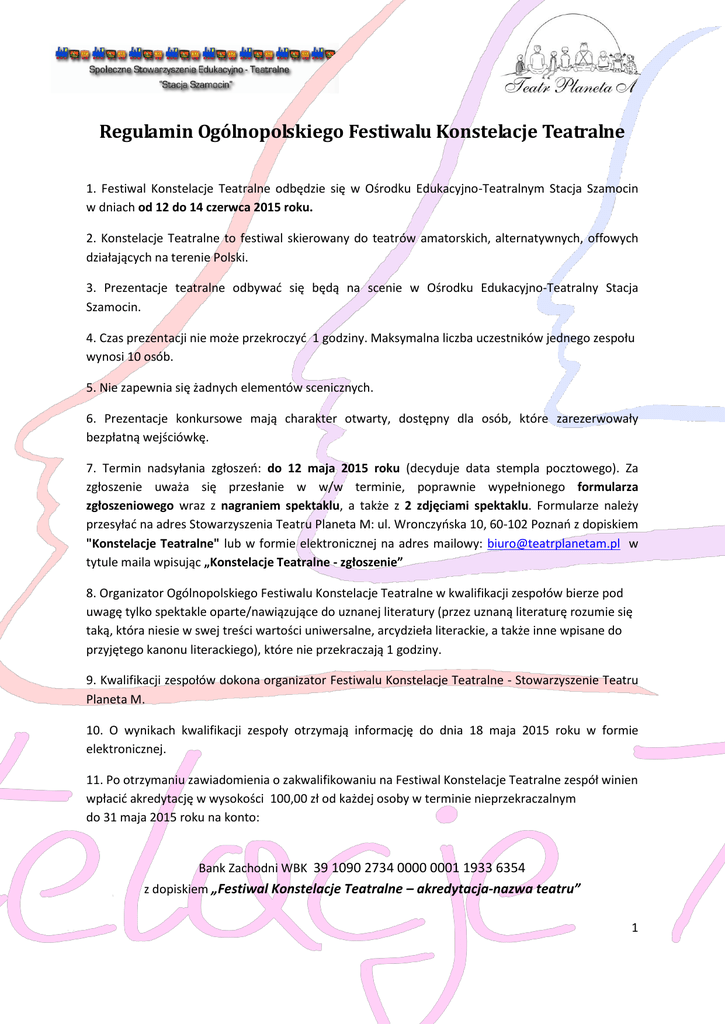 Regulamin Ogólnopolskiego Festiwalu Konstelacje Teatralne 1. Festiwal Konstelacje Teatralne odbędzie się w Ośrodku Edukacyjno-Teatralnym Stacja Szamocin w dniach od 12 do 14 czerwca 2015 roku. 2. Konstelacje Teatralne to festiwal skierowany do teatrów amatorskich, alternatywnych, offowych działających na terenie Polski. 3. Prezentacje teatralne odbywać się będą na scenie w Ośrodku Edukacyjno-Teatralny Stacja Szamocin. 4. Czas prezentacji nie może przekroczyć 1 godziny. Maksymalna liczba uczestników jednego zespołu wynosi 10 osób. 5. Nie zapewnia się żadnych elementów scenicznych. 6. Prezentacje konkursowe mają charakter otwarty, dostępny dla osób, które zarezerwowały bezpłatną wejściówkę. 7. Termin nadsyłania zgłoszeń: do 12 maja 2015 roku (decyduje data stempla pocztowego). Za zgłoszenie uważa się przesłanie w w/w terminie, poprawnie wypełnionego formularza zgłoszeniowego wraz z nagraniem spektaklu, a także z 2 zdjęciami spektaklu. Formularze należy przesyłać na adres Stowarzyszenia Teatru Planeta M: ul. Wronczyńska 10, 60-102 Poznań z dopiskiem "Konstelacje Teatralne" lub w formie elektronicznej na adres mailowy: [email protected] w tytule maila wpisując „Konstelacje Teatralne - zgłoszenie” 8. Organizator Ogólnopolskiego Festiwalu Konstelacje Teatralne w kwalifikacji zespołów bierze pod uwagę tylko spektakle oparte/nawiązujące do uznanej literatury (przez uznaną literaturę rozumie się taką, która niesie w swej treści wartości uniwersalne, arcydzieła literackie, a także inne wpisane do przyjętego kanonu literackiego), które nie przekraczają 1 godziny. 9. Kwalifikacji zespołów dokona organizator Festiwalu Konstelacje Teatralne - Stowarzyszenie Teatru Planeta M. 10. O wynikach kwalifikacji zespoły otrzymają informację do dnia 18 maja 2015 roku w formie elektronicznej. 11. Po otrzymaniu zawiadomienia o zakwalifikowaniu na Festiwal Konstelacje Teatralne zespół winien wpłacić akredytację w wysokości 100,00 zł od każdej osoby w terminie nieprzekraczalnym do 31 maja 2015 roku na konto: Bank Zachodni WBK 39 1090 2734 0000 0001 1933 6354 z dopiskiem „Festiwal Konstelacje Teatralne – akredytacja-nazwa teatru” 1 12. Jest możliwość uczestniczenia w festiwalu jako obserwator. Termin zgłoszenia do 20 maja 2015 r. Do 31 maja 2015r. należy uiścić opłatę akredytacyjną w wysokości 200,00 zł na konto podane w pkt. 11 regulaminu. Ilość obserwatorów ograniczona. 13. Organizatorzy Festiwalu Konstelacje Teatralne przewidują nagrody rzeczowe w wysokości 2000,00 zł dla zwycięzców konkursu, a także statuetki Konstelacji Teatralnych dla pierwszych trzech miejsc, nagrodę publiczności oraz nagrody specjalne. 14. Nagrody zostaną wręczone podczas uroczystej gali ostatniego dnia festiwalu. Obecność wszystkich uczestników obowiązkowa. 15. Organizator zapewnia uczestnikom Konstelacji Teatralnych: - noclegi (2), - wyżywienie [śniadania (2), obiadokolacje (3)], - udział w omówieniach i konsultacjach prowadzonych przez członków Jury, - udział we wszystkich spektaklach konkursowych, - udział w spektaklach gościnnych i imprezach towarzyszących, - materiały informacyjno-promocyjne. 16. Uczestnicy poniżej 18-stego roku życia zobowiązani są do otrzymania pisemnej zgody od rodzica/prawnego opiekuna na udział w festiwalu. Formularz zgody do pobrania ze strony internetowej www.teatrplanetam.pl 17. Organizatorzy nie zwracają uczestnikom kosztów podróży. 18. W sprawach nie ujętych w niniejszym regulaminie decydują Organizatorzy, mając na uwadze pełne zaspokojenie potrzeb uczestników Konstelacji Teatralnych (w miarę posiadania możliwości technicznych i organizacyjnych). 19. Biuro Organizacyjne: Stowarzyszenie Teatru Planeta M ul. Wronczyńska 10 60-102 Poznań tel. 725-690-601 e-mail: [email protected] 2
