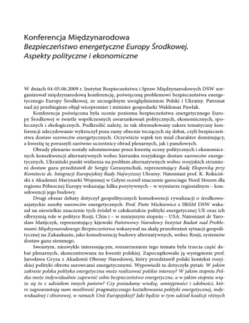 Konferencja Międzynarodowa Bezpieczeństwo energetyczne Europy Środkowej. Aspekty polityczne i ekonomiczne W dniach 04-05.06.2009 r. Instytut Bezpieczeństwa i Spraw Międzynarodowych DSW zorganizował międzynarodową konferencję, poświęconą problemowi bezpieczeństwa energetycznego Europy Środkowej, ze szczególnym uwzględnieniem Polski i Ukrainy. Patronat nad jej przebiegiem objął wicepremier i minister gospodarki Waldemar Pawlak. Konferencja poświęcona była ocenie poziomu bezpieczeństwa energetycznego Europy Środkowej w świetle współczesnych uwarunkowań politycznych, ekonomicznych, społecznych i ekologicznych. Podkreślić należy, że tak sformułowany zakres tematyczny konferencji zdecydowanie wykroczył poza ramy obecnie toczących się debat, czyli bezpieczeństwa dostaw surowców energetycznych. Oczywiście wątek ten miał charakter dominujący, a kwestię tę poruszyli zarówno uczestnicy obrad plenarnych, jak i panelowych. Obrady plenarne zostały zdominowane przez kwestię oceny politycznych i ekonomicznych konsekwencji alternatywnych wobec kierunku rosyjskiego dostaw surowców energetycznych. Ukraiński punkt widzenia na problem alternatywnych wobec rosyjskich strumieni dostaw gazu przedstawił dr Sergiy Gerasymchuk, reprezentujący Radę Ekspercką przy Komitecie ds. Integracji Europejskiej Rady Najwyższej Ukrainy. Natomiast prof. K. Rokiciński z Akademii Marynarki Wojennej w Gdyni ocenił znaczenie gazociagu Nord Streem dla regionu Północnej Europy wskazując kilka pozytywnych – w wymiarze regionalnym – konsekwencji jego budowy. Drugi obszar debaty dotyczył geopolitycznych konsekwencji rywalizacji o środkowoazjatyckie zasoby surowców energetycznych. Prof. Piotr Mickiewicz z IBiSM DSW wskazał na niewielkie znaczenie tych źródeł w całokształcie polityki energetycznej UE oraz ich olbrzymią role w polityce Rosji, Chin i – w mniejszym stopniu – USA. Natomiast dr Yaroslaw Matijczyk, reprezentujący kijowski Państwowy Narodowy Instytut Badań nad Problemami Międzynarodowego Bezpieczeństwa wskazywał na skalę przeobrażeń sytuacji geopolitycznej na Zakaukaziu, jako konsekwencję budowy alternatywnych, wobec Rosji, systemów dostaw gazu ziemnego. Swoistym, niezwykle interesującym, rozszerzeniem tego tematu była trzecia część debat plenarnych, skoncentrowana na kwestii polskiej. Zapoczątkowało ją wystąpienie prof. Jarosława Gryza z Akademii Obrony Narodowej, który przedstawił polski kontekst rosyjskiej polityki obrotu surowcami energetycznymi. Wypowiedź ta dotyczyła pytań: W jakim zakresie polska polityka energetyczna może realizować polskie interesy? W jakim stopniu Polska może indywidualnie zapewnić sobie bezpieczeństwo energetyczne, a w jakim stopniu wiąże się to z udziałem innych państw? Czy posiadamy wiedzę, umiejętności i zdolności, które zagwarantują nam możliwość pragmatycznego kształtowania polityki energetycznej, indywidualnej i zbiorowej, w ramach Unii Europejskiej? Jaki będzie w tym udział koalicji różnych KRONIKA NAUKOWA 263 partnerów? Z tezami tymi korespondowało następne wystąpienie prof. Krzysztofa Kubiaka z IBiSM DSW, w którym dokonał on oceny wyzwań, szans i zagrożeń budowy przez Polskę systemu dostaw gazu skroplonego. Wskazał ona na konieczność przeprowadzenia skorelowanej polityki inwestycyjnej w sferach gospodarki energetycznej (budowa kawern i systemu transportu lądowego), samego gazoportu oraz rozbudowy systemu ochrony linii transportowych. W drugim dniu obrad skoncentrowano się na dwóch zasadniczych problemach: rosyjskiej polityce obrotu surowcami w kontekście Europy Środkowej oraz ocenie poziomu bezpieczeństwa energetycznego Polski, jako konsekwencji globalnej rywalizacji o panowanie nad rynkiem obrotu surowcami energetycznymi. W pierwszym obszarze tej debaty przedstawiono założenia polityki energetycznej jako elementu strategii oddziaływania wewnętrznego i zewnętrznego Federacji Rosyjskiej (mgr Jerzy Pyka) oraz charakter i konsekwencje rosyjskich działań w sferze dostaw surowców energetycznych wobec Europy Środkowo-Wschodniej (dr Andzej Demkowicz, dr Katarzyna Wardin i mgr Anna Druszcz). Niejako podsumowaniem tego obszaru było wystąpienie mgr Filipa Tereszkiewicza przedstawiające instrumenty prawne i praktyczne możliwości oddziaływania Unii Europejskiej w sytuacji zagrożenia w sferze bezpieczeństwa energetycznego Europy Środkowej. Ocena poziomu bezpieczeństwa energetycznego Polski dokonana została poprzez analizę problemów szczegółowych, spośród których na pierwszy plan wysunęły się kwestie alternatywnych źródeł energii oraz oceny poziomu bezpieczeństwa energetycznego. Pierwsza kwestia sprowadzona została do pytania o znaczenie węgla kamiennego w polskim bilansie energetycznym (dr Marcin Sienkiewicz), możliwości wykorzystania alternatywnych źródeł energii w Polsce (dr Adam Olechowski) oraz konsekwencji, jakie stwarza dla polskiej polityki energetycznej pakiet klimatyczno-energetyczny (dr Helena Wyligała). N Natomiast sposób postrzegania poziomu bezpieczeństwa energetycznego przez polskie społeczeństwo przedstawiony został przez mgr Julitę Różak z Uniwersytetu Wrocławskiego, dyrektora Dolnośląskiego Urzędu Regulacji Energetyki mgr Monikę Gawlik oraz dr Wojciecha Kazaneckiego (Dolnośląski Ośrodek Studiów Strategicznych). J. Różak zaprezentowała prawne i polityczne uwarunkowania narodowej polityki energetycznej. M. Gawlik wskazała na skalę oraz charakter społecznych konsekwencji przeobrażeń polityki energetycznej państwa. Natomiast W. Kazanecki przedstawił obraz debaty publicznej dotyczącej kształtu polityki energetycznej państwa. Wypowiedzi te uzupełnione zostały wystąpieniem dr G. Tokarza, który dokonał oceny zaangażowania polskich służb specjalnych w kształtowanie i praktyczną realizację polityki energetycznej państwa. Szeroki i interdyscyplinarny charakter wystąpień j