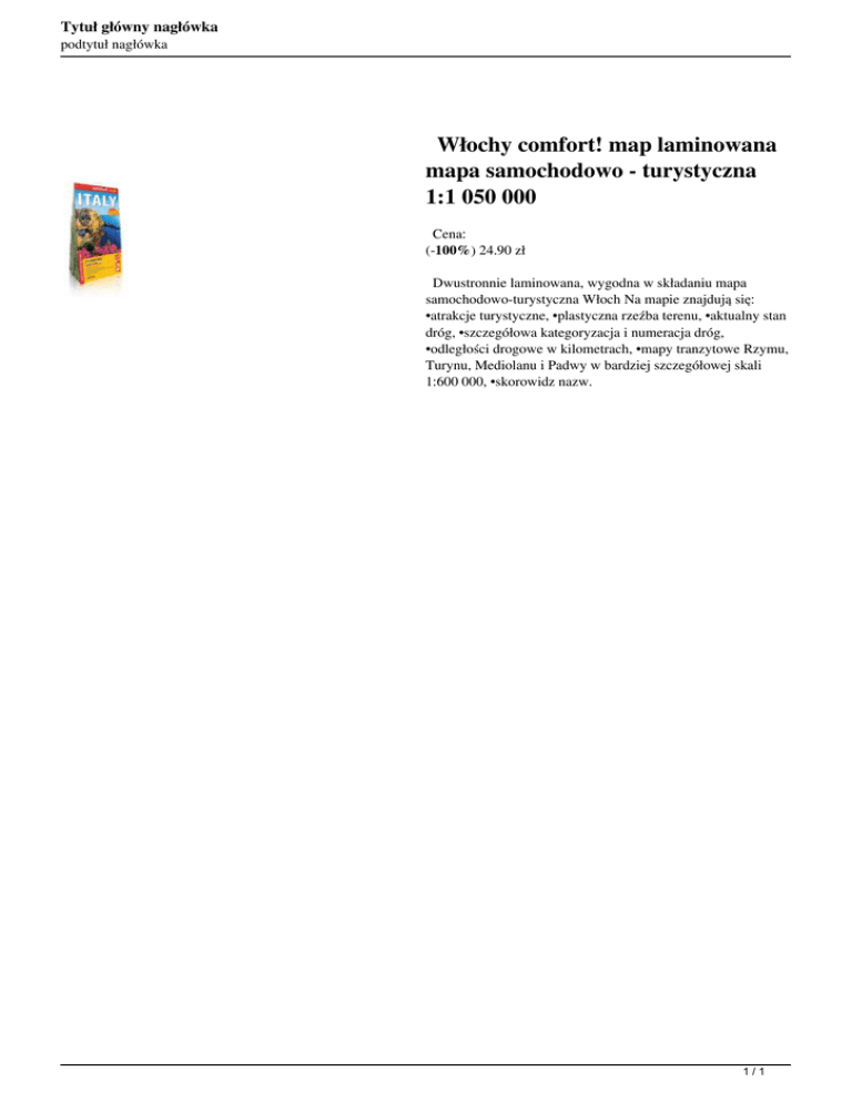 Tytuł główny nagłówka podtytuł nagłówka Włochy comfort! map laminowana mapa samochodowo - turystyczna 1:1 050 000 Cena: (-100%) 24.90 zł Dwustronnie laminowana, wygodna w składaniu mapa samochodowo-turystyczna Włoch Na mapie znajdują się: •atrakcje turystyczne, •plastyczna rzeźba terenu, •aktualny stan dróg, •szczegółowa kategoryzacja i numeracja dróg, •odległości drogowe w kilometrach, •mapy tranzytowe Rzymu, Turynu, Mediolanu i Padwy w bardziej szczegółowej skali 1:600 000, •skorowidz nazw. 1/1 Powered by TCPDF (www.tcpdf.org)