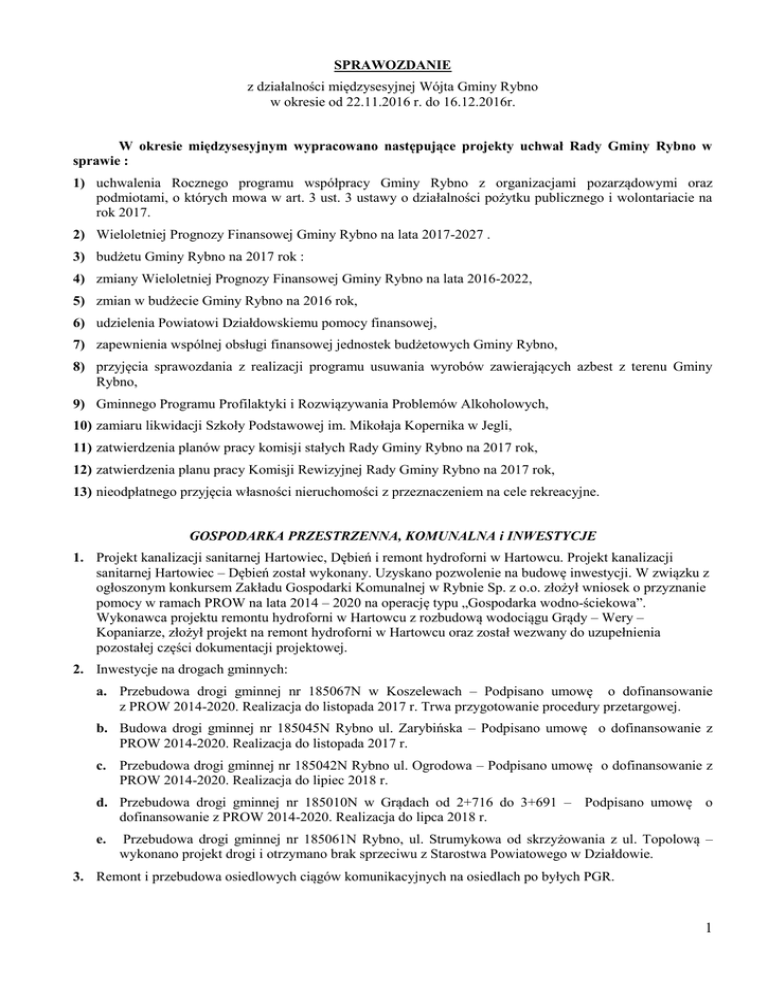 SPRAWOZDANIE z działalności międzysesyjnej Wójta Gminy Rybno w okresie od 22.11.2016 r. do 16.12.2016r. W okresie międzysesyjnym wypracowano następujące projekty uchwał Rady Gminy Rybno w sprawie : 1) uchwalenia Rocznego programu współpracy Gminy Rybno z organizacjami pozarządowymi oraz podmiotami, o których mowa w art. 3 ust. 3 ustawy o działalności pożytku publicznego i wolontariacie na rok 2017. 2) Wieloletniej Prognozy Finansowej Gminy Rybno na lata 2017-2027 . 3) budżetu Gminy Rybno na 2017 rok : 4) zmiany Wieloletniej Prognozy Finansowej Gminy Rybno na lata 2016-2022, 5) zmian w budżecie Gminy Rybno na 2016 rok, 6) udzielenia Powiatowi Działdowskiemu pomocy finansowej, 7) zapewnienia wspólnej obsługi finansowej jednostek budżetowych Gminy Rybno, 8) przyjęcia sprawozdania z realizacji programu usuwania wyrobów zawierających azbest z terenu Gminy Rybno, 9) Gminnego Programu Profilaktyki i Rozwiązywania Problemów Alkoholowych, 10) zamiaru likwidacji Szkoły Podstawowej im. Mikołaja Kopernika w Jegli, 11) zatwierdzenia planów pracy komisji stałych Rady Gminy Rybno na 2017 rok, 12) zatwierdzenia planu pracy Komisji Rewizyjnej Rady Gminy Rybno na 2017 rok, 13) nieodpłatnego przyjęcia własności nieruchomości z przeznaczeniem na cele rekreacyjne. GOSPODARKA PRZESTRZENNA, KOMUNALNA i INWESTYCJE 1. Projekt kanalizacji sanitarnej Hartowiec, Dębień i remont hydroforni w Hartowcu. Projekt kanalizacji sanitarnej Hartowiec – Dębień został wykonany. Uzyskano pozwolenie na budowę inwestycji. W związku z ogłoszonym konkursem Zakładu Gospodarki Komunalnej w Rybnie Sp. z o.o. złożył wniosek o przyznanie pomocy w ramach PROW na lata 2014 – 2020 na operację typu „Gospodarka wodno-ściekowa”. Wykonawca projektu remontu hydroforni w Hartowcu z rozbudową wodociągu Grądy – Wery – Kopaniarze, złożył projekt na remont hydroforni w Hartowcu oraz został wezwany do uzupełnienia pozostałej części dokumentacji projektowej. 2. Inwestycje na drogach gminnych: a. Przebudowa drogi gminnej nr 185067N w Koszelewach – Podpisano umowę o dofinansowanie z PROW 2014-2020. Realizacja do listopada 2017 r. Trwa przygotowanie procedury przetargowej. b. Budowa drogi gminnej nr 185045N Rybno ul. Zarybińska – Podpisano umowę o dofinansowanie z PROW 2014-2020. Realizacja do listopada 2017 r. c. Przebudowa drogi gminnej nr 185042N Rybno ul. Ogrodowa – Podpisano umowę o dofinansowanie z PROW 2014-2020. Realizacja do lipiec 2018 r. d. Przebudowa drogi gminnej nr 185010N w Grądach od 2+716 do 3+691 – Podpisano umowę o dofinansowanie z PROW 2014-2020. Realizacja do lipca 2018 r. e. Przebudowa drogi gminnej nr 185061N Rybno, ul. Strumykowa od skrzyżowania z ul. Topolową – wykonano projekt drogi i otrzymano brak sprzeciwu z Starostwa Powiatowego w Działdowie. 3. Remont i przebudowa osiedlowych ciągów komunikacyjnych na osiedlach po byłych PGR. 1 a. „Przebudowa drogi dojazdowej do pałacu w Rapatach gm. Rybno” o dł. 117m – Otrzymano dofinansowanie od Agencji Nieruchomości Rolnych OT w Olsztynie w kwocie 53 105,12 zł. b. Doprowadzenie do należytego stanu technicznego ciągu pieszo – jezdnego na działce nr 204 i nr 247 obręb Nowa Wieś w miejscowości Szczupliny gm. Rybno – ETAP II – Otrzymano dofinansowanie od Agencji Nieruchomości Rolnych OT w Olsztynie w kwocie 94 565,30 zł. W 2016 r. łącznie z ANR OT Olsztyn uzyskano pomoc w kwocie 412 445,36 zł. 4. Wykonano dokumentację projektową budynku w Rybnie przy ulicy Zajeziornej 58. Złożono wniosek o pozwolenie na budowę w Starostwie Powiatowym w Działdowie oraz wniosek o wycinkę drzew kolidujących z planowaną rozbudową. 5. Budowa kortu tenisowego w Rybnie – Przedsiębiorstwo Drogowo – Budowlane Sp. z o.o. z Brodnicy wykonało nawierzchnię asfaltową kortu tenisowego zgodnie z zawartą umową. Dnia 10.11.2016 r. dokonano komisyjnego odbioru wykonanych robót oraz przekazano obiekt do eksploatacji. Ponadto rozbudowano ogrodzenie kortu oraz rozpoczęto remont trybun drewnianych. 6. Zagospodarowanie terenu na boisko w miejscowości Tuczki –Zgłoszenie robót zostało przyjęte przez Starostwo Powiatowe w Działdowie. 7. Zagospodarowanie terenu na boisko w miejscowości Truszczyny – wykonano kolejną pielęgnację boiska. Mieszkańcy wykonują ogrodzenie. 8. Zagospodarowanie terenu na boisko w miejscowości Rumian – wykonano kolejną pielęgnację boiska. Mieszkańcy wykonują ogrodzenie. 9. Zagospodarowanie turystyczne terenu nad jeziorem Grądy – „Okno na jezioro” – wykonano dokumentację i zgłoszenie do Starostwa Powiatowego w Działdowie. Inwestycja oczekuje na możliwość sfinansowania. 10. Budowa świetlicy Wiejskiej w Hartowcu – dnia 03.10.2016 r. została wydana decyzja zatwierdzająca projekt budowlany i zostało udzielone pozwolenie na budowę. 11. Roboty publiczne i roboty bieżące: a. usunięto zakrzaczenia przy drodze Żabiny – Koszelewy, Rumian, Truszczyny, Kostkowo – Grądy, b. zakończono roboty publiczne. 12. Modernizacja energetyczna budynku komunalnego w Rybnie przy ul. Zajeziornej 58. W wyniku przeprowadzonej procedury udzielenia zamówienia publicznego w trybie zapytania ofertowego wyłoniono wykonawcę na wykonanie dokumentacji projektowej. 13. Modernizacja energetyczna budynku Urzędu Gminy w Rybnie. W wyniku przeprowadzonej procedury udzielenia zamówienia publicznego w trybie zapytania ofertowego wyłoniono wykonawcę na wykonanie dokumentacji projektowej. 14. Modernizacja energetyczna budynku szkoły Podstawowej w Koszelewach. W wyniku przeprowadzonej procedury udzielenia zamówienia publicznego w trybie zapytania ofertowego wyłoniono wykonawcę na wykonanie dokumentacji projektowej. 15. Modernizacja energetyczna budynku szkoły Podstawowej w Żabinach. 16. W wyniku przeprowadzonej procedury udzielenia zamówienia publicznego w trybie zapytania ofertowego wyłoniono wykonawcę na wykonanie dokumentacji projektowej. 17. Mode