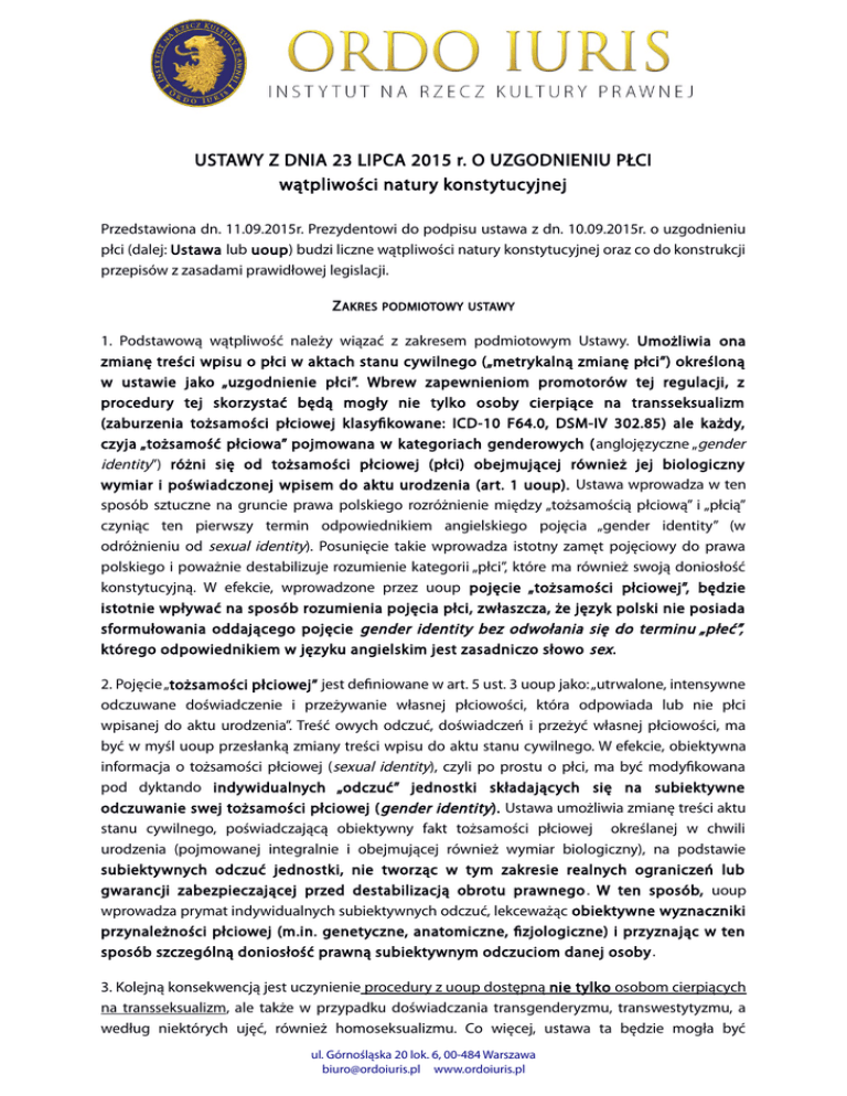 USTAWY Z DNIA 23 LIPCA 2015 r. O UZGODNIENIU PŁCI wątpliwości natury konstytucyjnej Przedstawiona dn. 11.09.2015r. Prezydentowi do podpisu ustawa z dn. 10.09.2015r. o uzgodnieniu płci (dalej: Ustawa lub uoup) budzi liczne wątpliwości natury konstytucyjnej oraz co do konstrukcji przepisów z zasadami prawidłowej legislacji. Z AKRES PODMIOTOWY USTAWY 1. Podstawową wątpliwość należy wiązać z zakresem podmiotowym Ustawy. Umożliwia ona zmianę treści wpisu o płci w aktach stanu cywilnego („metrykalną zmianę płci”) określoną w ustawie jako „uzgodnienie płci”. Wbrew zapewnieniom promotorów tej regulacji, z procedury tej skorzystać będą mogły nie tylko osoby cierpiące na transseksualizm (zaburzenia tożsamości płciowej klasyfikowane: ICD-10 F64.0, DSM-IV 302.85) ale każdy, czyja „tożsamość płciowa” pojmowana w kategoriach genderowych ( anglojęzyczne „gender identity”) różni się od tożsamości płciowej (płci) obejmującej również jej biologiczny wymiar i poświadczonej wpisem do aktu urodzenia (art. 1 uoup). Ustawa wprowadza w ten sposób sztuczne na gruncie prawa polskiego rozróżnienie między „tożsamością płciową” i „płcią” czyniąc ten pierwszy termin odpowiednikiem angielskiego pojęcia „gender identity” (w odróżnieniu od sexual identity). Posunięcie takie wprowadza istotny zamęt pojęciowy do prawa polskiego i poważnie destabilizuje rozumienie kategorii „płci”, które ma również swoją doniosłość konstytucyjną. W efekcie, wprowadzone przez uoup pojęcie „tożsamości płciowej”, będzie istotnie wpływać na sposób rozumienia pojęcia płci, zwłaszcza, że język polski nie posiada sformułowania oddającego pojęcie gender identity bez odwołania się do terminu „płeć”, którego odpowiednikiem w języku angielskim jest zasadniczo słowo sex . 2. Pojęcie „tożsamości płciowej” jest definiowane w art. 5 ust. 3 uoup jako: „utrwalone, intensywne odczuwane doświadczenie i przeżywanie własnej płciowości, która odpowiada lub nie płci wpisanej do aktu urodzenia”. Treść owych odczuć, doświadczeń i przeżyć własnej płciowości, ma być w myśl uoup przesłanką zmiany treści wpisu do aktu stanu cywilnego. W efekcie, obiektywna informacja o tożsamości płciowej (sexual identity), czyli po prostu o płci, ma być modyfikowana pod dyktando indywidualnych „odczuć” jednostki składających się na subiektywne odczuwanie swej tożsamości płciowej ( gender identity ). Ustawa umożliwia zmianę treści aktu stanu cywilnego, poświadczającą obiektywny fakt tożsamości płciowej określanej w chwili urodzenia (pojmowanej integralnie i obejmującej również wymiar biologiczny), na podstawie subiektywnych odczuć jednostki, nie tworząc w tym zakresie realnych ograniczeń lub gwarancji zabezpieczającej przed destabilizacją obrotu prawnego . W ten sposób, uoup wprowadza prymat indywidualnych subiektywnych odczuć, lekceważąc obiektywne wyznaczniki przynależności płciowej (m.in. genetyczne, anatomiczne, fizjologiczne) i przyznając w ten sposób szczególną doniosłość prawną subiektywnym odczuciom danej osoby . 3. Kolejną konsekwencją jest uczynienie procedury z uoup dostępną nie tylko osobom cierpiących na transseksualizm, ale także w przypadku doświadczania transgenderyzmu, transwestytyzmu, a według niektórych ujęć, również homoseksualizmu. Co więcej, ustawa ta będzie mogła być ul. Górnośląska 20 lok. 6, 00-484 Warszawa [email protected] www.ordoiuris.pl wykorzystywana przez osoby, których zaburzenia tożsamości płciowej są spowodowane zaburzeniami psychicznymi, takimi jak schizofrenia, czy choroba afektywna dwubiegunowa. Wszcząć tę procedurę będą mogli wreszcie również wszyscy, którzy z jakichkolwiek innych przyczyn czują się, lub przynajmniej tak twierdzą, osobnikami płci odmiennej do tej, którą stwierdzono u nich przy urodzeniu i co znalazło urzędowe potwierdzenie w ich akcie urodzenia. Tym samym, uoup będzie destabilizowała pojmowanie ludzkiej płciowości na gruncie prawa polskiego, podobnie jak samo pojęcie „płci”, które ma doniosłość konstytucyjną. B RAK OGRANICZEŃ PROCEDURALNYCH Wprowadzona przez uoup procedura bynajmniej nie porządkuje ani nie tworzy realnych wymagań proceduralnych, lecz służy szybkiej i rutynowej wręcz zmianie treści aktu stanu cywilnego dotyczącej płci. 1) art. 4 ust. 1 czyni procedurę „uzgodnienia” postępowaniem nieprocesowym, a zgodnie z ust. 4 tego artykułu, jego jedynym uczestnikiem będzie mógł być wnioskodawca, a więc osoba wnioskująca o „uzgodnienie”. Przepis automatycznie wyklucza więc możliwość uczestnictwa innych osób, jak np. małoletnich dzieci wnioskodawcy, arbitralnie wyłączając możliwość ochrony ich interesów. 2) art. 6 ust. 2, wskazuje kierunek orzekania przez sądy: „Sąd może ograniczyć postępowanie dowodowe do dowodów z dokumentów załączonych do wniosku i dowodu z przesłuchania wnioskodawcy”. W konsekwencji, uoup ogranicza rolę sędziego do badania spełnienia wymogów formalnych i wysłuchania wnioskodawcy, by następnie orzec zgodnie z jego wnioskiem. 3) art. 6 ust. 7 wprowadza możliwość udziału w postępowaniu organizacji pozarządowych, które działają na rzecz „osób zagrożonych dyskryminacją lub osób doświadczających dyskryminacji”. To uczestnictwo jest jednak uzależnione od zgody osoby zainteresowanej zmianą płci i należy uznać, że służy dopuszczeniu jedynie organizacji działających na rzecz destabilizacji kryterium płci. 4) W celu dokonania zmiany płci wystarczy przedstawić dwa orzeczenia uzyskane od lekarzy o specjalizacji psychiatrycznej lub seksuologicznej, dowolnie wybranych przez osobę zainteresowaną (!). Orzeczenia te nie muszą stwierdzać transseksualizmu wnioskodawcy, ale jedynie występowanie „tożsamości płciowej” (w rozumieniu art. 5 ust. 3 uoup) od