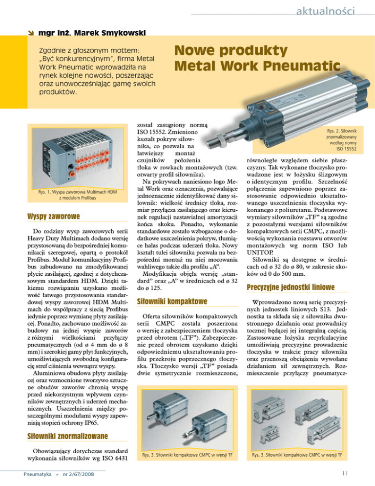 aktualności mgr inż. Marek Smykowski Zgodnie z głoszonym mottem: „Być konkurencyjnym”, firma Metal Work Pneumatic wprowadziła na rynek kolejne nowości, poszerzając oraz unowocześniając gamę swoich produktów. Rys. 1. Wyspa zaworowa Multimach HDM z modułem Profibus Wyspy zaworowe Do rodziny wysp zaworowych serii Heavy Duty Multimach dodano wersję przystosowaną do bezpośredniej komunikacji szeregowej, opartą o protokół Profibus. Moduł komunikacyjny Profibus zabudowano na zmodyfikowanej płycie zasilającej, zgodnej z dotychczasowym standardem HDM. Dzięki takiemu rozwiązaniu uzyskano możliwość łatwego przystosowania standardowej wyspy zaworowej HDM Multimach do współpracy z siecią Profibus jedynie poprzez wymianę płyty zasilającej. Ponadto, zachowano możliwość zabudowy na jednej wyspie zaworów z różnymi wielkościami przyłączy pneumatycznych (od ø 4 mm do ø 8 mm) i szerokiej gamy płyt funkcyjnych, umożliwiających swobodną konfigurację stref ciśnienia wewnątrz wyspy. Aluminiowa obudowa płyty zasilającej oraz wzmocnione tworzywo sztuczne obudów zaworów chronią wyspę przed niekorzystnym wpływem czynników zewnętrznych i uderzeń mechanicznych. Uszczelnienia między poszczególnymi modułami wyspy zapewniają stopień ochrony IP65. Nowe produkty Metal Work Pneumatic został zastąpiony normą ISO 15552. Zmieniono kształt pokryw siłownika, co pozwala na łatwiejszy montaż czujników położenia tłoka w rowkach montażowych (tzw. otwarty profil siłownika). Na pokrywach naniesiono logo Metal Work oraz oznaczenia, pozwalające jednoznacznie zidentyfikować dany siłownik: wielkość średnicy tłoka, rozmiar przyłącza zasilającego oraz kierunek regulacji nastawialnej amortyzacji końca skoku. Ponadto, wykonanie standardowe zostało wzbogacone o dodatkowe uszczelnienia pokryw, tłumiące hałas podczas uderzeń tłoka. Nowy kształt tulei siłownika pozwala na bezpośredni montaż na niej mocowania wahliwego także dla profilu „A”. Modyfikacja objęła wersję „standard” oraz „A” w średnicach od ø 32 do ø 125. Siłowniki kompaktowe Rys. 2. Siłownik znormalizowany według normy ISO 15552 równoległe względem siebie płaszczyzny. Tak wykonane tłoczysko prowadzone jest w łożysku ślizgowym o identycznym profilu. Szczelność połączenia zapewniono poprzez zastosowanie odpowiednio ukształtowanego uszczelnienia tłoczyska wykonanego z poliuretanu. Podstawowe wymiary siłowników „TF” są zgodne z pozostałymi wersjami siłowników kompaktowych serii CMPC, z możliwością wykonania rozstawu otworów montażowych wg norm ISO lub UNITOP. Siłowniki są dostępne w średnicach od ø 32 do ø 80, w zakresie skoków od 0 do 500 mm. Precyzyjne jednostki liniowe Oferta siłowników kompaktowych serii CMPC została poszerzona o wersję z zabezpieczeniem tłoczyska przed obrotem („TF”). Zabezpieczenie przed obrotem uzyskano dzięki odpowiedniemu ukształtowaniu profilu przekroju poprzecznego tłoczyska. Tłoczysko wersji „TF” posiada dwie symetrycznie rozmieszczone, Wprowadzono nową serię precyzyjnych jednostek liniowych S13. Jednostka ta składa się z siłownika dwustronnego działania oraz prowadnicy tocznej będącej jej integralną częścią. Zastosowane łożyska recyrkulacyjne umożliwiają precyzyjne prowadzenie tłoczyska w trakcie pracy siłownika oraz przenoszą obciążenia wywołane działaniem sił zewnętrznych. Rozmieszczenie przyłączy pneumatycz- Rys. 3. Siłowniki kompaktowe CMPC w wersji TF Rys. 3. Siłowniki kompaktowe CMPC w wersji TF Siłowniki znormalizowane Obowiązujący dotychczas standard wykonania siłowników wg ISO 6431 Pneumatyka » nr 2/67/2008 11 aktualności wersjach. Podstawowa wersja zwiększa dwukrotnie wartość ciśnienia w stosunku do wartości ciśnienia powietrza zasilającego. W tej wersji zmiana wartości ciśnienia wyjściowego jest możliwa tylko i wyłącznie poprzez zmianę Rys. 5. Pneumatyczny wzmacniacz ciśnienia wartości ciśnienia powietrza zanych pozwala na zasilanie siłownika silającego. Natomiast w wersji druz trzech stron, a wykonanie otworów giej zastosowano zabudowany zawór montażowych na wszystkich płaszczy- redukcyjny, który zezwala na regulaznach korpusu jednostki daje wiele cję wartości ciśnienia wyjściowego. możliwości jej montażu. Cechy te czy- Obie wersje dostępne są w dwóch nią jednostkę S13 urządzeniem uni- wielkościach: ø 40 i ø 63. wersalnym, mogącym znaleźć zastosoPneumatyczny wzmacniacz znajwanie we wszystkich sektorach prze- duje zastosowanie w instalacjach mysłu. pneumatycznych wymagających loDostępne są następujące wielkości kalnego podniesienia wartości ciśśrednic jednostek S13: ø 6, ø 10, ø 16 nienia sprężonego powietrza, np. oraz ø 20, o standardowych długoś- przed jednym lub kilkoma siłowniciach skoku 10, 25 i 50 mm. kami zamontowanymi na końcu instalacji. Pneumatyczne wzmacniacze ciśnienia Program produkcyjny Metal Work Pneumatic poszerzono o pneumatyczny wzmacniacz ciśnienia. Urządzenie to jest dostępne w dwóch Rys. 6. Precyzyjny zawór redukcyjny 12 Precyzyjne zawory redukcyjne Metal Work zaprezentował nową linię precyzyjnych zaworów redukcyjnych z pełnym przepływem wstecznym. Zawory te są dedykowane do zastosowania w instalacjach wymagających możliwie wysokiej precyzji nastawy, utrzymania zadanego ciśnienia na stałym poziomie oraz wysokich wartości przepływu w obydwu kierunkach. Zawór utrzymuje zadane ciśnienie z dokładnością ±20 mbarów (przy zmianie ciśnienia zasilającego od 4 do 10 barów), a czułość zaworu spustowego wynosi 30 mbarów. Precyzyjne zawory redukcyjne dostępne są w dwóch wielkościach: 1/8” i 1/4” oraz w trzech zakresach nastawy ciśnienia wyjściowego: 0÷2, 0÷4 i 0÷8 barów. Zawory redukcyjne z blokadą Rozszerzono także ofertę dotychczas dostępnych zaworów redukcyjnych o wersje z blokadą. Zawór redukcyjny z blokadą p