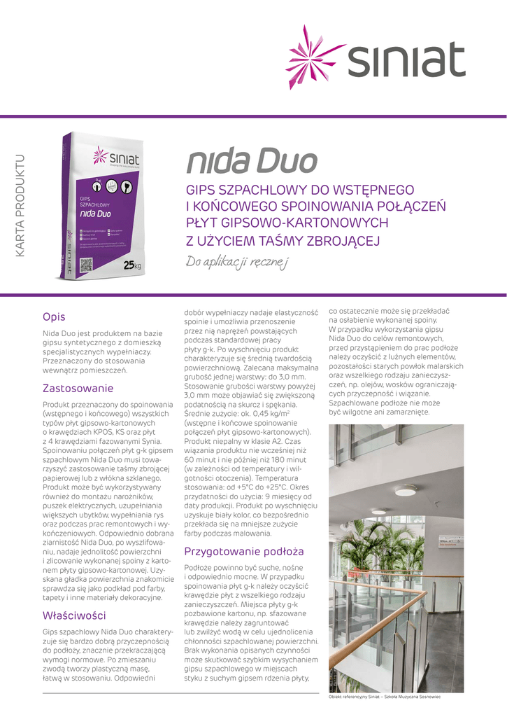 KARTA PRODUKTU Duo GIPS SZPACHLOWY DO WSTĘPNEGO I KOŃCOWEGO SPOINOWANIA POŁĄCZEŃ PŁYT GIPSOWO-KARTONOWYCH Z UŻYCIEM TAŚMY ZBROJĄCEJ Do aplikacji ręcznej Opis Nida Duo jest produktem na bazie gipsu syntetycznego z domieszką specjalistycznych wypełniaczy. Przeznaczony do stosowania wewnątrz pomieszczeń. Zastosowanie Produkt przeznaczony do spoinowania (wstępnego i końcowego) wszystkich typów płyt gipsowo-kartonowych o krawędziach KPOS, KS oraz płyt z 4 krawędziami fazowanymi Synia. Spoinowaniu połączeń płyt g-k gipsem szpachlowym Nida Duo musi towarzyszyć zastosowanie taśmy zbrojącej papierowej lub z włókna szklanego. Produkt może być wykorzystywany również do montażu narożników, puszek elektrycznych, uzupełniania większych ubytków, wypełniania rys oraz podczas prac remontowych i wykończeniowych. Odpowiednio dobrana ziarnistość Nida Duo, po wyszlifowaniu, nadaje jednolitość powierzchni i zlicowanie wykonanej spoiny z kartonem płyty gipsowo-kartonowej. Uzyskana gładka powierzchnia znakomicie sprawdza się jako podkład pod farby, tapety i inne materiały dekoracyjne. Właściwości Gips szpachlowy Nida Duo charakteryzuje się bardzo dobrą przyczepnością do podłoży, znacznie przekraczającą wymogi normowe. Po zmieszaniu zwodą tworzy plastyczną masę, łatwą w stosowaniu. Odpowiedni dobór wypełniaczy nadaje elastyczność spoinie i umożliwia przenoszenie przez nią naprężeń powstających podczas standardowej pracy płyty g-k. Po wyschnięciu produkt charakteryzuje się średnią twardością powierzchniową. Zalecana maksymalna grubość jednej warstwy: do 3,0 mm. Stosowanie grubości warstwy powyżej 3,0 mm może objawiać się zwiększoną podatnością na skurcz i spękania. Średnie zużycie: ok. 0,45 kg/m2 (wstępne i końcowe spoinowanie połączeń płyt gipsowo-kartonowych). Produkt niepalny w klasie A2. Czas wiązania produktu nie wcześniej niż 60 minut i nie później niż 180 minut (w zależności od temperatury i wilgotności otoczenia). Temperatura stosowania: od +5°C do +25°C. Okres przydatności do użycia: 9 miesięcy od daty produkcji. Produkt po wyschnięciu uzyskuje biały kolor, co bezpośrednio przekłada się na mniejsze zużycie farby podczas malowania. co ostatecznie może się przekładać na osłabienie wykonanej spoiny. W przypadku wykorzystania gipsu Nida Duo do celów remontowych, przed przystąpieniem do prac podłoże należy oczyścić z luźnych elementów, pozostałości starych powłok malarskich oraz wszelkiego rodzaju zanieczyszczeń, np. olejów, wosków ograniczających przyczepność i wiązanie. Szpachlowane podłoże nie może być wilgotne ani zamarznięte. Przygotowanie podłoża Podłoże powinno być suche, nośne i odpowiednio mocne. W przypadku spoinowania płyt g-k należy oczyścić krawędzie płyt z wszelkiego rodzaju zanieczyszczeń. Miejsca płyty g-k pozbawione kartonu, np. sfazowane krawędzie należy zagruntować lub zwilżyć wodą w celu ujednolicenia chłonności szpachlowanej powierzchni. Brak wykonania opisanych czynności może skutkować szybkim wysychaniem gipsu szpachlowego w miejscach styku z suchym gipsem rdzenia płyty, Obiekt referencyjny Siniat – Szkoła Muzyczna Sosnowiec NIDA DUO – GIPS SZPACHLOWY DO WSTĘPNEGO I KOŃCOWEGO SPOINOWANIA POŁĄCZEŃ PŁYT Podłoże z nalotami pleśni, mchów i grzybów należy oczyścić. Każdorazowo wykonawca jest zobowiązany do oceny powierzchni przed szpachlowaniem oraz do podjęcia decyzji o uprzednim zastosowaniu środka gruntującego (powierzchnie chłonne). W przypadku szpachlowania gładkich podłoży betonowych należy zastosować grunt z piaskiem kwarcowym Supra W. Stabilne i czyste tynki gipsowe nie wymagają gruntowania. Nie należy stosować zbyt stężonych preparatów gruntujących i gruntów głęboko penetrujących. Stosować standardowe akrylowe preparaty gruntujące zachowując rozcieńczenie 1:1 w stosunku z wodą. nakładając na podłoże za pomocą gładkiej metalowej pacy lub szpachelki. Po wyschnięciu, ewentualne nierówności usunąć drobną siatką ścierną. Wszelkie niedokładności należy ponownie cienko zaszpachlować. Szlifowanie możliwe dopiero po całkowitym wyschnięciu wyszpachlowanej powierzchni. Aplikacja w temperaturze otoczenia i podłoża od +5°C do +25°C. Sposób użycia Do przygotowania i nakładania gipsu szpachlowego należy stosować czyste narzędzia wykonane z materiałów nie-rdzewnych. Do rozrabiania używać czystej wody oraz wiadra wykonanego z tworzywa sztucznego. Suchą mieszankę należy rozrabiać poprzez powolne wsypywanie jej do wody, w proporcjach ok. 1,0 kg proszku na 0,40 l wody. Całość należy wymieszać ręcznie lub spiralnym mieszadłem wolnoobrotowym do uzyskania jednorodnej konsystencji. Konsystencja przygotowanej masy zależy od jej przeznaczenia. Przed nakładaniem odczekać ok. 5 minut od momentu urobienia, a następnie ponownie wymieszać. Tak przygotowaną masę należy zużyć w ciągu maksymalnie 100 minut Narzędzia Gips szpachlowy nanosić na podłoże przy pomocy pacy lub szpachelki. Transport i składowanie Transportować oraz przechowywać na drewnianych paletach, w oryginalnym nieuszkodzonym opakowaniu oraz w suchych warunkach. Produkt należy chronić przed wilgocią. Przy spełnionych warunkach produkt ma okres przydatności 9 miesięcy od daty produkcji. Dane techniczne Zastosowanie wewnątrz obiektów budowlanych Reakcja na ogień klasa A2, s1-d0 Przyczepność do płyty g-k > 0,25 MPa Wytrzymałość na zginanie > 100 N Czas obróbki ok. 100 minut Czas wiązania nie wcześniej niż 60 minut, nie później niż 180 minut Przybliżone zużycie ok. 0,30 kg/m2 – spoinowanie połączeń płyt g-k ok. 0,15 kg/m2 – ostateczne wykańczanie połączeń płyt g-k Maksymalna grubość jednej warstwy do 3,0 mm Proporcje mieszanki 0,40 l wody na 1 kg produktu Temperatura stosowania temperatura podłoża i otoczenia od +5°C do +25°C K
