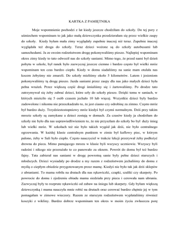 KARTKA Z PAMIĘTNIKA Moje wspomnienie pochodzi z lat kiedy jeszcze chodziłam do szkoły. Do tej pory z uśmiechem wspominam to jak jako małą dziewczynka przedzierałam się przez wielkie zaspy do szkoły. Kiedy byłam mała zimy wyglądały zupełnie inaczej niż teraz. Zupełnie inaczej wyglądała też droga do szkoły. Teraz dzieci wożone są do szkoły autobusami lub samochodami. Ja ze swoim rodzeństwem drogę pokonywaliśmy pieszo. Najlepiej wspominam okres zimy kiedy to tato odwoził nas do szkoły saniami. Mimo tego, że przed nami był dzień pobytu w szkole, był ranek było zazwyczaj jeszcze ciemno i bardzo często był wielki mróz wspominam ten czas bardzo ciepło. Kiedy w domu siadaliśmy na sanie mam otulała nas kocem żebyśmy nie zmarzli. Do szkoły mieliśmy około 5 kilometrów. Latem i jesieniom pokonywaliśmy tą drogę pieszo. Jazda saniami przez zaspy dla nas jako małych dzieci była pełna wrażeń. Przez większą część drogi śmialiśmy się i żartowaliśmy. Po drodze tato zatrzymywał się żeby zabrać dzieci, które szły do szkoły pieszo. Dzięki temu w saniach, w których mieściło się 5 osób czasem jechało 10 lub więcej. Wszystkie dzieci były bardzo zadowolone i nikomu nie przeszkadzało to, że jest ciasno czy odrobinę za zimno. Często mróz był bardzo duży. Trzydziestostopniowy mróz kiedyś był czymś normalnym. Dziś przy takim mrozie szkoły są zamykane a dzieci zostają w domach. Za czasów kiedy ja chodziłam do szkoły nie było dla nas usprawiedliwieniem to, że nie przyszłam do szkoły bo był duży śnieg lub wielki mróz. W szkołach też nie było takich wygód jak dziś, nie było centralnego ogrzewania. W każdej klasie centralnym punktem w zimie był kaflowy piec, w którym palono, żeby w Sali było ciepło. Często nauczyciel w trakcie lekcji przerywał żeby podłożyć drewna do pieca. Mimo panującego mrozu w klasie byli wszyscy uczniowie. Wszyscy byli radośni i nikogo nie przerażało to co panowało za oknem. Powrót do domu był też bardzo fajny. Tata zabierał nas saniami w drogę powrotną sanie były pełne dzieci starszych i młodszych. Dzieci wysiadały po drodze a my razem z rodzeństwem jechaliśmy do domu z myślą o ciepłym obiedzie przygotowanym przez mamę. Kiedyś nie było tak jak dziś sklepów z ubraniami. To mama robiła na drutach dla nas rękawiczki, czapki, szaliki czy skarpety. Po powrocie do domu i zjedzeniu obiadu mama siedziała przy piecu i cerowała nam ubrania. Zazwyczaj były to rozprute rękawiczki od zabaw na śniegu lub skarpety. Gdy byłam większą dziewczynką i mama nauczyła mnie robić na drutach oraz cerować bardzo chętnie jej w tym pomagałam w zimowe wieczory. Razem ze starszym rodzeństwem wyplataliśmy również koszyki z wikliny. Bardzo dobrze wspominam ten okres w moim życiu zwłaszcza porę zimową. Ze względu na pracę w polu latem rodzice nie mieli dla nas tyle czasu. Dlatego zimą cieszyliśmy się, gdy mogliśmy spędzać popołudnia razem.