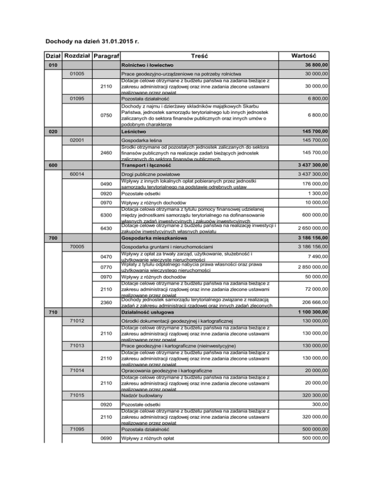 Dochody na dzień 31.01.2015 r. Dział Rozdział Paragraf Treść Wartość Rolnictwo i łowiectwo 36 800,00 30 000,00 2110 Prace geodezyjno-urządzeniowe na potrzeby rolnictwa Dotacje celowe otrzymane z budżetu państwa na zadania bieżące z zakresu administracji rządowej oraz inne zadania zlecone ustawami realizowane przez powiat Pozostała działalność 0750 Dochody z najmu i dzierżawy składników majątkowych Skarbu Państwa, jednostek samorządu terytorialnego lub innych jednostek zaliczanych do sektora finansów publicznych oraz innych umów o podobnym charakterze 010 01005 01095 020 02001 2460 600 60014 0490 0920 0970 6300 6430 700 70005 0470 0770 0970 2110 2360 710 71012 2110 71013 2110 71014 2110 71015 0920 2110 71095 0690 30 000,00 6 800,00 6 800,00 Leśnictwo 145 700,00 Gospodarka leśna Środki otrzymane od pozostałych jednostek zaliczanych do sektora finansów publicznych na realizacje zadań bieżących jednostek zaliczanych do sektora finansów publicznych Transport i łączność 145 700,00 Drogi publiczne powiatowe Wpływy z innych lokalnych opłat pobieranych przez jednostki samorządu terytorialnego na podstawie odrębnych ustaw Pozostałe odsetki Wpływy z różnych dochodów Dotacja celowa otrzymana z tytułu pomocy finansowej udzielanej między jednostkami samorządu terytorialnego na dofinansowanie własnych zadań inwestycyjnych i zakupów inwestycyjnych Dotacje celowe otrzymane z budżetu państwa na realizację inwestycji i zakupów inwestycyjnych własnych powiatu Gospodarka mieszkaniowa Gospodarka gruntami i nieruchomościami Wpływy z opłat za trwały zarząd, użytkowanie, służebność i użytkowanie wieczyste nieruchomości Wpłaty z tytułu odpłatnego nabycia prawa własności oraz prawa użytkowania wieczystego nieruchomości Wpływy z różnych dochodów Dotacje celowe otrzymane z budżetu państwa na zadania bieżące z zakresu administracji rządowej oraz inne zadania zlecone ustawami realizowane przez powiat Dochody jednostek samorządu terytorialnego związane z realizacją zadań z zakresu administracji rządowej oraz innych zadań zleconych Działalność usługowa 145 700,00 3 437 300,00 3 437 300,00 176 000,00 1 300,00 10 000,00 600 000,00 2 650 000,00 3 186 156,00 3 186 156,00 7 490,00 2 850 000,00 50 000,00 72 000,00 206 666,00 1 100 300,00 Ośrodki dokumentacji geodezyjnej i kartograficznej Dotacje celowe otrzymane z budżetu państwa na zadania bieżące z zakresu administracji rządowej oraz inne zadania zlecone ustawami realizowane przez powiat Prace geodezyjne i kartograficzne (nieinwestycyjne) Dotacje celowe otrzymane z budżetu państwa na zadania bieżące z zakresu administracji rządowej oraz inne zadania zlecone ustawami realizowane przez powiat Opracowania geodezyjne i kartograficzne Dotacje celowe otrzymane z budżetu państwa na zadania bieżące z zakresu administracji rządowej oraz inne zadania zlecone ustawami realizowane przez powiat Nadzór budowlany 130 000,00 Pozostałe odsetki Dotacje celowe otrzymane z budżetu państwa na zadania bieżące z zakresu administracji rządowej oraz inne zadania zlecone ustawami realizowane przez powiat Pozostała działalność 300,00 320 000,00 Wpływy z różnych opłat 500 000,00 130 000,00 130 000,00 130 000,00 20 000,00 20 000,00 320 300,00 500 000,00 750 75011 2110 75020 327 287,00 Urzędy wojewódzkie Dotacje celowe otrzymane z budżetu państwa na zadania bieżące z zakresu administracji rządowej oraz inne zadania zlecone ustawami realizowane przez powiat Starostwa powiatowe 124 550,00 0690 Wpływy z różnych opłat 0750 Dochody z najmu i dzierżawy składników majątkowych Skarbu Państwa, jednostek samorządu terytorialnego lub innych jednostek zaliczanych do sektora finansów publicznych oraz innych umów o podobnym charakterze 0830 Wpływy z usług 0970 Wpływy z różnych dochodów 75045 2110 2120 75095 0970 752 75212 2110 754 75411 0920 2110 75414 2110 756 75618 0420 0490 75622 75832 2920 1 500,00 19 000,00 10 000,00 90 000,00 2 000,00 Pozostałe wydatki obronne Dotacje celowe otrzymane z budżetu państwa na zadania bieżące z zakresu administracji rządowej oraz inne zadania zlecone ustawami realizowane przez powiat Bezpieczeństwo publiczne i ochrona przeciwpożarowa 2 000,00 3 499 319,00 Komendy powiatowe Państwowej Straży Pożarnej 3 495 319,00 Pozostałe odsetki Dotacje celowe otrzymane z budżetu państwa na zadania bieżące z zakresu administracji rządowej oraz inne zadania zlecone ustawami realizowane przez powiat Obrona cywilna Dotacje celowe otrzymane z budżetu państwa na zadania bieżące z zakresu administracji rządowej oraz inne zadania zlecone ustawami realizowane przez powiat Dochody od osób prawnych, od osób fizycznych i od innych jednostek nieposiadających osobowości prawnej oraz wydatki związane z ich poborem Wpływy z innych opłat stanowiących dochody jednostek samorządu terytorialnego na podstawie ustaw Wpływy z opłaty komunikacyjnej Wpływy z innych lokalnych opłat pobieranych przez jednostki samorządu terytorialnego na podstawie odrębnych ustaw Udziały powiatów w podatkach stanowiących dochód budżetu państwa 2920 0920 49 077,00 Obrona narodowa Różne rozliczenia Część oświatowa subwencji ogólnej dla jednostek samorządu terytorialnego Subwencje ogólne z budżetu państwa 75814 1 360,00 90 000,00 Podatek dochodowy od osób prawnych 2920 31 800,00 Wpływy z różnych dochodów 0020 75803 83 737,00 29 000,00 Podatek dochodowy od osób fizycznych 75801 124 550,00 Kwalifikacja wojskowa Dotacje celowe otrzymane z budżetu państwa na zadania bieżące z zakresu administracji rządowej oraz inne zadania zlecone ustawami realizowane przez powiat Dotacje celowe otrzymane z budżetu państwa na zadania bieżące realizowane przez powiat na podstawie porozumień z organami administracji rządowej Pozostała działalność 0010 758 801 Administracja publiczna 2 000,00 3 000,00 3 492 319,00 4 000,00 4 000,00 10 238 293