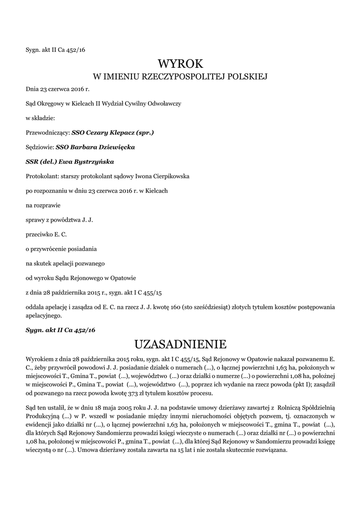 Sygn. akt II Ca 452/16 WYROK W IMIENIU RZECZYPOSPOLITEJ POLSKIEJ Dnia 23 czerwca 2016 r. Sąd Okręgowy w Kielcach II Wydział Cywilny Odwoławczy w składzie: Przewodniczący: SSO Cezary Klepacz (spr.) Sędziowie: SSO Barbara Dziewięcka SSR (del.) Ewa Bystrzyńska Protokolant: starszy protokolant sądowy Iwona Cierpikowska po rozpoznaniu w dniu 23 czerwca 2016 r. w Kielcach na rozprawie sprawy z powództwa J. J. przeciwko E. C. o przywrócenie posiadania na skutek apelacji pozwanego od wyroku Sądu Rejonowego w Opatowie z dnia 28 października 2015 r., sygn. akt I C 455/15 oddala apelację i zasądza od E. C. na rzecz J. J. kwotę 160 (sto sześćdziesiąt) złotych tytułem kosztów postępowania apelacyjnego. Sygn. akt II Ca 452/16 UZASADNIENIE Wyrokiem z dnia 28 października 2015 roku, sygn. akt I C 455/15, Sąd Rejonowy w Opatowie nakazał pozwanemu E. C., żeby przywrócił powodowi J. J. posiadanie działek o numerach (...), o łącznej powierzchni 1,63 ha, położonych w miejscowości T., Gmina T., powiat (...), województwo (...) oraz działki o numerze (...) o powierzchni 1,08 ha, położnej w miejscowości P., Gmina T., powiat (...), województwo (...), poprzez ich wydanie na rzecz powoda (pkt I); zasądził od pozwanego na rzecz powoda kwotę 373 zł tytułem kosztów procesu. Sąd ten ustalił, że w dniu 18 maja 2005 roku J. J. na podstawie umowy dzierżawy zawartej z Rolniczą Spółdzielnią Produkcyjną (...) w P. wszedł w posiadanie między innymi nieruchomości objętych pozwem, tj. oznaczonych w ewidencji jako działki nr (...), o łącznej powierzchni 1,63 ha, położonych w miejscowości T., gmina T., powiat (...), dla których Sąd Rejonowy Sandomierzu prowadzi księgi wieczyste o numerach (...) oraz działki nr (...) o powierzchni 1,08 ha, położonej w miejscowości P., gmina T., powiat (...), dla której Sąd Rejonowy w Sandomierzu prowadzi księgę wieczystą o nr (...). Umowa dzierżawy została zawarta na 15 lat i nie została skutecznie rozwiązana. E. C. jest obecnie właścicielem nieruchomości objętych pozwem wspólnie z żoną A. C.. Pozwany wzywał powoda do wydania tych działek. Dnia 20 marca 2015 roku pracownik E. C., na polecenie pozwanego, wbrew woli powoda, wjechał pługiem na działki o numerach (...) , na których był posiany rzepak i zaorał je. J. J. zgłosił to na Komisariacie Policji w O.. Interwencja policji zakończyła się sporządzeniem notatki urzędowej. Dnia 18 kwietnia 2015 roku pracownik E. C., wbrew woli powoda, zaorał działkę nr (...), na której było pszenżyto ozime. J. J. wezwał na miejsce zdarzenia policję. Interwencja zakończyła się sporządzeniem notatki. Pozwany był obecny podczas zaorania nieruchomości. Wskutek tych czynności objął on w posiadanie wymienione działki, nie dysponując tytułem prawnym zobowiązującym powoda do ich wydania. Mając to względzie, w oparciu o przepisy art. 344 k.c. oraz 478 i 479 k.p.c. Sąd Rejonowy uznał powództwo za zasadne, albowiem pozwany dokonał bezprawnego naruszenia posiadania powoda. O kosztach procesu orzeczono na podstawie art.98 § 1 i § 3 k.p.c. Apelację od tego orzeczenia wywiódł pozwany, zaskarżając je w całości i zarzucając: - naruszenie art. 233 k.p.c. poprzez przekroczenie granic swobodnej oceny dowodów i przyjęcie, wbrew zasadom logiki i doświadczenia życiowego, że pozwany samowolnie naruszył posiadanie spornych nieruchomości, podczas gdy kilkukrotnie wzywał on powoda do zaprzestania naruszania własności pozwanego, prosząc go o opuszczenie nieruchomości i wskazując na swoje prawo, co powód konsekwentnie ignorował, - błąd w ustaleniach przyjętych za podstawę wyroku, polegający na przyjęciu, że działania pozwanego były bezprawne, mimo iż E. C. w chwili usunięcia powoda z nieruchomości był ich jedynym właścicielem, a jego zachowanie zmierzało do ochrony jego prawa, - naruszenie art. 222 k.c. poprzez jego niezastosowanie, mimo że powód, wzywany do zaprzestania naruszeń, konsekwentnie odmawiał wydania pozwanemu nieruchomości i naruszał tym samy jego prawo własności, - naruszenie art. 5 k.c. poprzez przewrócenie powodowi posiadania nieruchomości należących do pozwanego, który wielokrotnie wzywał powoda do zaprzestania naruszanie prawa własności oraz opuszczenia nieruchomości, co ten ignorował, naruszając prawo własności E. C., wskutek czego właściciel został pozbawiony prawa do korzystania ze swojej nieruchomości. Wskazując na to, skarżący wniósł o zmianę wyroku i oddalenie powództwa w całości, ewentualnie o uchylenie orzeczenia i przekazanie sprawy do ponownego rozpoznania. W odpowiedzi na apelację powód wniósł o jej oddalenie i zasądzenie na jego rzecz od pozwanego kosztów procesu. Sąd Okręgowy zważył, co następuje. Apelacja jest bezzasadna. Zgodnie z art. 344 § 1 k.c., przeciwko temu, kto samowolnie naruszył posiadanie, jak również przeciwko temu, na czyją korzyść naruszenie nastąpiło, przysługuje posiadaczowi roszczenie o przywrócenie stanu poprzedniego i o zaniechanie naruszeń. Roszczenie to nie jest zależne od dobrej wiary posiadacza ani od zgodności posiadania ze stanem prawnym, chyba że prawomocne orzeczenie sądu lub innego powołanego do rozpoznawania spraw tego rodzaju organu państwowego stwierdziło, że stan posiadania powstały na skutek naruszenia jest zgodny z prawem. Samowolne naruszenie posiadania polega na bezprawnym wkroczeniu w sferę władztwa faktycznego posiadacza. Następuje to wówczas, że osoba dokonująca naruszenia nie była do tego upoważniona, tzn. że było ono obiektywnie bezprawne, przy czym zła lub dobra wiara nie ma tu żadnego znaczenia. Naruszenie posiadania tylko wtedy nie będzie samowolne, gdy istnieje podstawa prawna usprawiedliwiająca wkroczenie w zakres cudzego posiadania. Podstawą taką może być wyraźny przepis prawa, orzeczenie sądowe, decyzja administracyjna, a także zgoda samego posiadacza. Żadna