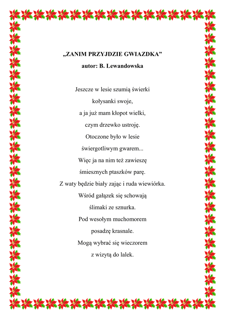 „ZANIM PRZYJDZIE GWIAZDKA” autor: B. Lewandowska Jeszcze w lesie szumią świerki kołysanki swoje, a ja już mam kłopot wielki, czym drzewko ustroję. Otoczone było w lesie świergotliwym gwarem... Więc ja na nim też zawieszę śmiesznych ptaszków parę. Z waty będzie biały zając i ruda wiewiórka. Wśród gałązek się schowają ślimaki ze sznurka. Pod wesołym muchomorem posadzę krasnale. Mogą wybrać się wieczorem z wizytą do lalek.