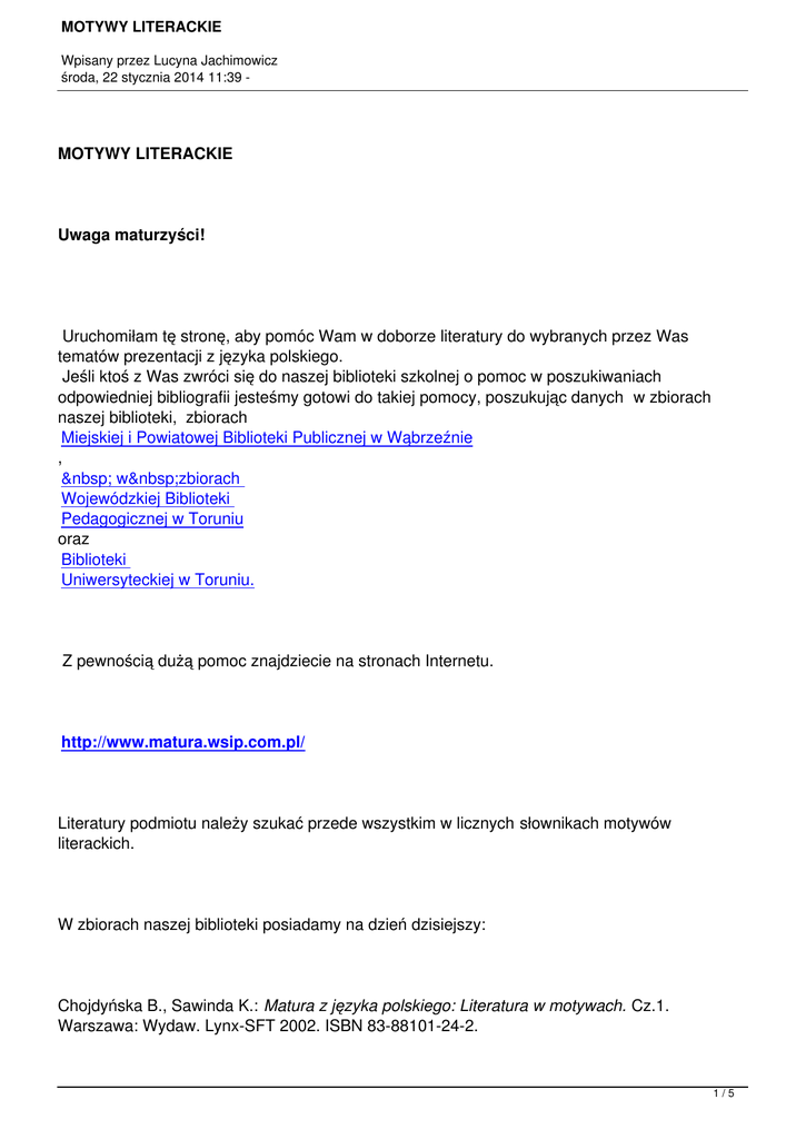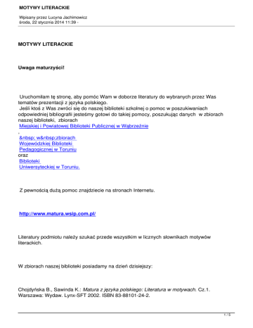 MOTYWY LITERACKIE Wpisany przez Lucyna Jachimowicz środa, 22 stycznia 2014 11:39 - MOTYWY LITERACKIE Uwaga maturzyści! Uruchomiłam tę stronę, aby pomóc Wam w doborze literatury do wybranych przez Was tematów prezentacji z języka polskiego. Jeśli ktoś z Was zwróci się do naszej biblioteki szkolnej o pomoc w poszukiwaniach odpowiedniej bibliografii jesteśmy gotowi do takiej pomocy, poszukując danych w zbiorach naszej biblioteki, zbiorach Miejskiej i Powiatowej Biblioteki Publicznej w Wąbrzeźnie , w zbiorach Wojewódzkiej Biblioteki Pedagogicznej w Toruniu oraz Biblioteki Uniwersyteckiej w Toruniu. Z pewnością dużą pomoc znajdziecie na stronach Internetu. http://www.matura.wsip.com.pl/ Literatury podmiotu należy szukać przede wszystkim w licznych słownikach motywów literackich. W zbiorach naszej biblioteki posiadamy na dzień dzisiejszy: Chojdyńska B., Sawinda K.: Matura z języka polskiego: Literatura w motywach. Cz.1. Warszawa: Wydaw. Lynx-SFT 2002. ISBN 83-88101-24-2. 1/5 MOTYWY LITERACKIE Wpisany przez Lucyna Jachimowicz środa, 22 stycznia 2014 11:39 - Drabarek B., Falkowski J., Rowińska I.: Szkolny słownik motywów literackich. Wyd.4. Warszawa: Wydaw. KRAM 2004. ISBN 83-86075-72-4. Józefczyk K.: Zdasz maturę z języka polskiego: motywy literackie. Cz. 1. Łódź: Piątek Trzynastego 1998. ISBN 83-87735-11-6. Józefczyk K.: Zdasz maturę z języka polskiego: motywy literackie. Cz. 2. Łódź: Piątek Trzynastego 2002. ISBN 83-87735-33-7. Nosowska D.: Leksykon motywów literackich. Bielsko-Biała: Wydaw. Park Sp.z o.o. 2004. ISBN 83-7266-366-1. Nosowska D.: Słownik scen literackich. Bielsko-Biała: Wydaw. Park Sp.z o.o. 2005. ISBN 83-7266-420-X. Stopka D., Nawrot A.: Motywy literackie. Cz. 1. Kraków: Wydaw. Greg [2004]. ISBN 83-7327-365-4. Stopka D., Nawrot A.: Motywy literackie. Cz. 2. Kraków: Wydaw. Greg [2004]. ISBN 83-7327-366-2. Vademecum maturzysty - język polski 2. Aut. Małgorzata Nowakowska i in. Warszawa: Wydaw. Lynx - SFT 1999. ISBN 83-88101-04-8. 2/5 MOTYWY LITERACKIE Wpisany przez Lucyna Jachimowicz środa, 22 stycznia 2014 11:39 - Dom, ojczyzna, macierzyństwo, miłość, zdrada... - te i inne motywy ludzkość zna od zarania. Przez lata i stulecia pisarze, malarze, rzeźbiarze, a później także twórcy teatralni i filmowi sięgali do znanych tematów i twórczo je przekształcali. Dlatego właśnie zapisane w dawnych tekstach stare prawdy odnajdujemy we współczesnych tekstach kultury. Warto pamiętać o motywach starych jak świat i motywach funkcjonujących od niedawna, motywach wyeksploatowanych i motywach przez lata okrytych milczeniem. Warto pamiętać o tym, co przez wieki łączy nie tylko artystów. Strony internetowe zawierające motywy (i nie tylko) http://muzea.com.pl http://w> ww.archiwa.gov.pl http://www.filmpolski.pl/fp http://ebib.oss.wroc.pl/ http://monika.uniw.gda.pl/ łiterat/bibula/0002.html - teksty utworów literackich http://www.impresjonizm.art.pl http://www.collegium-novum.pl http://ebook.pl 3/5 MOTYWY LITERACKIE Wpisany przez Lucyna Jachimowicz środa, 22 stycznia 2014 11:39 - Dużo materiałów możecie znaleźć w czasopiśmie Cogito - wkładki (do wglądu w czytelni biblioteki). Literatura przedmiotu do różnych motywów - bp.ostroleka.pl http://www.maturka.pl/strony/motywy.htm Motywy literackie - www.motywy-literackie.klp.pl Motywy literackie - www.motywy.friko.pl SzkołaSerwis - www. szkola.gery.pl Uczniak - motywy literackie - uczniak.com http:// www.bibliofilur.republika.pl/namiary.htm http:// republika.pl/biblioteka_zsz1/motywy.htm l 4/5 MOTYWY LITERACKIE Wpisany przez Lucyna Jachimowicz środa, 22 stycznia 2014 11:39 - Galeria Malarstwa Polskiego - www.pinakoteka.zascianek.pl Malarstwo & Rzeźba Top-100 - www.malarstwo.top-100.pl Malarstwo Polskie - www.webart.omikron.com.pl National Gallery of Art - www.nga.gov Sztuka Polska - http://www.artyzm.com/ 5/5