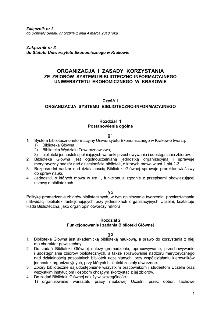 Załącznik nr 2 do Uchwały Senatu nr 6/2010 z dnia 4 marca 2010 roku Załącznik nr 3 do Statutu Uniwersytetu Ekonomicznego w Krakowie ORGANIZACJA I ZASADY KORZYSTANIA ZE ZBIORÓW SYSTEMU BIBLIOTECZNO-INFORMACYJNEGO UNIWERSYTETU EKONOMICZNEGO W KRAKOWIE Część I ORGANIZACJA SYSTEMU BIBLIOTECZNO-INFORMACYJNEGO Rozdział 1 Postanowienia ogólne 1. 2. 3. 4. §1 System biblioteczno-informacyjny Uniwersytetu Ekonomicznego w Krakowie tworzą: 1) Biblioteka Główna, 2) Biblioteka Wydziału Towaroznawstwa, 3) biblioteki jednostek spełniających warunki przechowywania i udostępniania zbiorów. Biblioteka Główna jest ogólnouczelnianą jednostką organizacyjną i sprawuje merytoryczny nadzór nad działalnością bibliotek, o których mowa w ust.1 pkt.2-3. Bezpośredni nadzór nad działalnością Biblioteki Głównej sprawuje prorektor właściwy do spraw nauki. Jednostki, o których mowa w ust.1, funkcjonują zgodnie z przepisami obowiązującej ustawy o bibliotekach. §2 Politykę gromadzenia zbiorów bibliotecznych, w tym opiniowanie tworzenia, przekształcania i likwidacji bibliotek funkcjonujących przy jednostkach organizacyjnych Uczelni, kształtuje Rada Biblioteczna, jako organ opiniotwórczy rektora. Rozdział 2 Funkcjonowanie i zadania Biblioteki Głównej 1. 2. 3. 4. §3 Biblioteka Główna jest akademicką biblioteką naukową, a prawo do korzystania z niej ma charakter powszechny. Do zadań Biblioteki Głównej należy gromadzenie, opracowywanie, przechowywanie i udostępnianie zbiorów bibliotecznych, a także sprawowanie nadzoru merytorycznego nad działalnością pozostałych bibliotek uczelnianych, przy współdziałaniu kierowników jednostek organizacyjnych, przy których biblioteki zostały utworzone. Zbiory biblioteczne są udostępniane wszystkim pracownikom i studentom Uczelni oraz wszystkim instytucjom i osobom chcącym skorzystać z jej zbiorów. Do zadań Biblioteki Głównej należy w szczególności: 1) organizowanie warsztatu pracy naukowej Uczelni przez dobór, fachowe 1 5. opracowanie, właściwe przechowywanie i udostępnianie zbiorów, prowadzenie działalności informacyjnej oraz prac bibliograficznych i dokumentacyjnych umożliwiających jak najszersze wykorzystanie zbiorów Biblioteki, jak również wyszukiwanie informacji o dokumentach poza zasobami Biblioteki, 2) rejestracja publikacji naukowych pracowników Uczelni, 3) współudział w kształceniu młodzieży studiującej i młodej kadry naukowej poprzez prowadzenie zajęć z przysposobienia bibliotecznego oraz innych, na zlecenie jednostek organizacyjnych Uczelni, a także poprzez organizowanie wystaw, 4) wspieranie procesów dydaktycznych i naukowo-badawczych realizowanych w Uczelni poprzez tworzenie dostępu online do cyfrowych kopii zabytków piśmiennictwa ze zbiorów Biblioteki Głównej, wybranych skryptów, monografii, rozpraw doktorskich oraz innych materiałów (wymienione wydawnictwa udostępniane są w ramach biblioteki cyfrowej dostępnej bezpośrednio ze strony internetowej Biblioteki Głównej), 5) prowadzenie, samodzielnie lub we współpracy z innymi bibliotekami, prac badawczych w zakresie bibliotekoznawstwa i informacji naukowej, dokumentacji oraz prac edytorskich, w szczególności dotyczących tekstów źródłowych zawartych w zbiorach systemu biblioteczno-informacyjnego Uczelni, 6) współpraca z placówkami badawczymi, ośrodkami dokumentacji i innymi instytucjami w zakresie specjalności Uczelni, służąca rozwojowi badań naukowych i zastosowaniu wiedzy do potrzeb praktyki gospodarczej, 7) współpraca z bibliotekami ekonomicznymi w celu wspólnego pozyskiwania źródeł informacji, 8) obsługa potrzeb naukowych i dydaktycznych Uczelni w zakresie poszerzania zasobów bibliotecznych, 9) koordynacja działalności bibliotek zakładowych i nadzór nad pracą systemu informacyjno-bibliotecznego Uczelni, 10) promocja i popularyzowanie systemu informacyjno-bibliotecznego Uczelni – jego zbiorów, zasobów i usług. W skład Biblioteki Głównej wchodzą jednostki, zapewniające jej właściwe funkcjonowanie w następujących obszarach: 1) organizacja i administracja, 2) gromadzenie zbiorów, 3) opracowanie zbiorów, 4) kontrola i selekcja zbiorów, 5) informacja naukowa, 6) czytelnie, 7) wypożyczenia miejscowe i międzybiblioteczne, 8) komputeryzacja biblioteki, 9) digitalizacja zbiorów. Część II ZASADY KORZYSTANIA ZE ZBIORÓW Rozdział 3 Ogólne zasady udostępniania zbiorów 1. §4 Ilekroć w niniejszych zasadach jest mowa o: 1) Uczelni - należy przez to rozumieć Uniwersytet Ekonomiczny w Krakowie, 2) Bibliotece Głównej - należy przez to rozumieć Bibliotekę Główną Uniwersytetu Ekonomicznego w Krakowie. 2 2. 3. 4. 5. 6. 7. 8. 9. 10. 11. 12. 13. 14. 15. Ogólne zasady korzystania ze zbiorów systemu biblioteczno-informacyjnego Uczelni wynikają z przepisów obowiązującej ustawy o bibliotekach Ze zbiorów bibliotecznych można korzystać w czytelniach na miejscu oraz poprzez wypożyczanie indywidualne i międzybiblioteczne, z zastrzeżeniem ust.4. Z zasobów elektronicznych korzystać można na zasadach zgodnych z warunkami licencji oraz z przepisami wewnętrznymi. Obowiązkiem czytelnika jest zapoznanie się z zasadami korzystania ze zbiorów oraz obowiązującymi przepisami. Biblioteka Główna jest skomputeryzowana, posiada sieć komputerową, komputerowe katalogi, rejestrację czytelników, wypożyczeń i zwrotów, a także własną stronę internetową. Komputery są w pierwszej kolejności przeznaczone do korzystania ze zbiorów bibliotecznych. Wszyscy zarejestrowani czytelnicy mogą na terenie Biblioteki Głównej korzystać z bezprzewodowego dostępu do internetu, po spełnieniu warunków określonych w Karcie użytkownika bezprzewodowej sieci bibliotecznej WiFi. Wszyscy pracownicy i studenci Uczelni mogą korzystać ze zdalnego dostępu do baz danych Biblioteki Głównej, po spełnieniu tych samych warunków, jakie określa Karta użytkownika bezprzewo