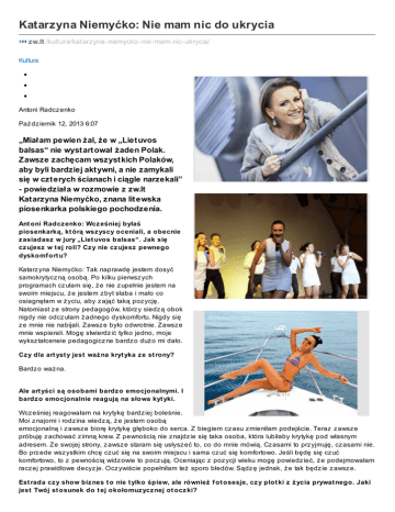 Katarzyna Niemyćko: Nie mam nic do ukrycia zw.lt /kultura/katarzyna-niemycko-nie-mam-nic-ukrycia/ Kultura Antoni Radcz enko Paź dz iernik 12, 2013 6:07 „Miałam pewien żal, że w „Liet uvos balsas“ nie wyst art ował żaden Polak. Zawsze zachęcam wszyst kich Polaków, aby byli bardziej akt ywni, a nie zamykali się w czt erych ścianach i ciągle narzekali” - powiedziała w rozmowie z zw.lt Kat arzyna Niemyćko, znana lit ewska piosenkarka polskiego pochodzenia. Ant oni Radcz enko: Wcz eśniej byłaś piosenkarką, kt órą wsz yscy oceniali, a obecnie z asiadasz w jury „Liet uvos balsas“. Jak się cz ujesz w t ej roli? Cz y nie cz ujesz pewnego dyskomf ort u? Katarz yna Niemyćko: Tak naprawdę jestem dosyć samokrytycz ną osobą. Po kilku pierwsz ych programach cz ułam się, ż e nie z upełnie jestem na swoim miejscu, ż e jestem z byt słaba i mało co osiagnęłam w ż yciu, aby z ająć taką poz ycję. Natomiast z e strony pedagogów, którz y siedz ą obok nigdy nie odcz ułam ż adnego dyskomfortu. Nigdy się z e mnie nie nabijali. Zawsz e było odwrotnie. Zawsz e mnie wspierali. Mogę stwierdz ić tylko jedno, moje wyksz tałceneie pedagogicz ne bardz o duż o mi dało. Cz y dla art yst y jest waż na kryt yka z e st rony? Bardz o waż na. Ale art yści są osobami bardz o emocjonalnymi. I bardz o emocjonalnie reagują na słowa kyt yki. Wcz eśniej reagowałam na krytykę bardz iej boleśnie. Moi z najomi i rodz ina wiedz ą, ż e jestem osobą emocjonalną i z awsz e biorę krytykę głęboko do serca. Z biegiem cz asu z mieniłam podejście. Teraz z awsz e próbuję z achować z imną krew. Z pewnością nie z najdz ie się taka osoba, która lubiłaby krytykę pod własnym adresem. Ze swojej strony, z awsz e staram się usłysz eć to, co do mnie mówią. Cz asami to prz yjmuję, cz asami nie. Bo prz ede wsz ystkim chcę cz uć się na swoim miejscu i sama cz uć się komfortowo. Jeśli będę się cz uć komfortowo, to z pewnością widz owie to pocz ują. Oceniając z poz ycji wieku mogę powiedz ieć, ż e podejmowałam racz ej prawidłowe decyz je. Ocz ywiście popełniłam też sporo błedów. Sądz ę jednak, ż e tak będz ie z awsz e. Est rada cz y show biz nes t o nie t ylko śpiew, ale również f ot osesje, cz y plot ki z ż ycia prywat nego. Jaki jest Twój st osunek do t ej okołomuz ycz nej ot ocz ki? Kiedy z acz ynałam karierę, duż o mi o tym mówiono, ż e dookoła będz ie więcej brudu niż rz ecz y poz ytywnych. Owsz em, roz umiem, ż e tak powinno być. Sama z resz tą interesuję się ż yciem innych gwiaz d. Być moż e nie tyle się ciekawię ż yciem prywatnym. Natomiast ciekawi mnie to co każ dą kobietę, cz yli garderoba, makijaż , styl, cz y to co jest modne. Więc to jest normalne, ż e ludz i interesuje moje ż ycie prywatne. Zawsz e staram się być taką z wykłą Kasią. Nigdy nie miałam cz ego ukrywać. Moje podejście jest takie – jeśli o cz ymś nie będę chciała mówić, to po prostu z ostawię to tylko dla siebie. Naraz ie nie mam cz ego ukrywać. Jestem sz cz ęśliwa, bo mam ukochaną osobę (Deividas Zvonkus – prz yp.red.). Dz ięki Bogu, mam ż ywych i w miarę z drowych rodz iców. Duż o kolegów i osób, które mnie wspierają. Takich osób jest ciągle więcej. Więc sądz ę, ż e jestem na dobrej drodz e. Cz asami z adają mi podobne pytania: dlacz ego jesteś taka otwarta i o wsz ystkim mówisz . To z awsz e odpowiadam: nie mam nic do ukrycia, nikogo nie z abiłam, ani okradłam. Natomiast, jeśli ludz ie chcą wiedz ieć, ż e jestem sz cz ęsliwa, to mówię o tym prosto z mostu. Ocz ywiście nie moż na oddać siebie całej, z awsz e trz eba z achować pewną cz ąstkę prywatności dla siebie. To jaką byś dała radę pocz ąt kującym art yst om? Jak mają z achowywać się, kiedy prasa z acz yna z adawać niewygodne pyt ania? Z własnego doświadcz enia wiem, ż e cz asami mówiłam z a duż o. Cz asami powiesz jakąś głupotę. Po prostu cię poniesie. Więc z awsz e warto prz ed tym pomysleć, co chcesz powiedz ieć. Nie trz eba mówić głupot. Jednak do tego trz eba dojrz eć i prz yz wycz aić się do tych pytań. Bo cz asami pytanie moż e być tak z adane, ż e po prostu otwierasz się na całego. A póź niej napisz ą o tobie niez byt prz ychylnie. Z własnego doświadcz enia mogę powiedz ieć jedno, ż e z ostałam taka jaką byłam dotycz as, sz cz era i otwarta. Cz yli sz cz erość się opłaca? Ocz ywiście. Cz asami z a swoją sz cz erość dostajesz po głowie i myślisz , ż e to już jest koniec. Wracasz do domu, opusz cz asz ręce i z astanawiasz się nad z mianą z awodu. Mam jednak takie motto: jutro będz ie nowy dz ień. Więc z rana wstaję, jest piekna pogoda i poz ytywna energia na nowo mnie wypełnia. Po prostu na negatywne rz ecz y nie trz eba z wracać uwagi. Od kilku lat robisz karierę na lit ewskiej est radz ie, ale nie z pominasz o swoich korz eniach. Cz ęst o grasz na polskich imprez ach. Ost at nio grałaś w Miednikach. Cz y t woi producenci nie mówią ci, ż e t o nie jest t woja publicz ność, ż e t racisz cz as… Jest odwrotnie. Bardz o mnie w tym wspierają. Nawet niektórz y z az drosz cz ą mi tego, co mam. Roz mawiałam niedawno z głównym producentem „Lietuvos balsas“. Opowiedz iał mi, jak o mnie usłysz ał. Prz ed kilkoma laty z najomy powiedz iał mu, ż e jest taka Polka, która z biera tysiące na sali. A tego nie potrafi z robić każ da gwiaz da litewska. I z a kilka lat pojawia się na scenie Katarz yna Niemyćko i ten jego kolega mówi, to właśnie jest ta Polka. Trz eba mieć dług wdz ięcz ności wobec osób, które ciebie wspierają. A któż to, jeśli nie Polacy. Cz ęść osób z arz uca mi, ż e ostatnio robię tego mniej, ale ostatnio mam bardz o napięty hormonogram z ajęć. Nie z awsz e udaje się prz yjechać, z aśpiewać tam, gdz ie bym chciała. Chciałabym odwiedz ić jak najwięcej miejsc i niekoniecz nie