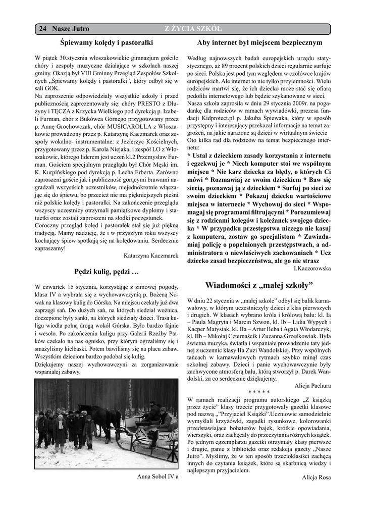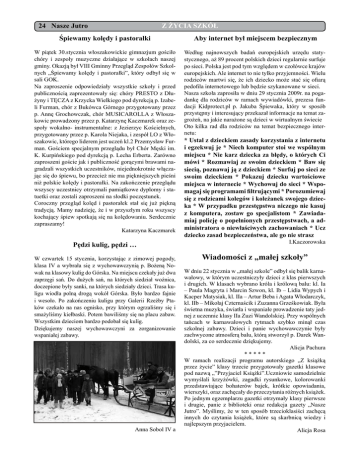 24 Nasze Jutro Z ŻYCIA SZKÓŁ Śpiewamy kolędy i pastorałki Aby internet był miejscem bezpiecznym W piątek 30.stycznia włoszakowickie gimnazjum gościło chóry i zespoły muzyczne działające w szkołach naszej gminy. Okazją był VIII Gminny Przegląd Zespołów Szkolnych „Śpiewamy kolędy i pastorałki”, który odbył się w sali GOK. Na zaproszenie odpowiedziały wszystkie szkoły i przed publicznością zaprezentowały się: chóry PRESTO z Dłużyny i TĘCZA z Krzycka Wielkiego pod dyrekcją p. Izabeli Furman, chór z Bukówca Górnego przygotowany przez p. Annę Grochowczak, chór MUSICAROLLA z Włoszakowic prowadzony przez p. Katarzynę Kaczmarek oraz zespoły wokalno- instrumentalne: z Jezierzyc Kościelnych, przygotowany przez p. Karola Niejaka, i zespół LO z Włoszakowic, którego liderem jest uczeń kl.2 Przemysław Furman. Gościem specjalnym przeglądu był Chór Męski im. K. Kurpińskiego pod dyrekcją p. Lecha Erberta. Zarówno zaproszeni goście jak i publiczność gorącymi brawami nagradzali wszystkich uczestników, niejednokrotnie włączając się do śpiewu, bo przecież nie ma piękniejszych pieśni niż polskie kolędy i pastorałki. Na zakończenie przeglądu wszyscy uczestnicy otrzymali pamiątkowe dyplomy i statuetki oraz zostali zaproszeni na słodki poczęstunek. Coroczny przegląd kolęd i pastorałek stał się już piękną tradycją. Mamy nadzieję, że i w przyszłym roku wszyscy kochający śpiew spotkają się na kolędowaniu. Serdecznie zapraszamy! Katarzyna Kaczmarek Według najnowszych badań europejskich urzędu statystycznego, aż 89 procent polskich dzieci regularnie surfuje po sieci. Polska jest pod tym względem w czołówce krajów europejskich. Ale internet to nie tylko przyjemności. Wielu rodziców martwi się, że ich dziecko może stać się ofiarą pedofila internetowego lub będzie szykanowane w sieci. Nasza szkoła zaprosiła w dniu 29 stycznia 2009r. na pogadankę dla rodziców w ramach wywiadówki, prezesa fundacji Kidprotect.pl p. Jakuba Śpiewaka, który w sposób przystępny i interesujący przekazał informacje na temat zagrożeń, na jakie narażone są dzieci w wirtualnym świecie Oto kilka rad dla rodziców na temat bezpiecznego internetu: Pędzi kulig, pędzi … W czwartek 15 stycznia, korzystając z zimowej pogody, klasa IV a wybrała się z wychowawczynią p. Bożeną Nowak na klasowy kulig do Górska. Na miejscu czekały już dwa zaprzęgi sań. Do dużych sań, na których siedział woźnica, doczepione były sanki, na których siedziały dzieci. Trasa kuligu wiodła polną drogą wokół Górska. Było bardzo fajnie i wesoło. Po zakończeniu kuligu przy Galerii Rzeźby Ptaków czekało na nas ognisko, przy którym ogrzaliśmy się i smażyliśmy kiełbaski. Potem bawiliśmy się na placu zabaw. Wszystkim dzieciom bardzo podobał się kulig. Dziękujemy naszej wychowawczyni za zorganizowanie wspaniałej zabawy. Anna Sobol IV a * Ustal z dzieckiem zasady korzystania z internetu i egzekwuj je * Niech komputer stoi we wspólnym miejscu * Nie karz dziecka za błędy, o których Ci mówi * Rozmawiaj ze swoim dzieckiem * Baw się siecią, poznawaj ją z dzieckiem * Surfuj po sieci ze swoim dzieckiem * Pokazuj dziecku wartościowe miejsca w internecie * Wychowuj do sieci * Wspomagaj się programami filtrującymi * Porozumiewaj się z rodzicami kolegów i koleżanek swojego dziecka * W przypadku przestępstwa niczego nie kasuj z komputera, zostaw go specjalistom * Zawiadamiaj policję o popełnionych przestępstwach, a administratora o niewłaściwych zachowaniach * Ucz dziecko zasad bezpieczeństwa, ale go nie strasz I.Kaczorowska Wiadomości z „małej szkoły” W dniu 22 stycznia w „małej szkole” odbył się balik karnawałowy, w którym uczestniczyły dzieci z klas pierwszych i drugich. W klasach wybrano króla i królową balu: kl. Ia – Paula Magryta i Marcin Szwon, kl. Ib – Lidia Wypych i Kacper Matysiak, kl. IIa – Artur Beba i Agata Włodarczyk, kl. IIb – Mikołaj Czternaścik i Zuzanna Grześkowiak. Była świetna muzyka, światła i wspaniałe prowadzenie taty jednej z uczennic klasy IIa Zuzi Wandolskiej. Przy wspólnych tańcach w karnawałowych rytmach szybko minął czas szkolnej zabawy. Dzieci i panie wychowawczynie były zachwycone atmosferą balu, którą stworzył p. Darek Wandolski, za co serdecznie dziękujemy. Alicja Pachura ***** W ramach realizacji programu autorskiego „Z książką przez życie” klasy trzecie przygotowały gazetki klasowe pod nazwą „”Przyjaciel Książki”.Uczniowie samodzielnie wymyślali krzyżówki, zagadki rysunkowe, kolorowanki przedstawiające bohaterów bajek, krótkie opowiadania, wierszyki, oraz zachęcały do przeczytania różnych książek. Po jednym egzemplarzu gazetki otrzymały klasy pierwsze i drugie, panie z biblioteki oraz redakcja gazety „Nasze Jutro”. Myślimy, że w ten sposób trzecioklasiści zachęcą innych do czytania książek, które są skarbnicą wiedzy i najlepszym przyjacielem. Alicja Rosa
